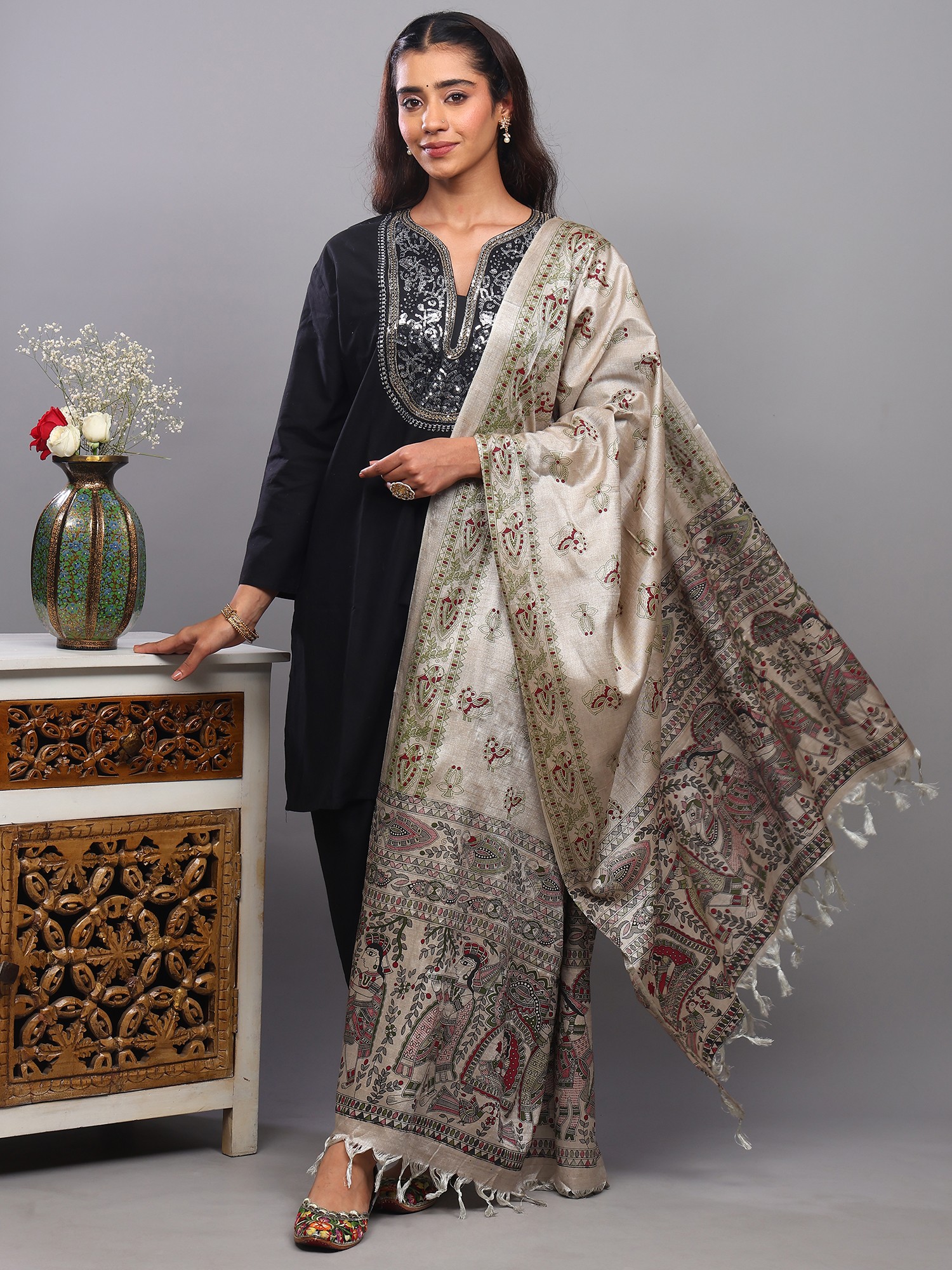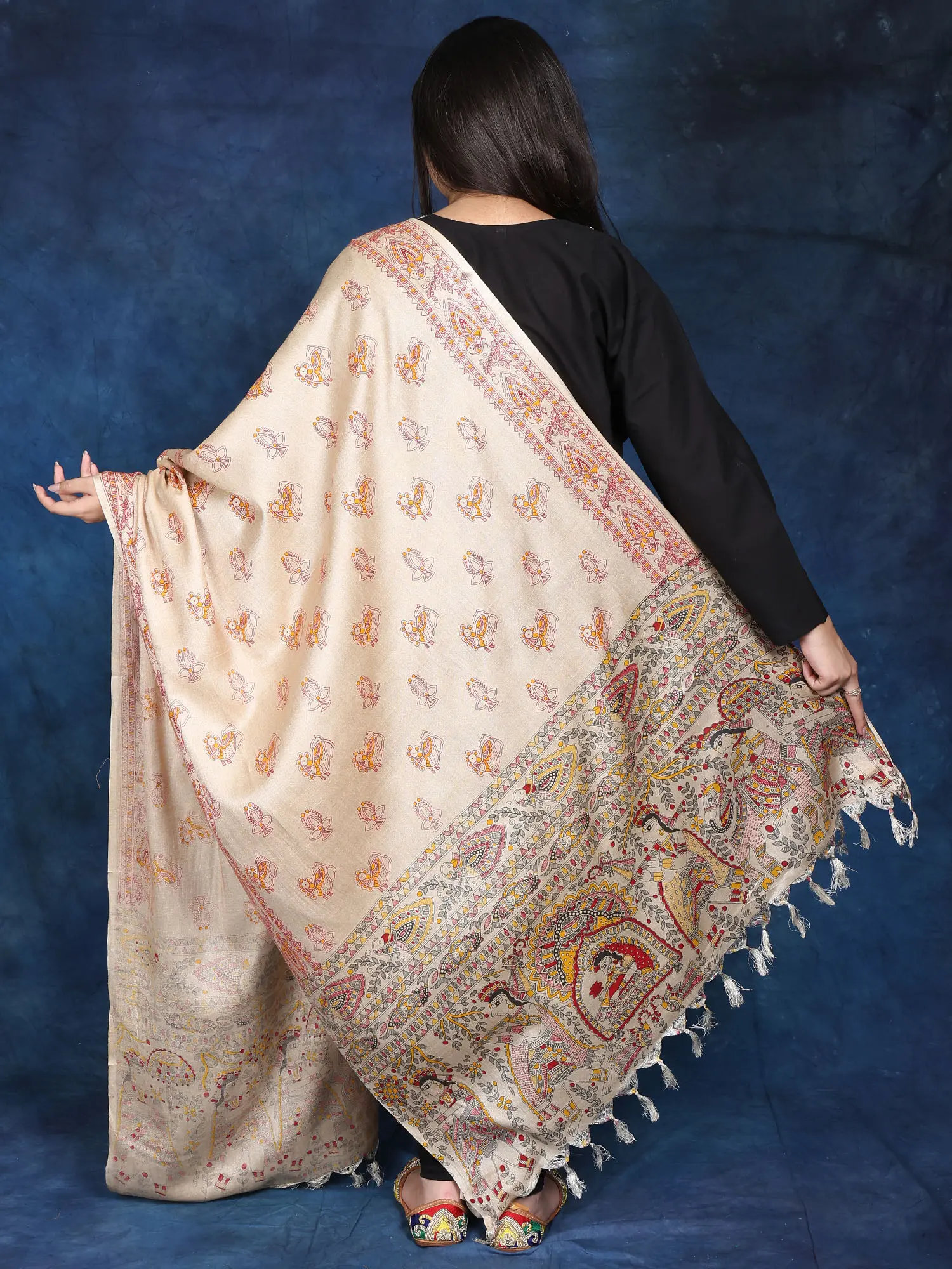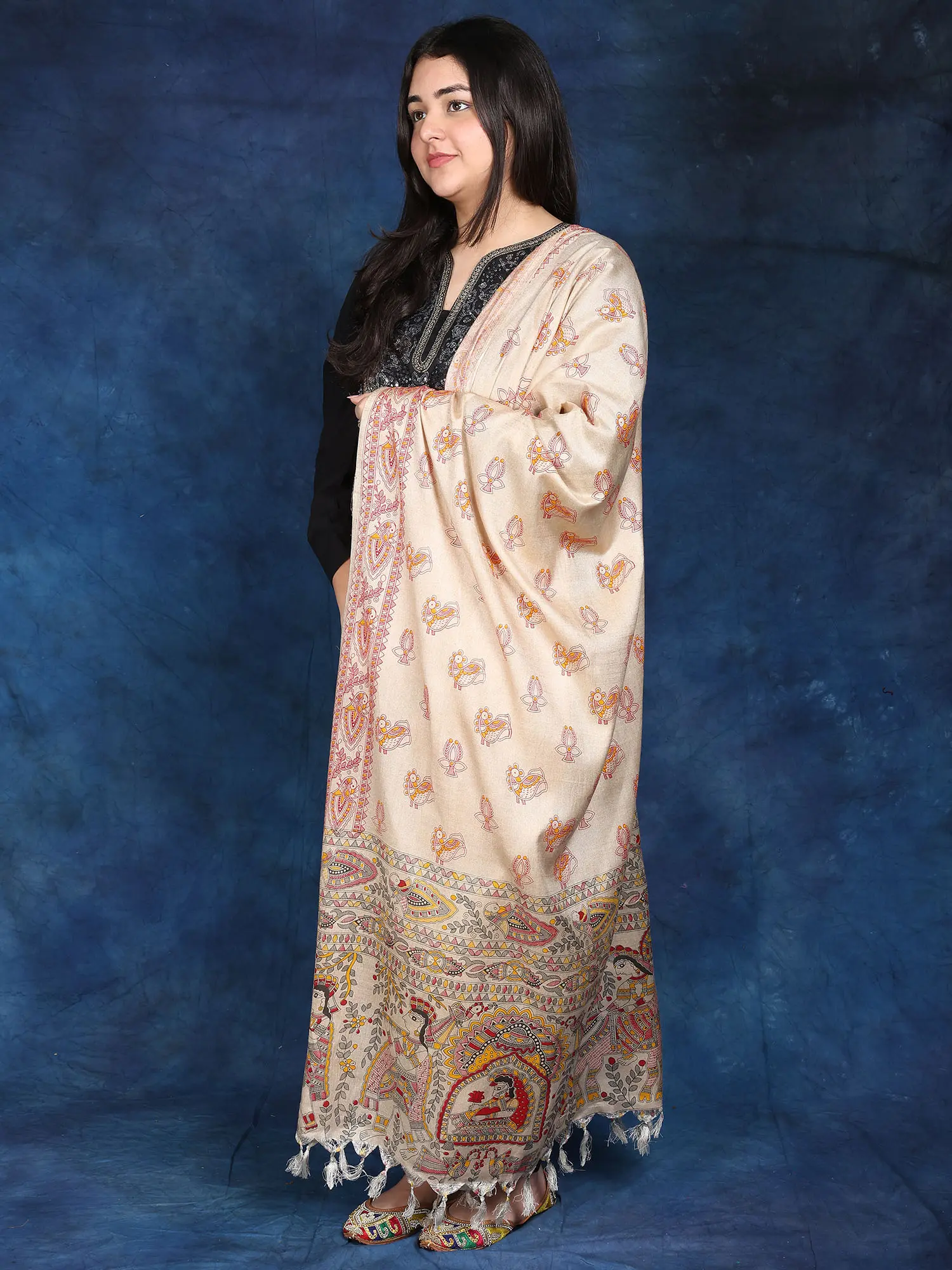 Hand-Painted Khadi Cotton Stole from Bihar with Madhubani Art