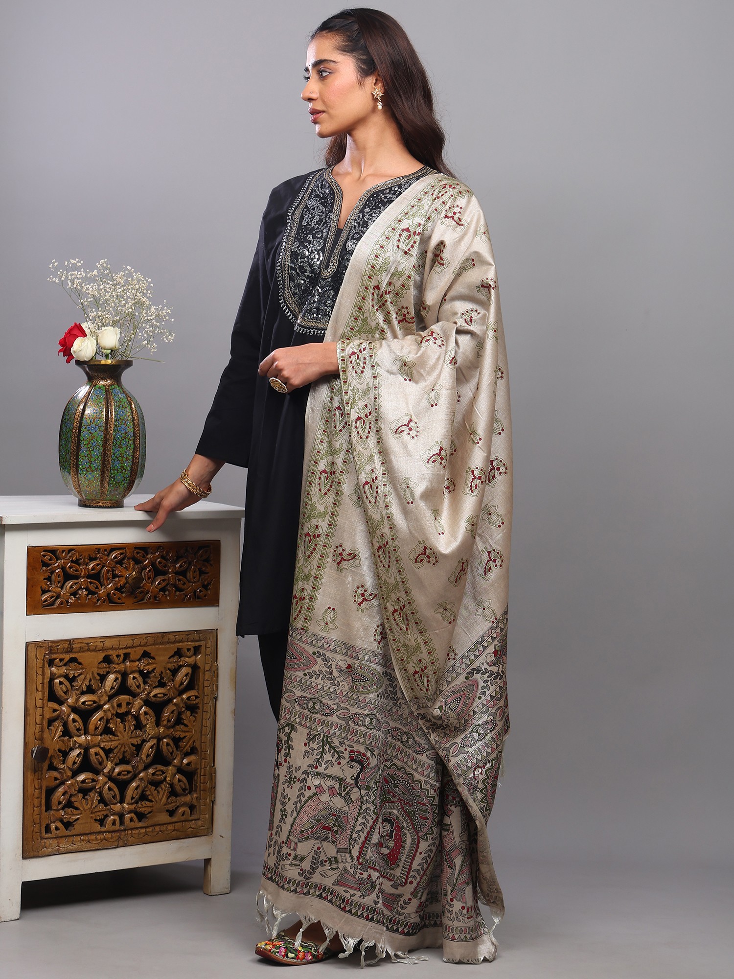 Khadi Beige Dupatta with Madhubani Art from Bihar