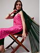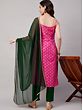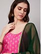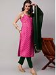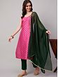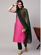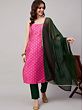 Get the classic appeal of traditional kurti for your next party appearance, with this magenta-pink kurta and pants set. The straight-cut kurta has a graceful feel, embellished with golden butis all over. The pants and the dupatta have a dark hue to complement the feminine pink of the kurta, with a golden border giving the dupatta a festive appeal.