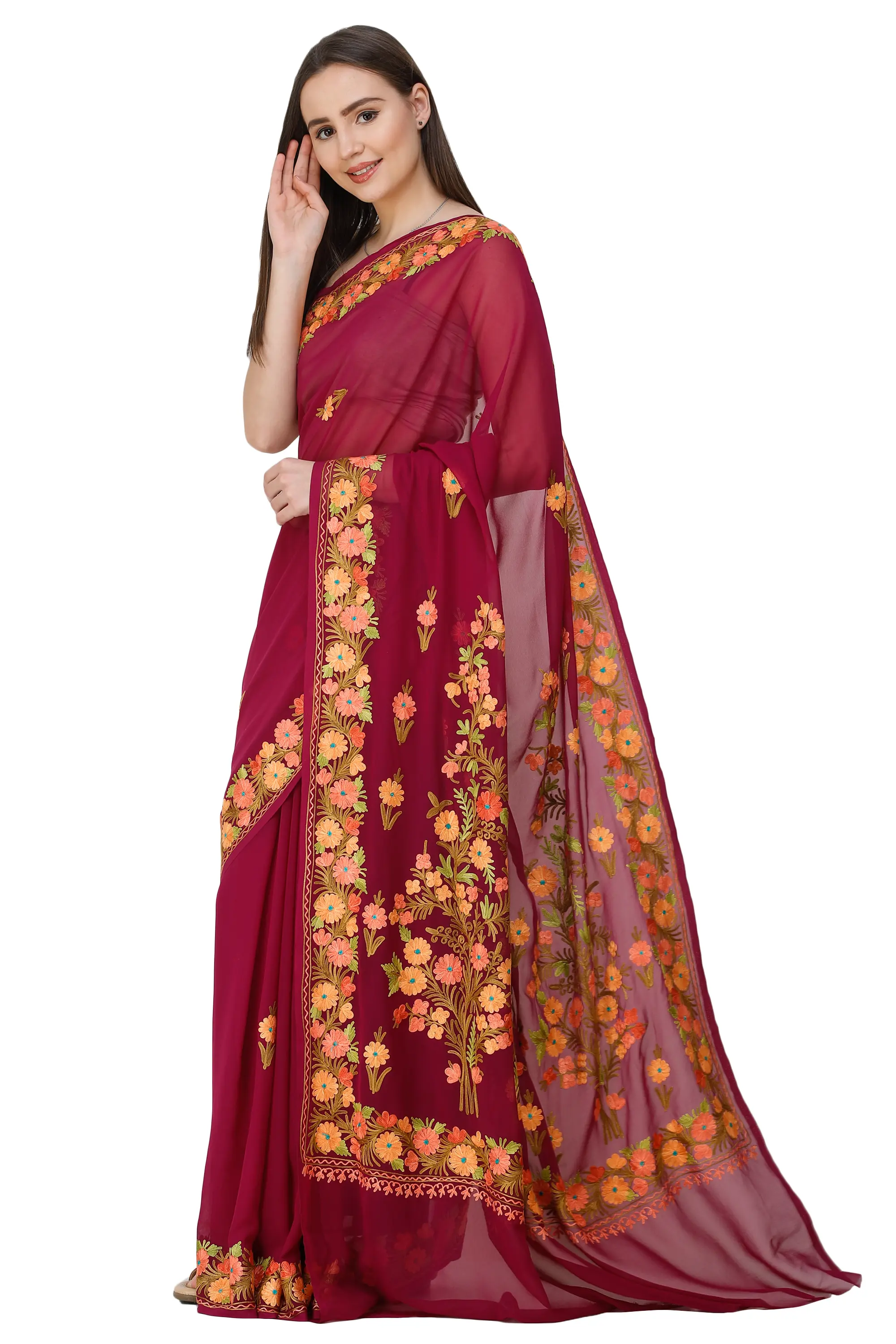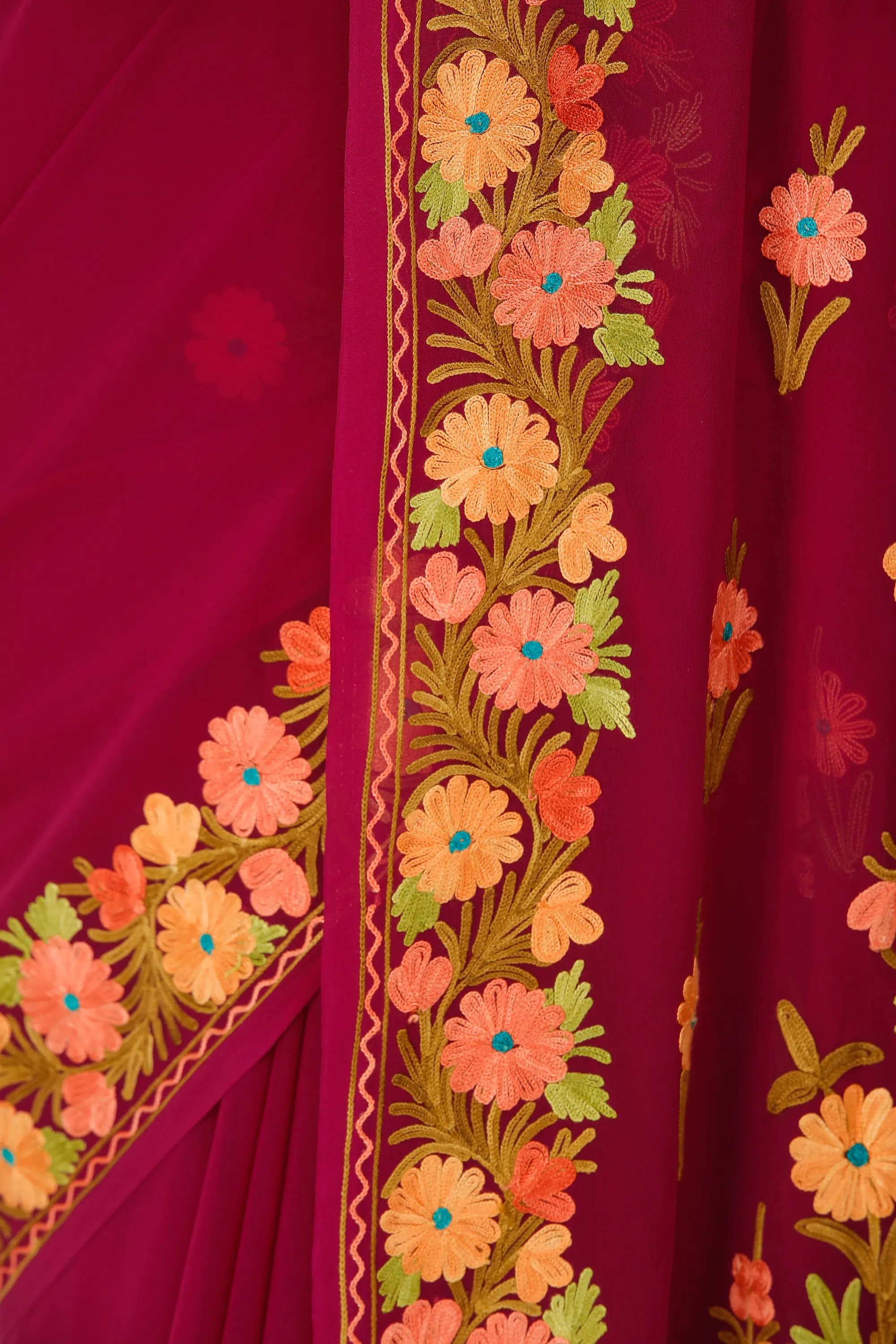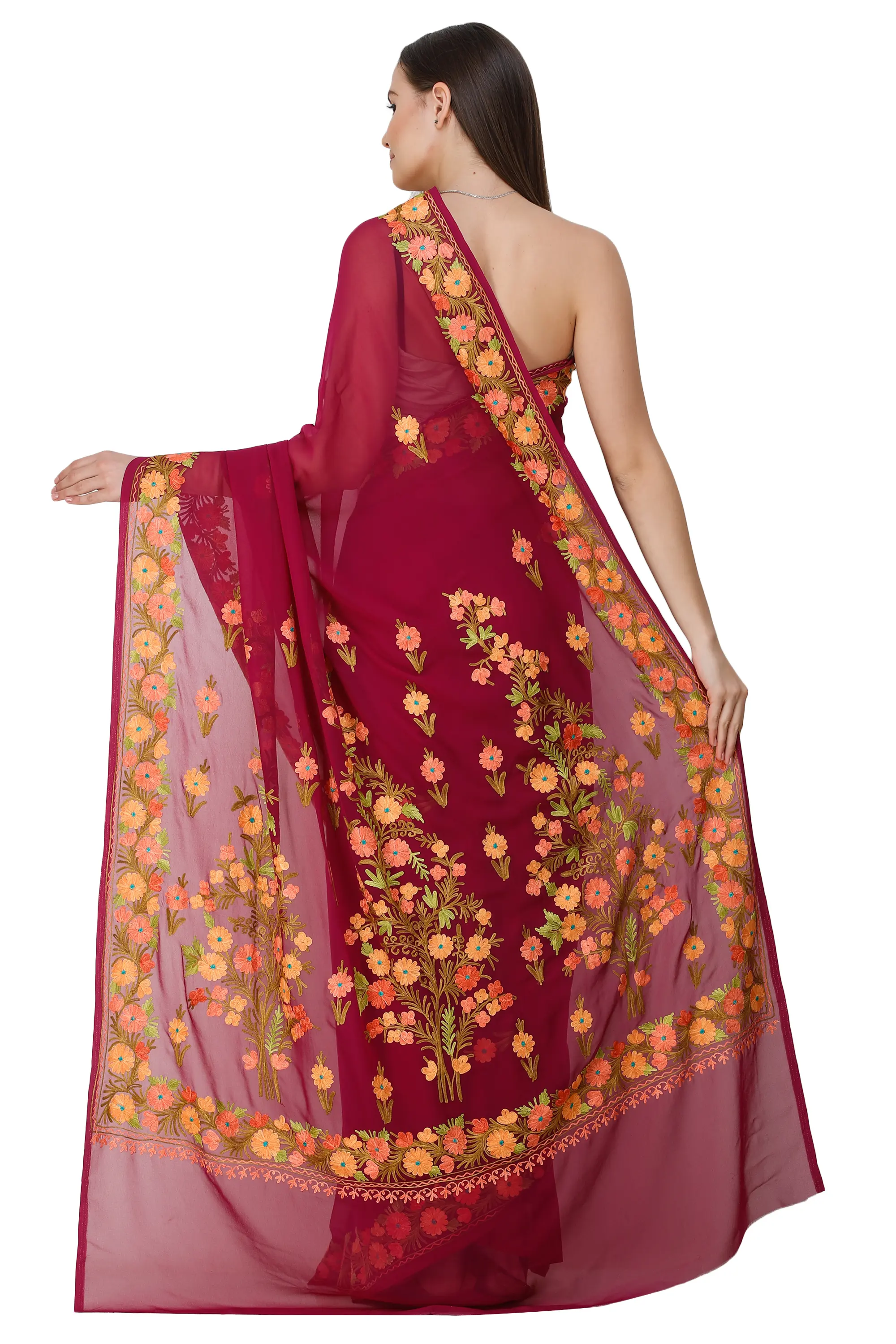 Georgette Saree with Chain Stitch Aari Embroidered Floral Border from Kashmir