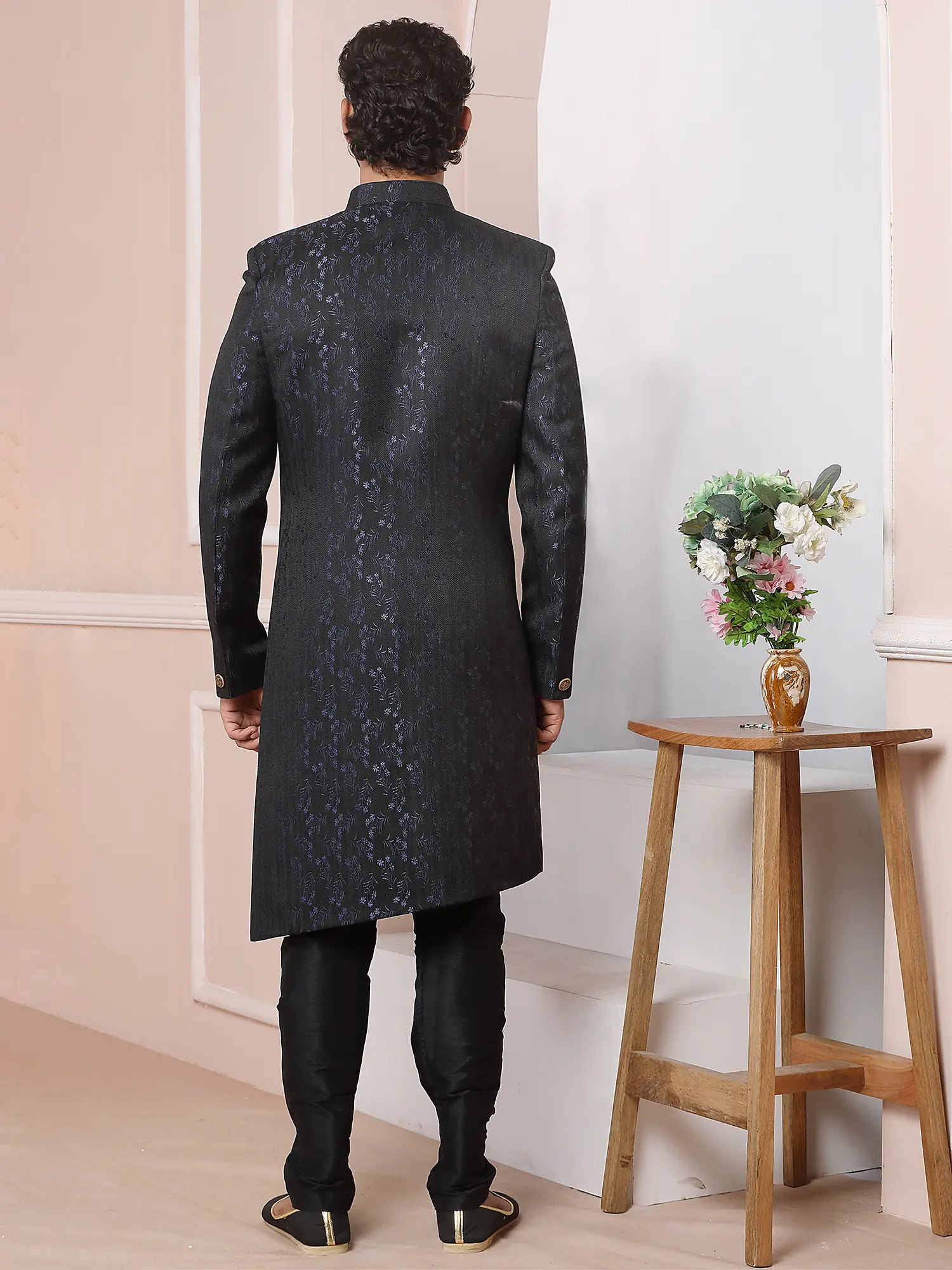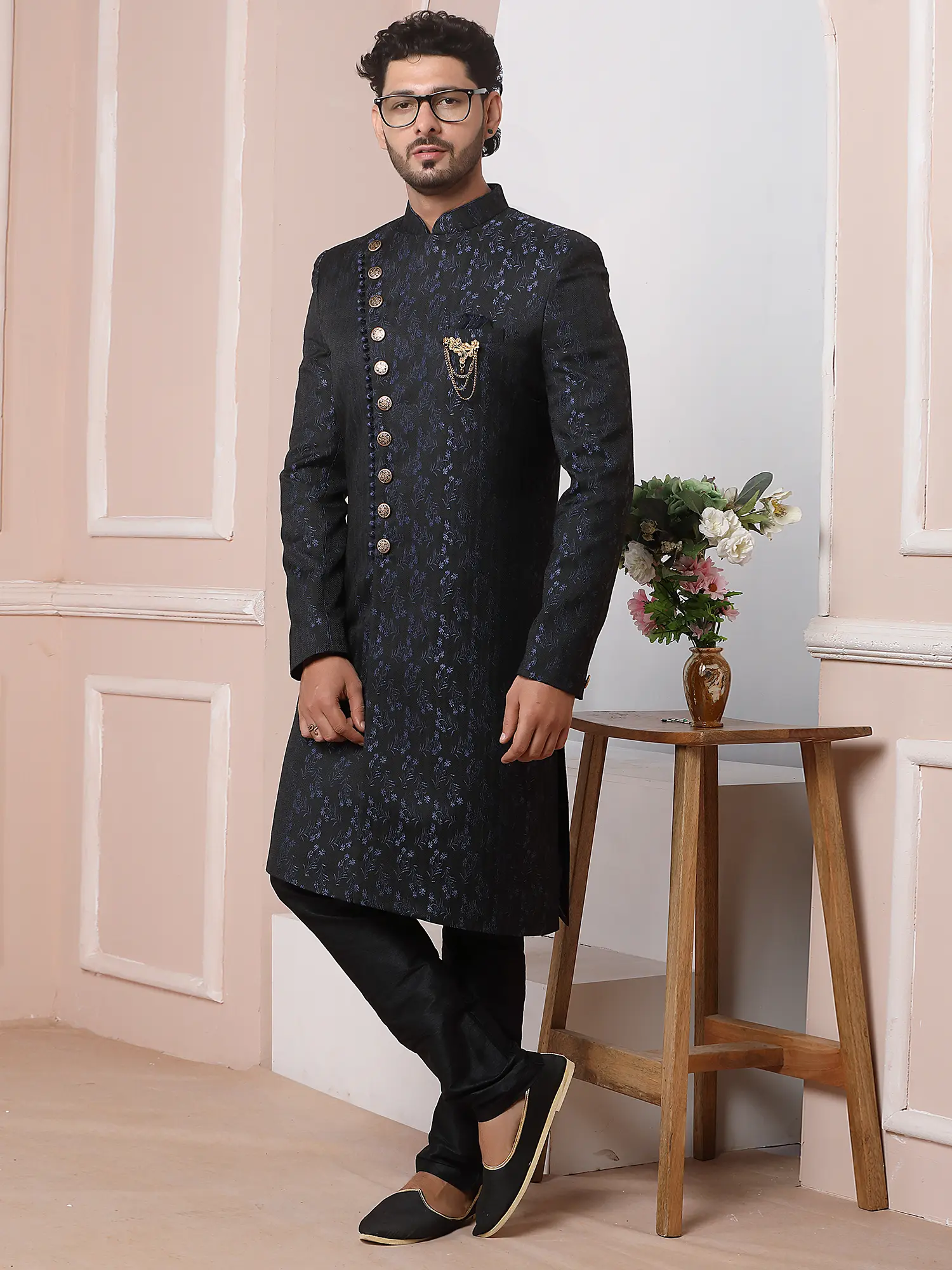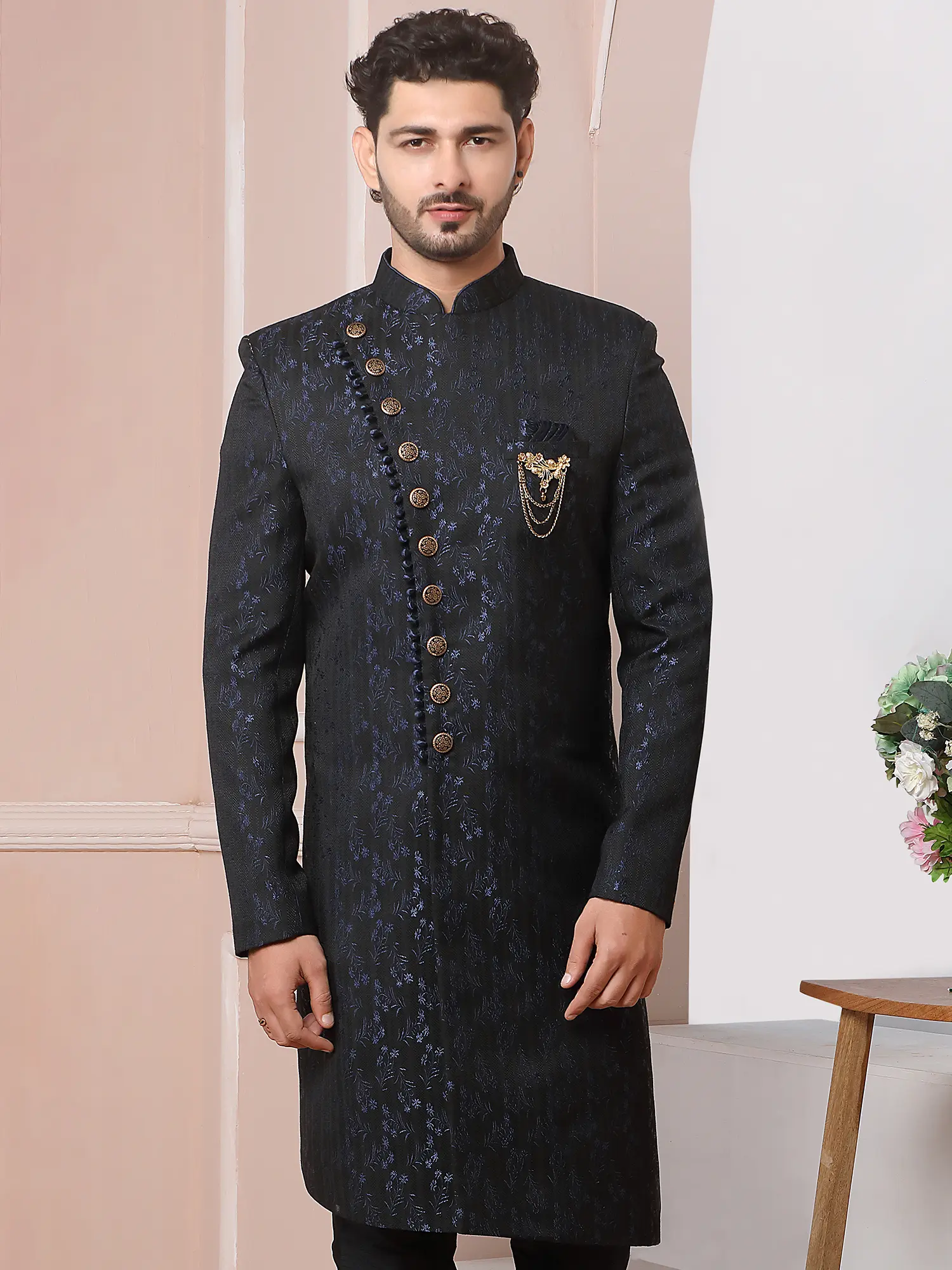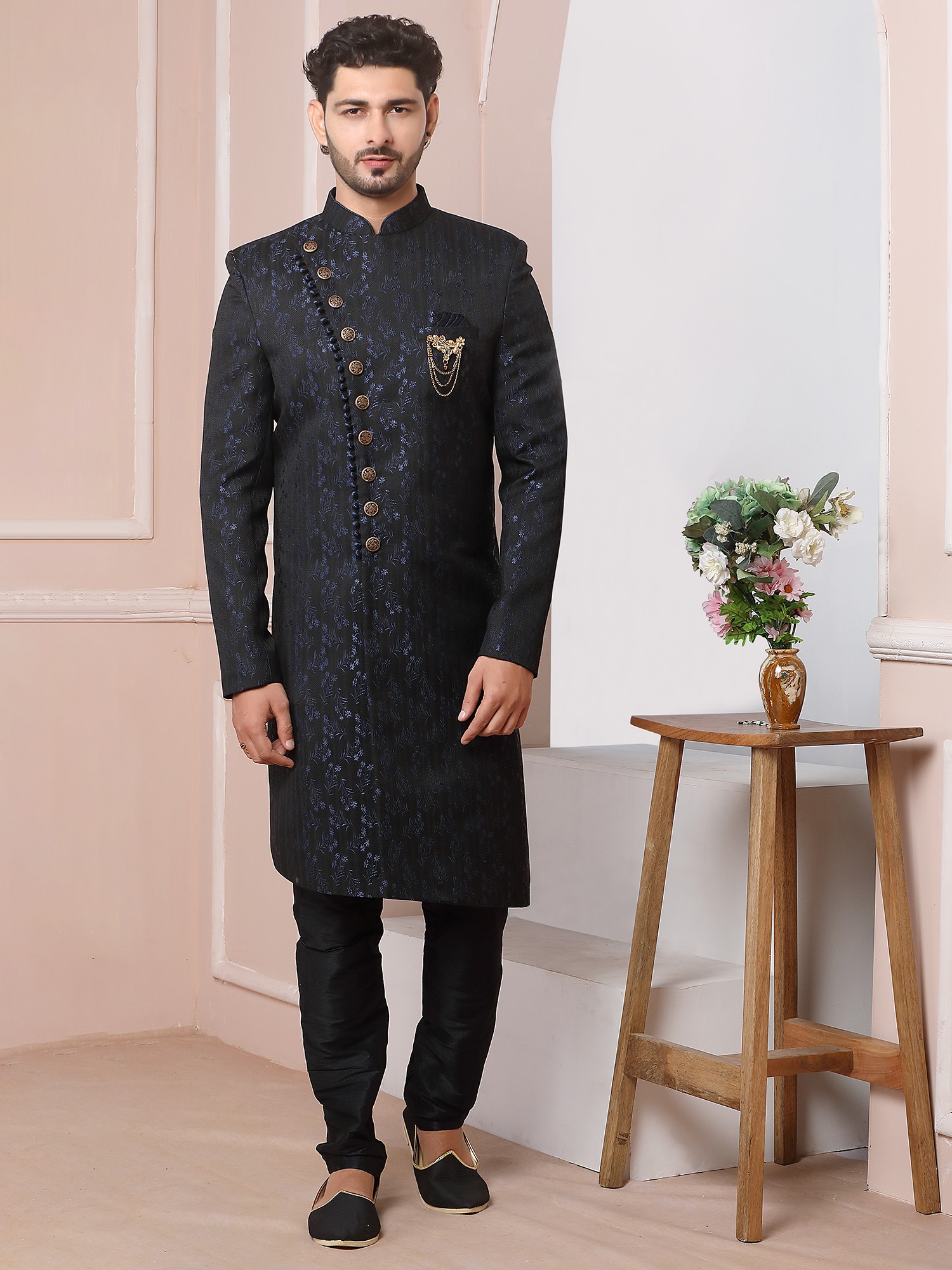 Elegant Jacquard Silk Indo Western Sherwani With Luxe Dupion Art Silk Aligarhi Pant For Wedding Sangeet Glam