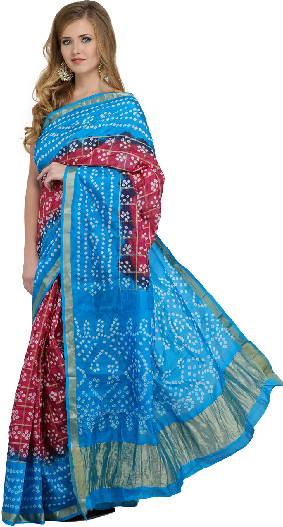 Dual-Shaded Georgette Bandhani Saree with Zari Woven Floral Jaal from Gujarat