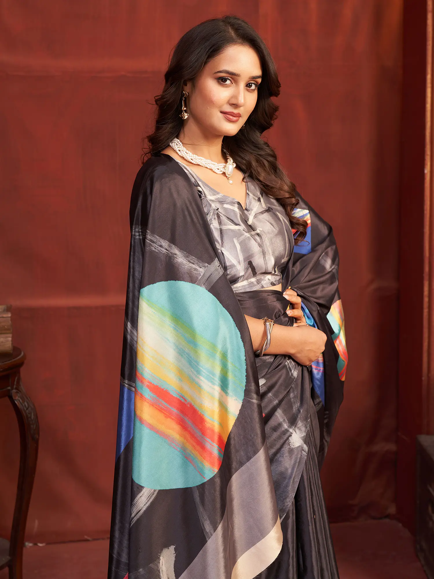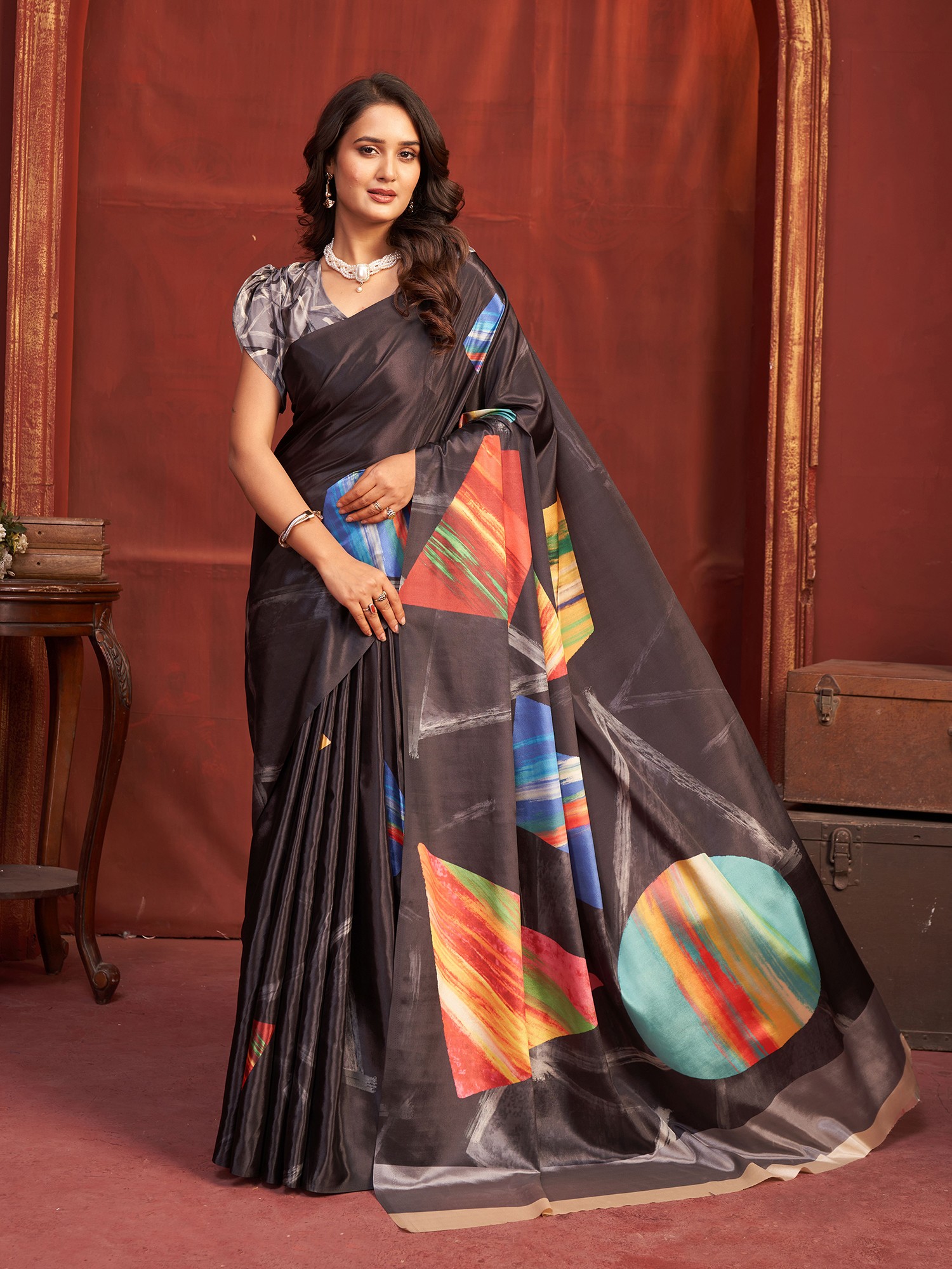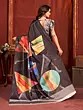 Malai Crepe Silk Saree Designer Printed Black Abstract Motifs Vibrant Contrast For Party Festive Reception Wear