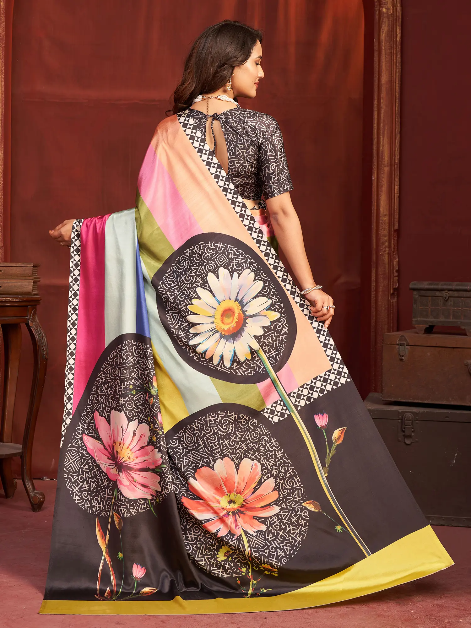The saree, a garment steeped in millennia of Indian tradition, is reimagined here with a fresh and audacious aesthetic. This design pays homage to the rich cultural heritage while embracing the spirit of innovation, making it a perfect choice for those who appreciate both legacy and contemporary style. It represents a sophisticated evolution of an age-old art form.