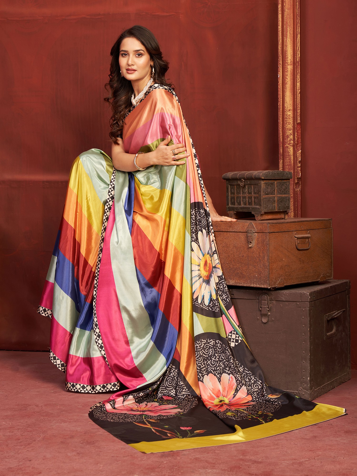 Moss Satin Patta Saree With Designer Printed Floral Pattern Perfect For Party Wear And Casual Ethnic Occasions