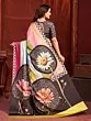 The visual narrative unfolds with striking pink lotus flowers blooming amidst a vibrant, multicolored rainbow-striped pattern. Contrasting geometric borders and abstract motifs add a contemporary edge, creating a harmonious blend of tradition and modern design. The interplay of bold colors and intricate details ensures that this piece is a true work of wearable art, designed to make you feel exceptionally radiant.