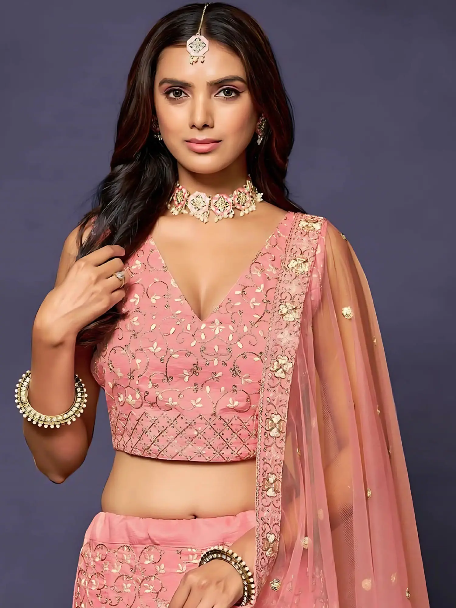 Light-Pink Soft Net Thread Embroidered Lehenga Choli with Sheer Dupatta
