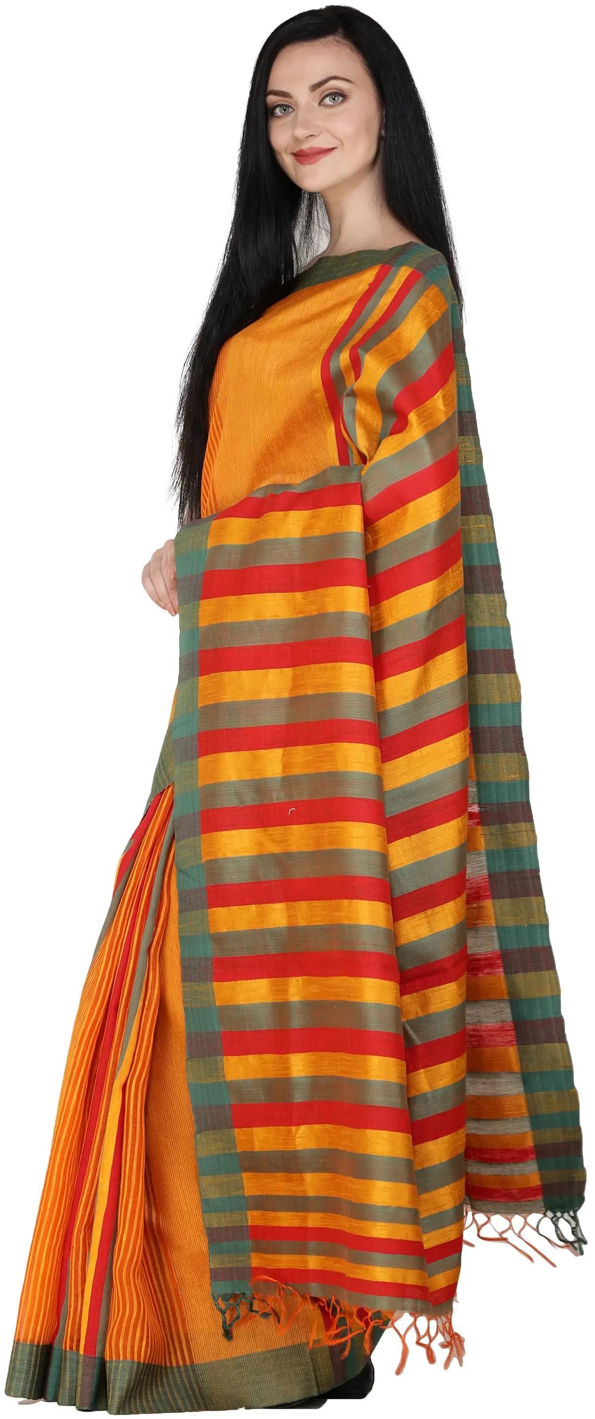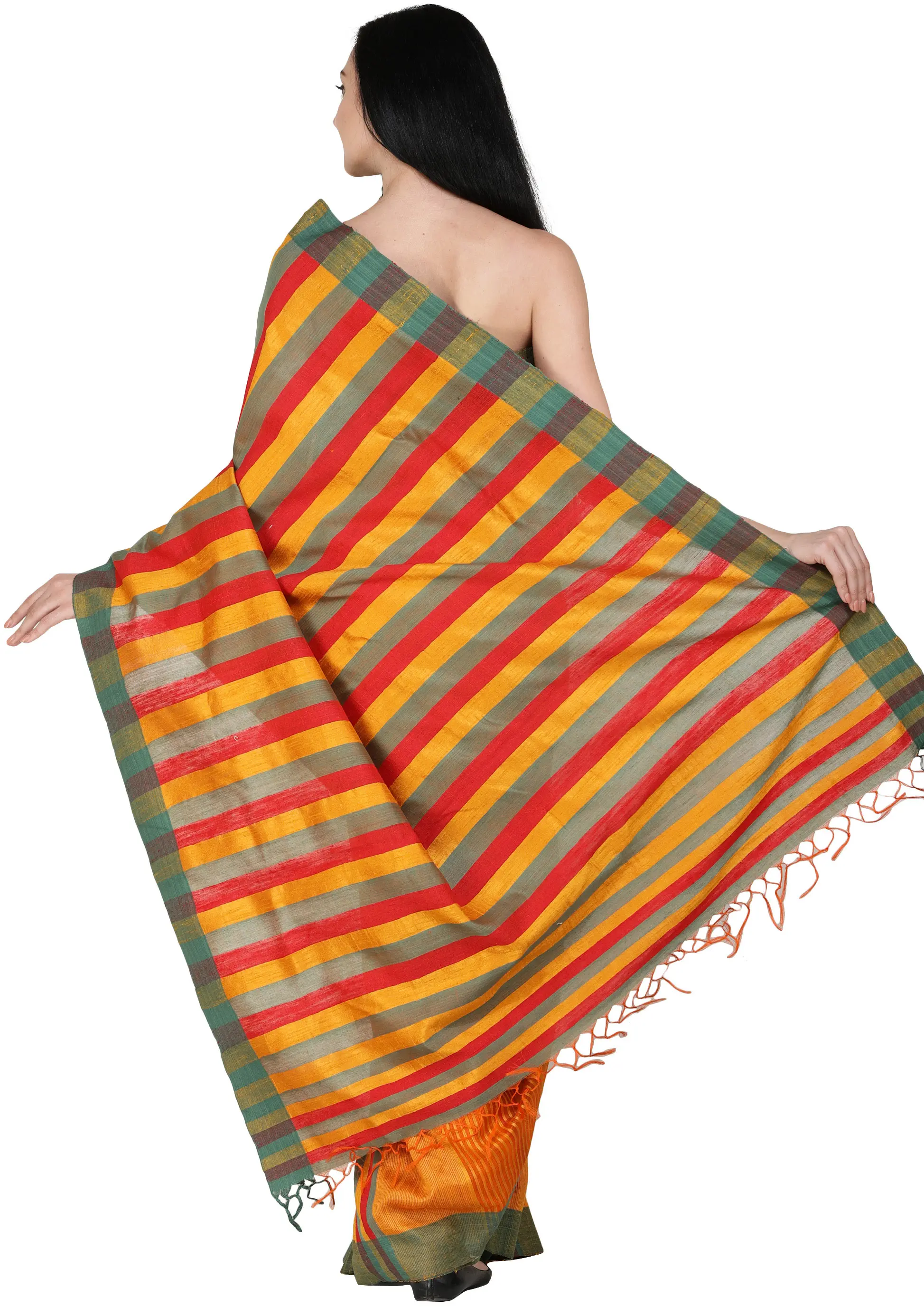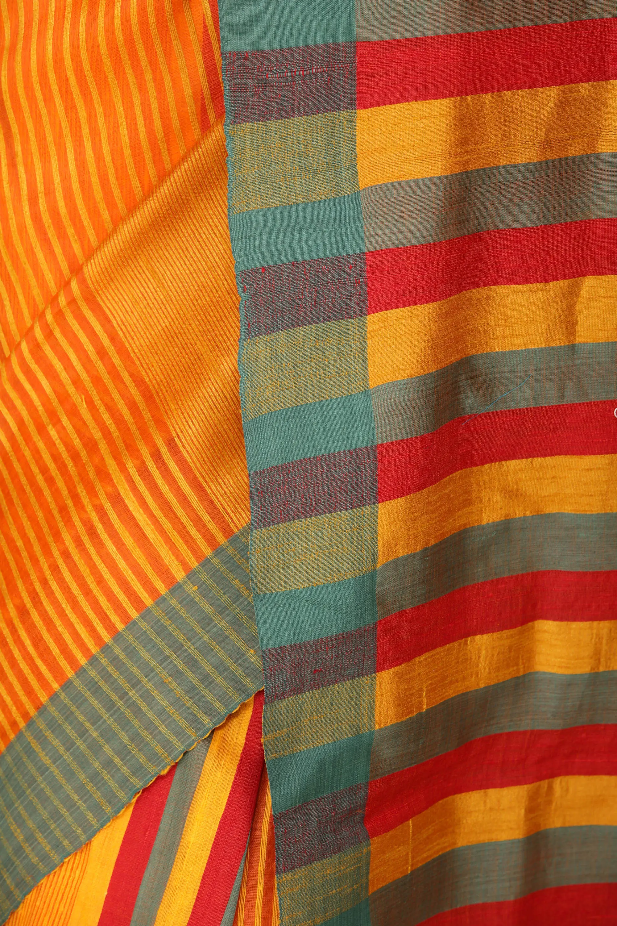 The Mandarin-Orange Kosa Sari from Bengal is a fiery spectacle of raw silk elegance. Its vibrant mandarin-orange hue steals the spotlight, radiating warmth and energy. Crafted from sumptuous raw silk, it boasts a rich feel that elevates its grandeur. The woven stripes on the pallu bring a graceful symmetry to the drape, adding depth and character. Splashes of green and red are like layers of vibrancy, infusing life into this exquisite saree. With every fold, it tells a tale of tradition and vivacity, making it a captivating choice for those who appreciate the fusion of boldness and sophistication in their attire.