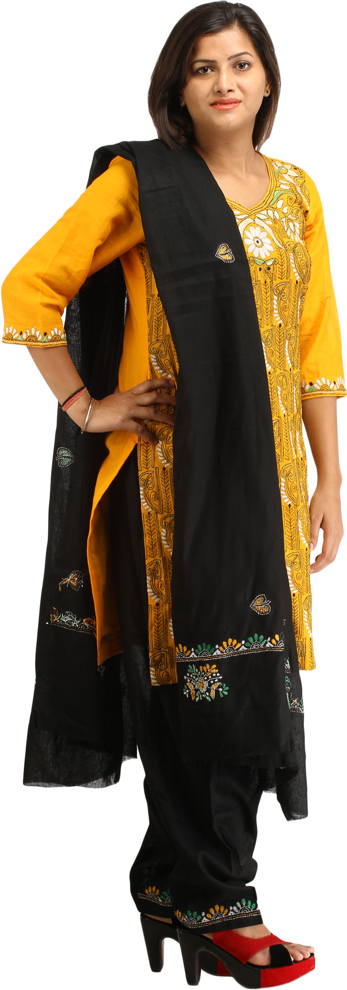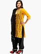 Marigold and Black Salwar Kameez Suit from Kolkata with Kantha-Embroidery by Hand