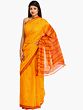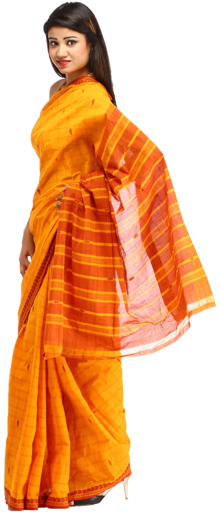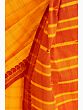 The entire expanse of the sari is adorned with delicate, woven checks, creating a subtle yet captivating texture. Scattered across this classic pattern are charming little paisley motifs, intricately woven in a complementary shade. These small embellishments add a touch of artisanal charm, showcasing the meticulous craftsmanship that has gone into creating this beautiful piece. The border of the sari features a striking maroon hue, contrasting beautifully with the marigold. This border is further enhanced with a traditional woven paisley pattern, a classic motif that speaks of heritage and auspiciousness. The pallu, a waterfall of vibrant orange and yellow stripes, offers a dynamic visual appeal, making it a true statement piece when draped.