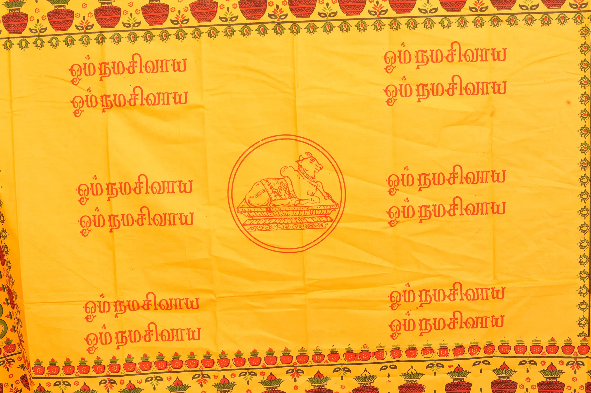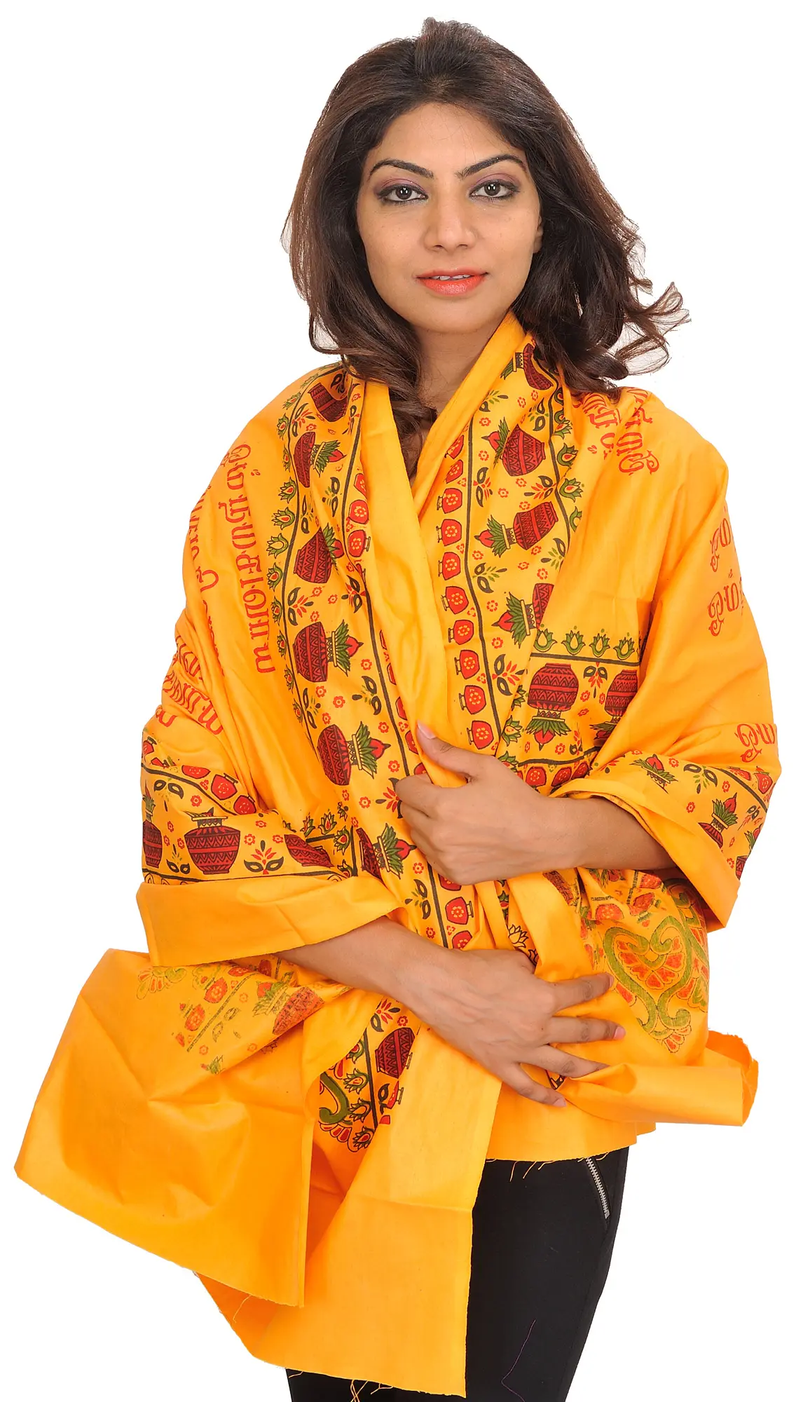 Marigold Om Shakti Prayer Shawl from Tamil Nadu with Printed Nandi and Auspicious Kalash on Border