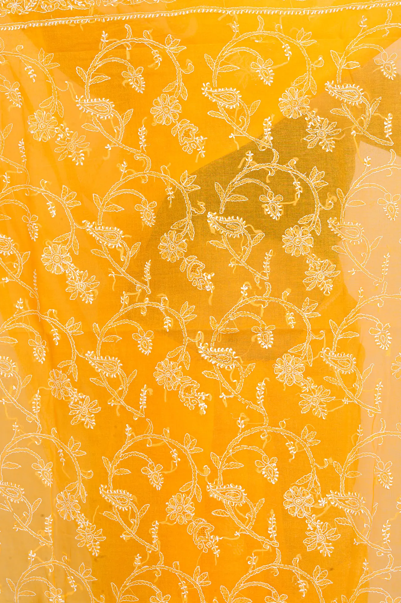 This exquisite sari comes with a blouse and underskirt, both expertly tailormade to your size, ensuring a perfect fit and a seamless look. This thoughtful detail saves you the hassle of custom tailoring, allowing you to enjoy the beauty of this handcrafted piece right away. Whether you are seeking to add a touch of traditional Indian artistry to your collection or searching for a standout piece for a special event, this marigold cotton sari with Chikan embroidery is a captivating choice that blends heritage, craftsmanship, and effortless style.