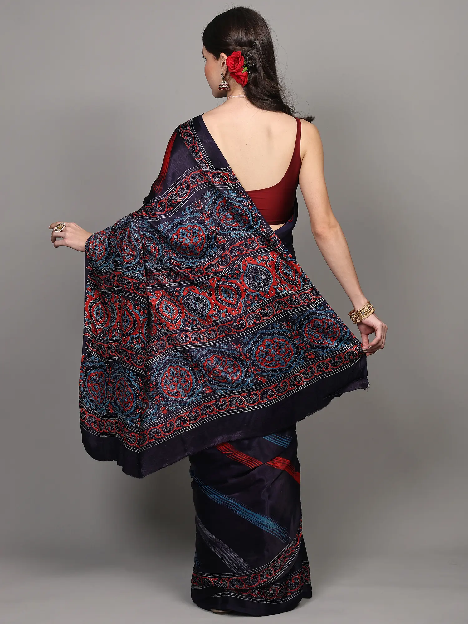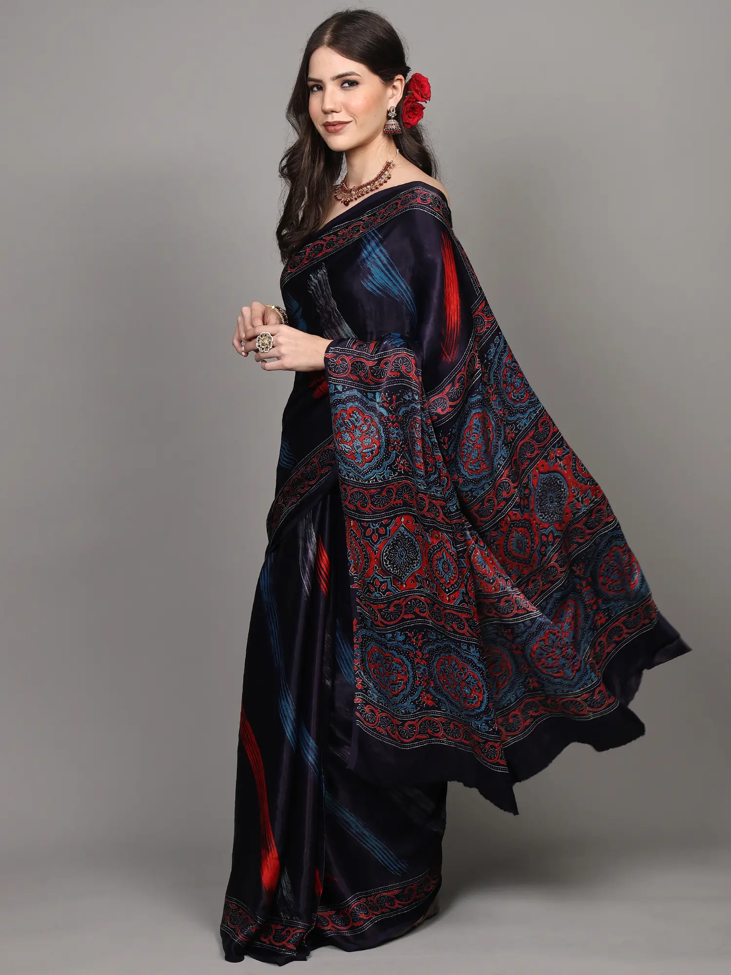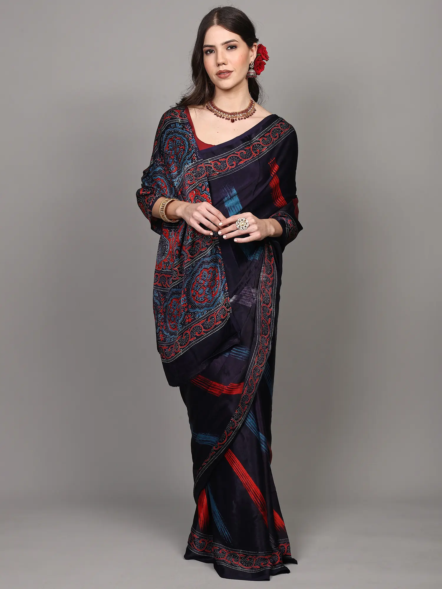 Drape yourself in the luxurious allure of this exquisite Modal Silk saree, a true masterpiece originating from the heart of Madhya Pradesh. The deep, captivating maritime blue serves as a canvas for a dynamic and artistic print. Broad strokes of vibrant red and electric blue, reminiscent of brushstrokes on a canvas, cascade across the fabric, adding a contemporary edge to this traditional attire. These bold lines are artfully interspersed, creating a sense of movement and depth that is both eye-catching and sophisticated.