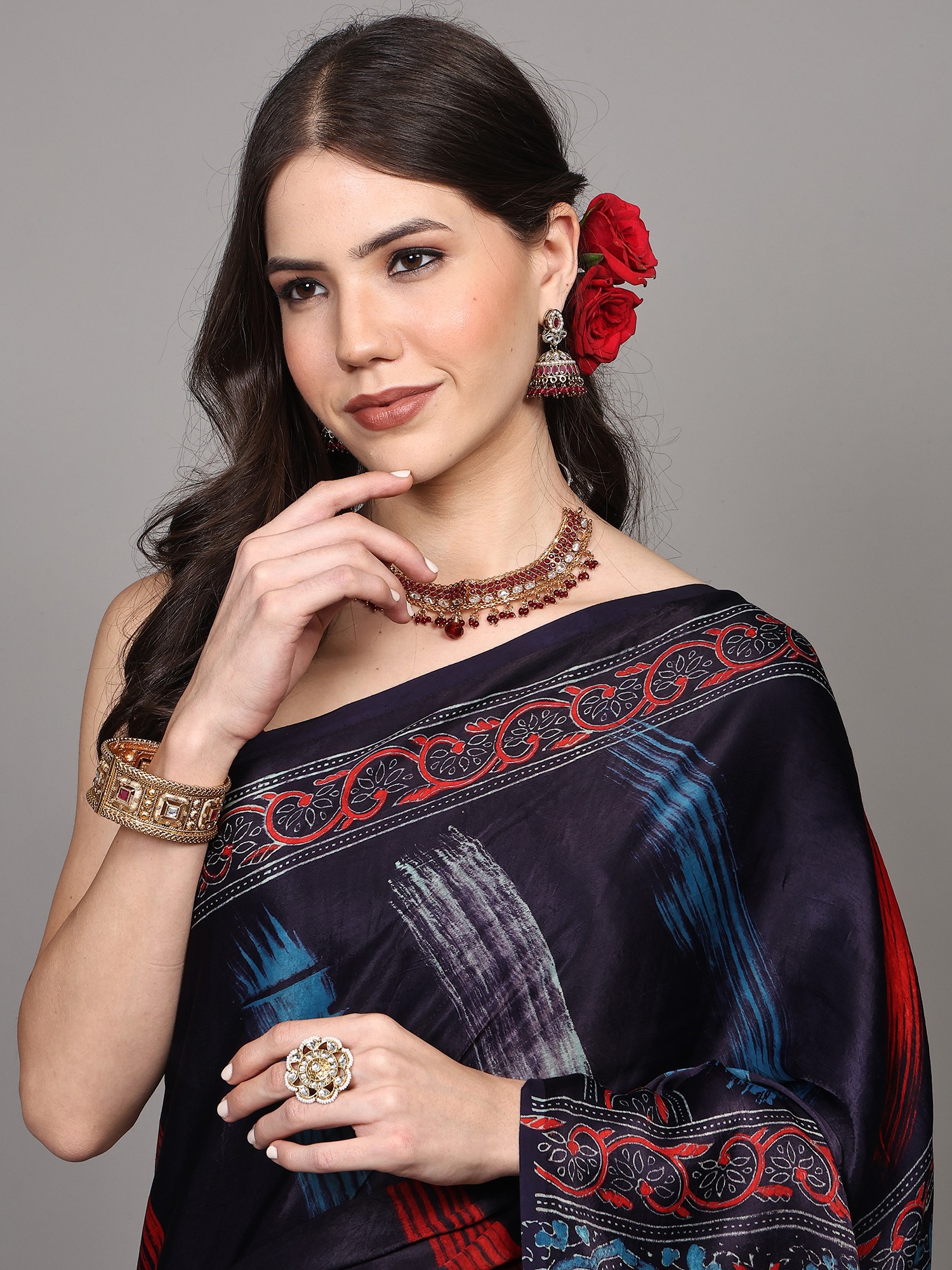 Crafted from premium Modal Silk, this saree offers a unique blend of silk's lustrous sheen and cotton's breathable comfort. Modal silk is renowned for its incredibly soft texture, smooth drape, and subtle sheen, making it a joy to wear. It drapes beautifully, accentuating the wearer's silhouette with a graceful flow. The fabric's natural elegance ensures that this saree is not only a visual delight but also a pleasure to the touch, perfect for extended wear at any special occasion.