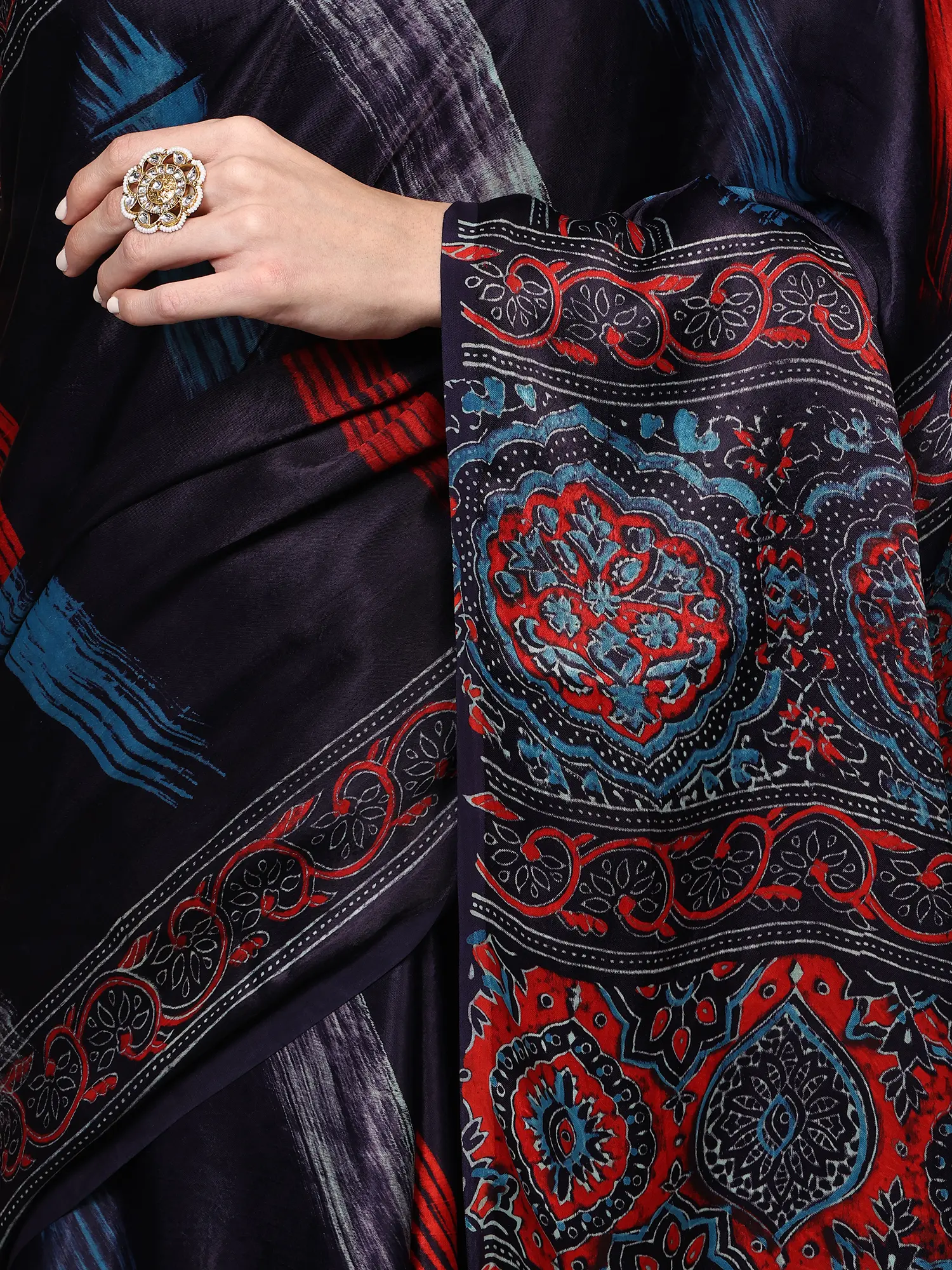 This saree is a versatile choice, effortlessly transitioning from festive celebrations to elegant evening events. Its unique print and stunning border make it a statement piece that will surely turn heads. Pair it with statement jewelry and traditional footwear for a classic look, or embrace a more modern aesthetic with contemporary accessories. The inherent beauty of the Modal Silk and the captivating design ensure you will exude confidence and charm with every drape. This saree is more than just an outfit; it's an heirloom, a piece of art, and a celebration of Indian craftsmanship.