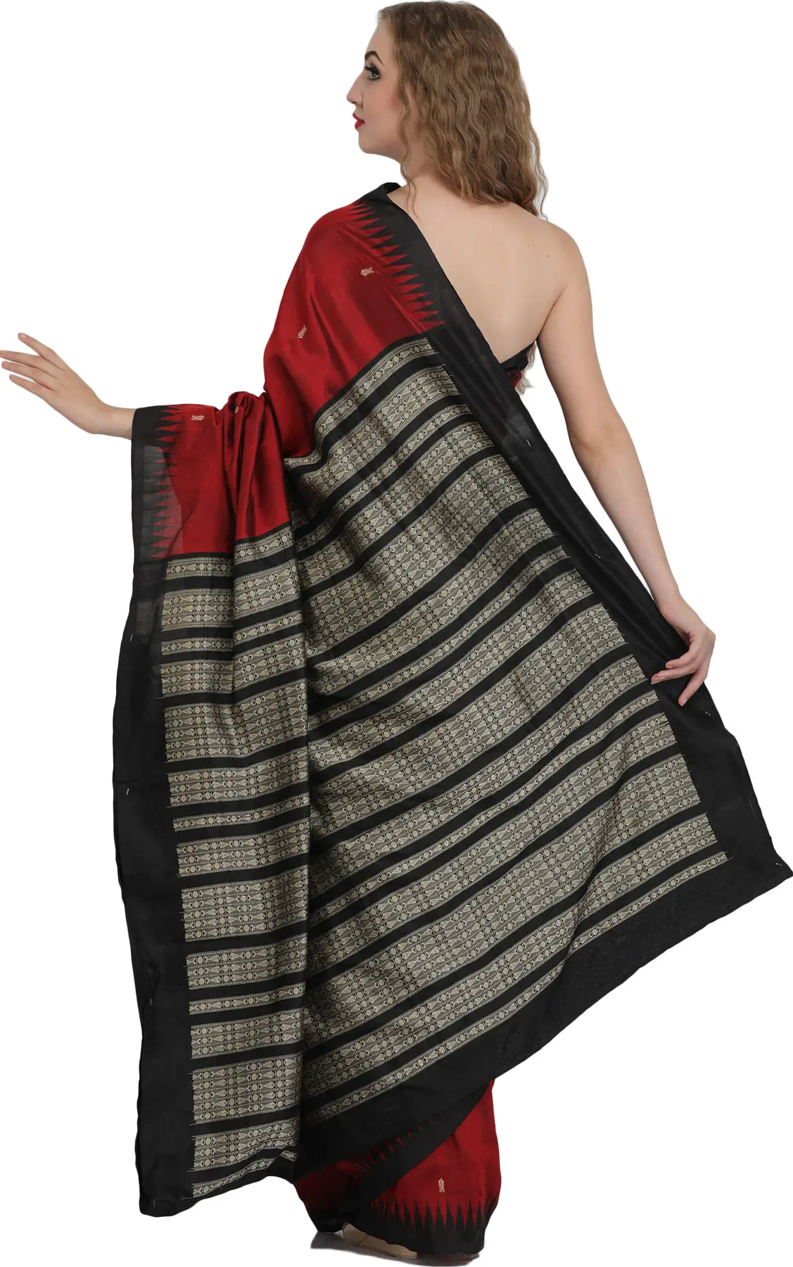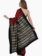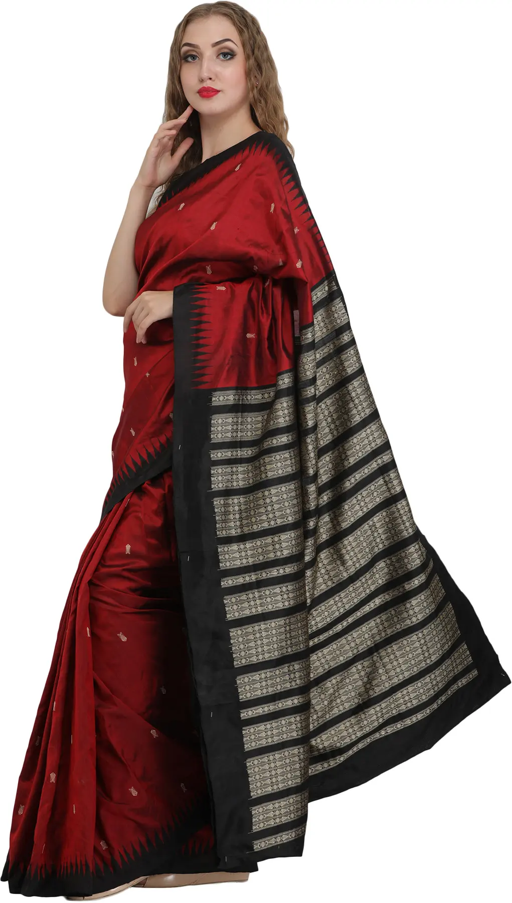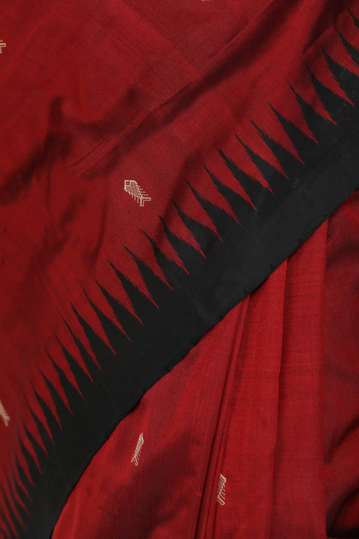 The beauty of this sari lies in its subtle yet captivating design. Scattered across the rich maroon expanse are delicate, intricately woven motifs resembling fishes, a symbol often associated with prosperity and abundance. These small, artisanal details add a touch of understated charm and visual interest, hinting at the deeper cultural significance embedded within the fabric. The contrast provided by the bold black border is striking, creating a sophisticated frame that enhances the overall aesthetic. This border is further adorned with a captivating temple motif, adding a touch of architectural grandeur and spiritual resonance. The meticulous placement and execution of these woven elements showcase the weaver's mastery and dedication to their craft.
