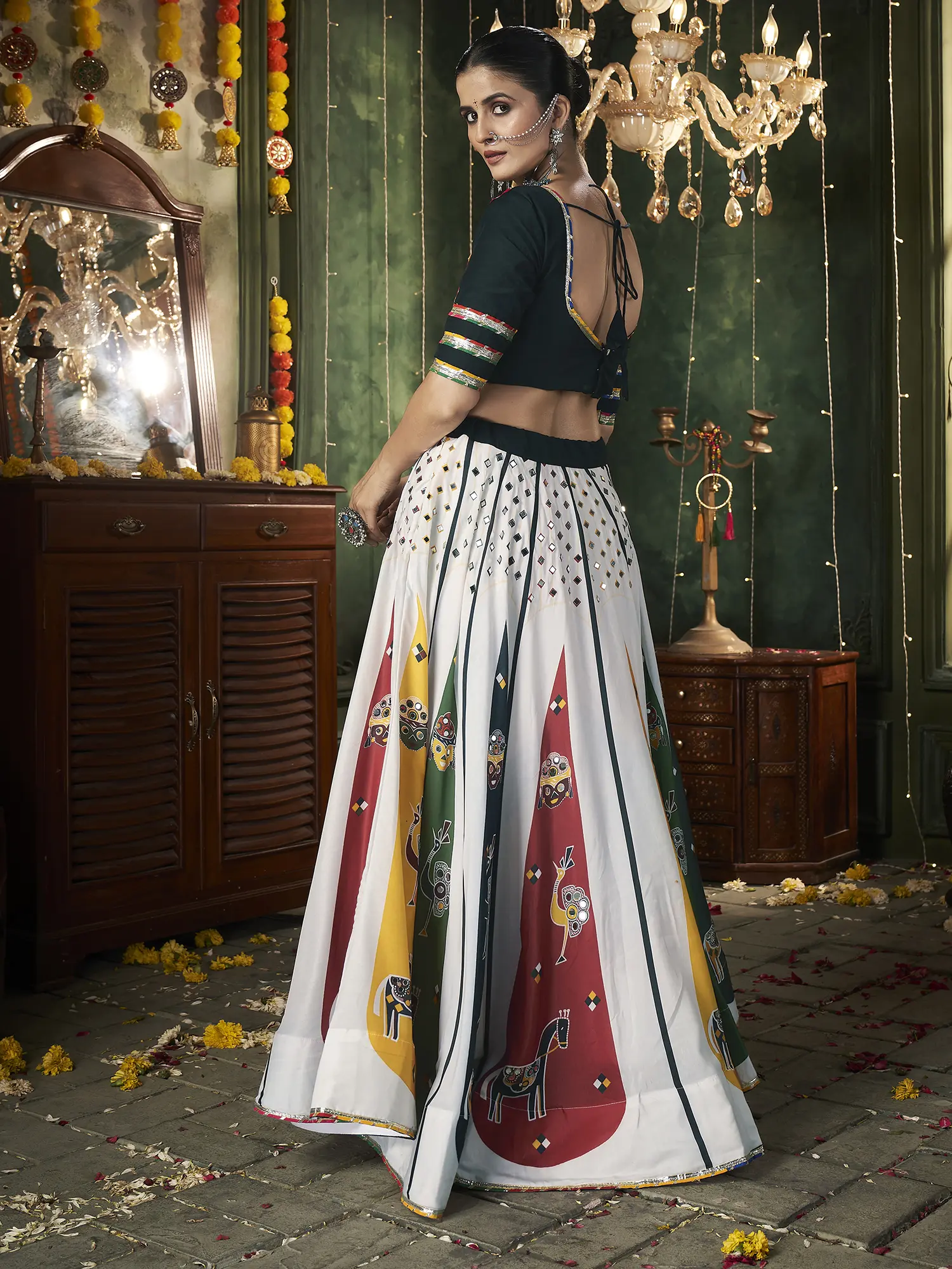 The star of this ensemble is undoubtedly the lehenga, a masterpiece of artistic design. The base of pure white muslin cotton serves as a canvas for a playful yet sophisticated animal print that adorns each panel. These prints, rendered in a palette of earthy tones including deep blacks, vibrant yellows, rich reds, and forest greens, showcase stylized depictions of horses and other charming creatures. The placement of these prints, spread across the voluminous flare of the lehenga, creates a dynamic and eye-catching effect as you move. The intricate detailing within each animal motif, along with scattered geometric patterns, adds layers of visual interest. A delicate border with shimmering embellishments completes the lower edge of the lehenga, catching the light with every turn. ––––––––––––––––––––