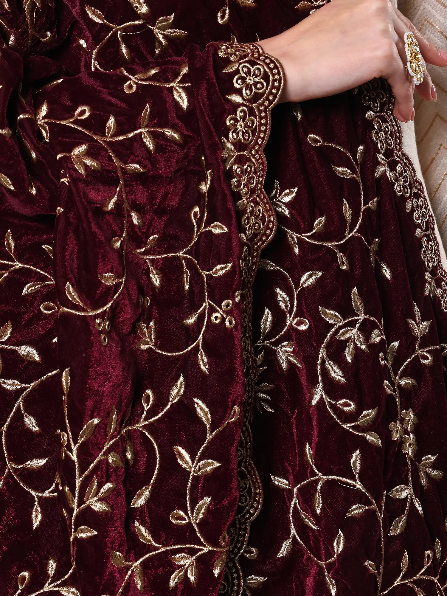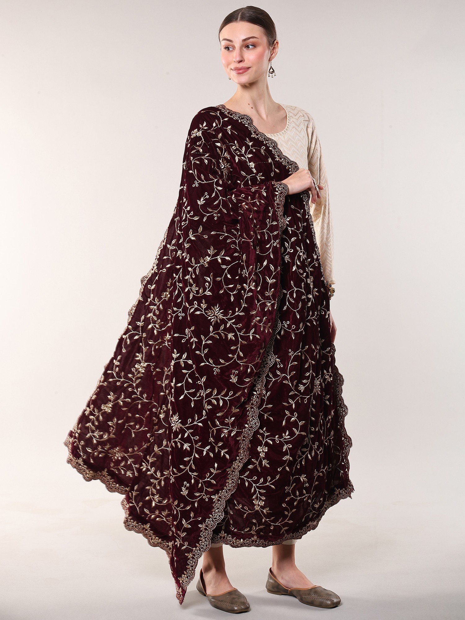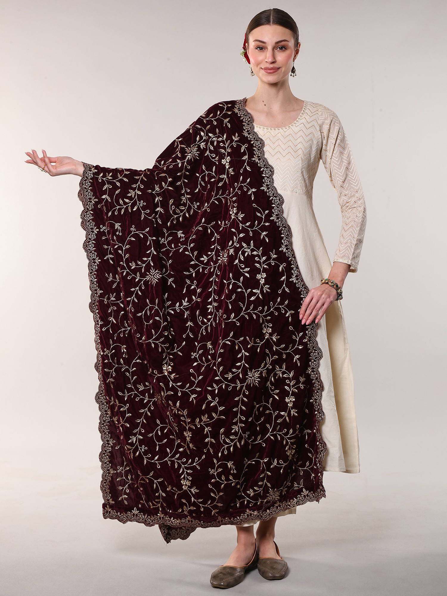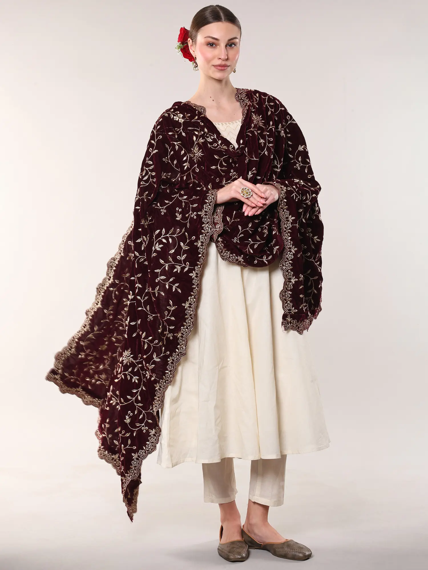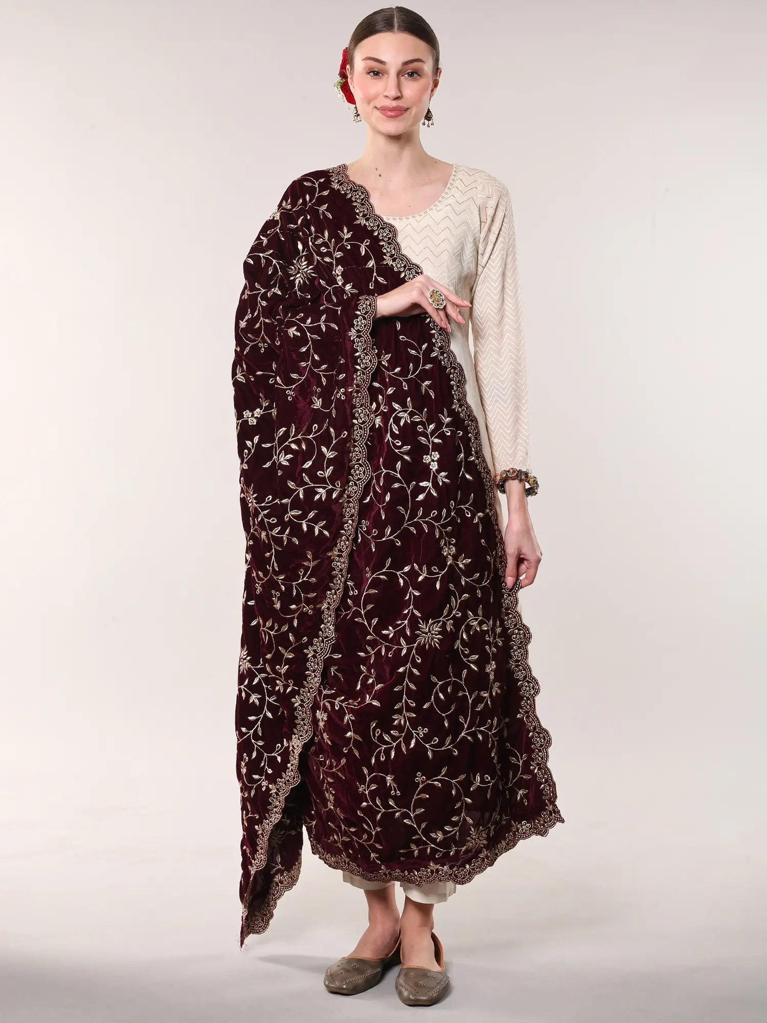 Maroon-Banner Velvet Dupatta with Zari Embroidered Floral Leaves Vine and Scalloped Border