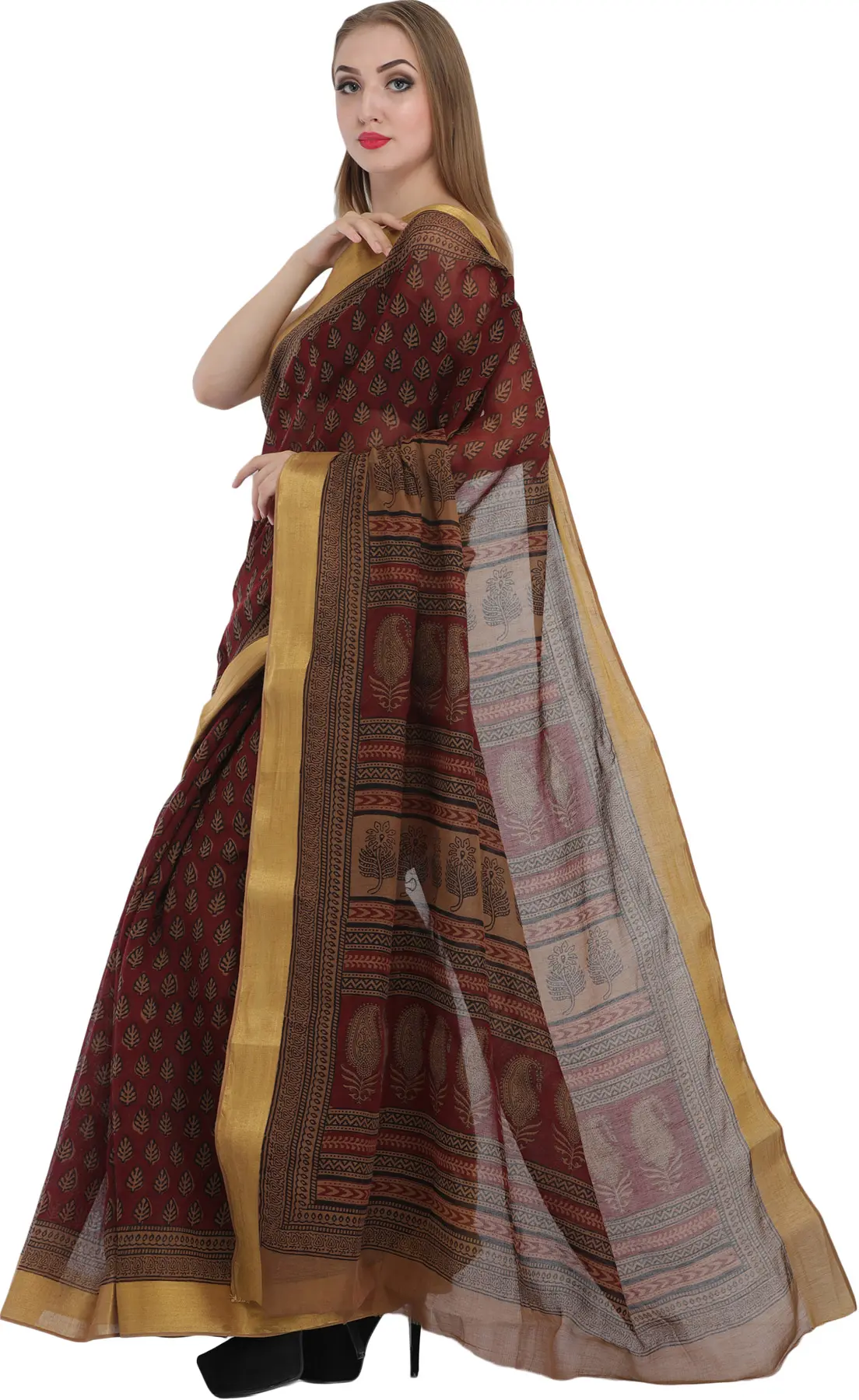 The sari is adorned with a striking golden border that elegantly frames the entire garment. This lustrous border, interwoven with fine golden threads, adds a touch of opulence and sophistication, catching the light beautifully with every movement. Complementing the main body of the sari, the pallu (the decorative end of the sari) showcases a more elaborate block-printed design, incorporating geometric patterns and stylized motifs that create a captivating visual narrative. The combination of the rich maroon, the subtle leaf prints, and the radiant golden border results in a sari that is both traditional and contemporary, exuding an aura of timeless charm and understated luxury. ––––––––––––––––––––