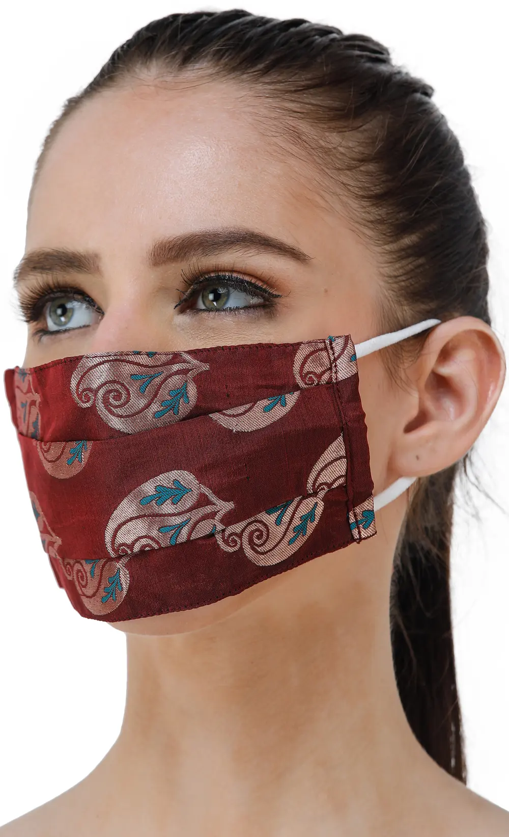 Made with utmost care, this mask boasts intricate paisleys woven in mesmerizing circular bootis, epitomizing the rich heritage of Banarasi artsitry. Drenched in the regal hue of maroon, its two-ply design ensures both style and safety. Fashioned from pure silk, this mask whispers luxury against your skin, offering a cocoon of comfort.