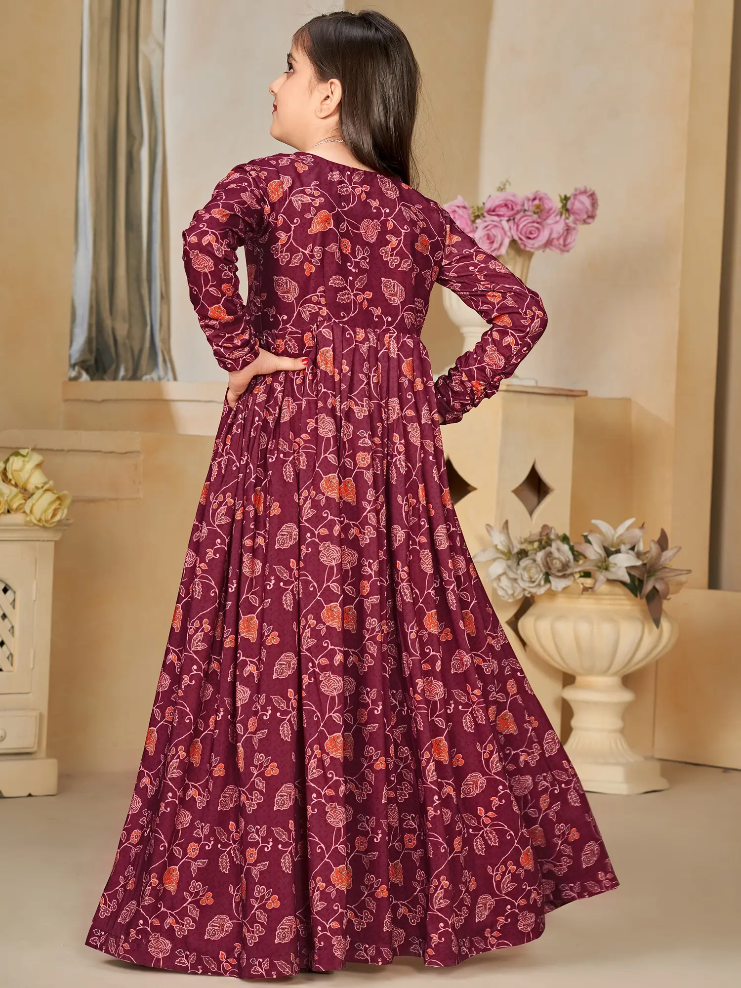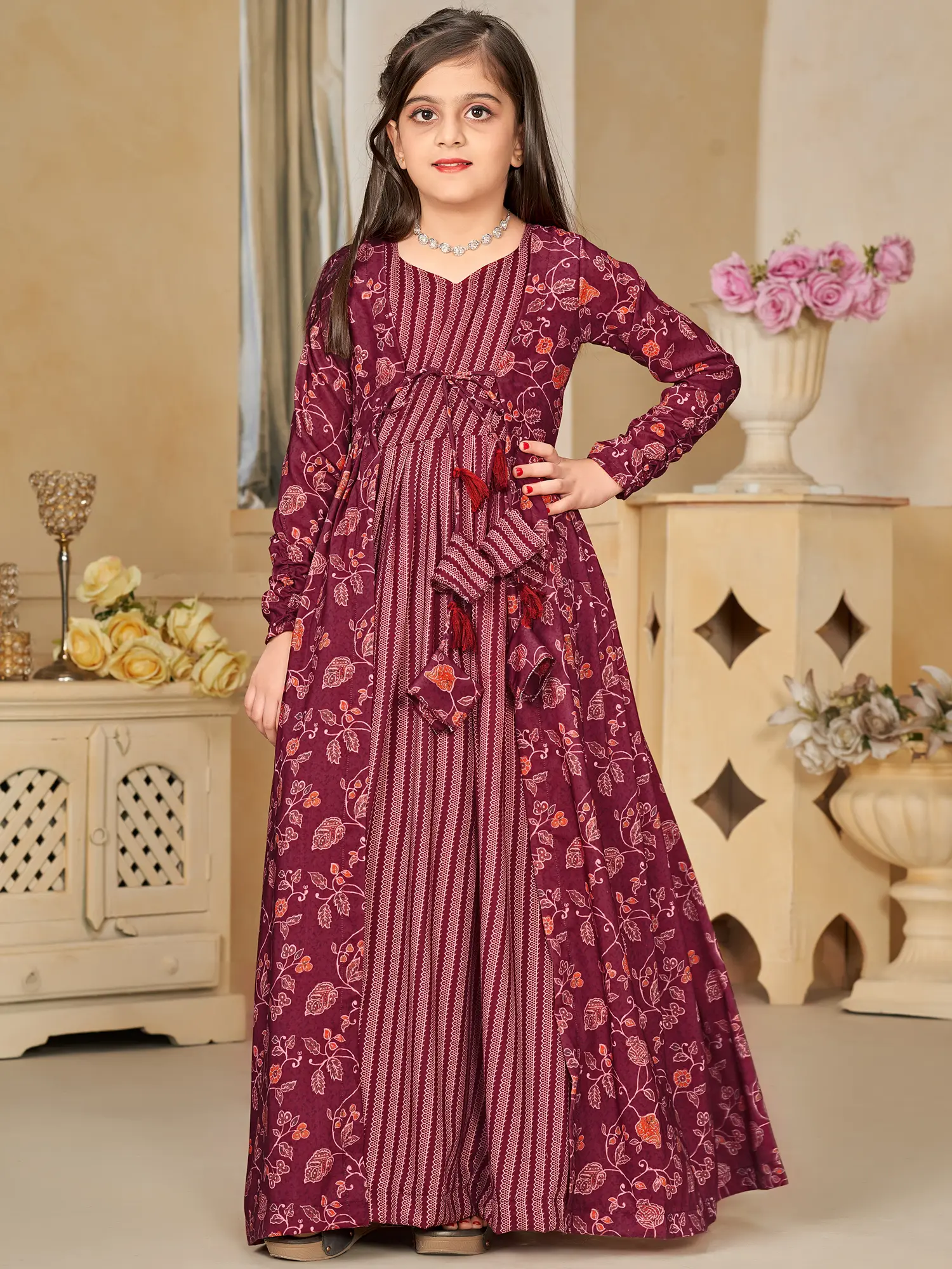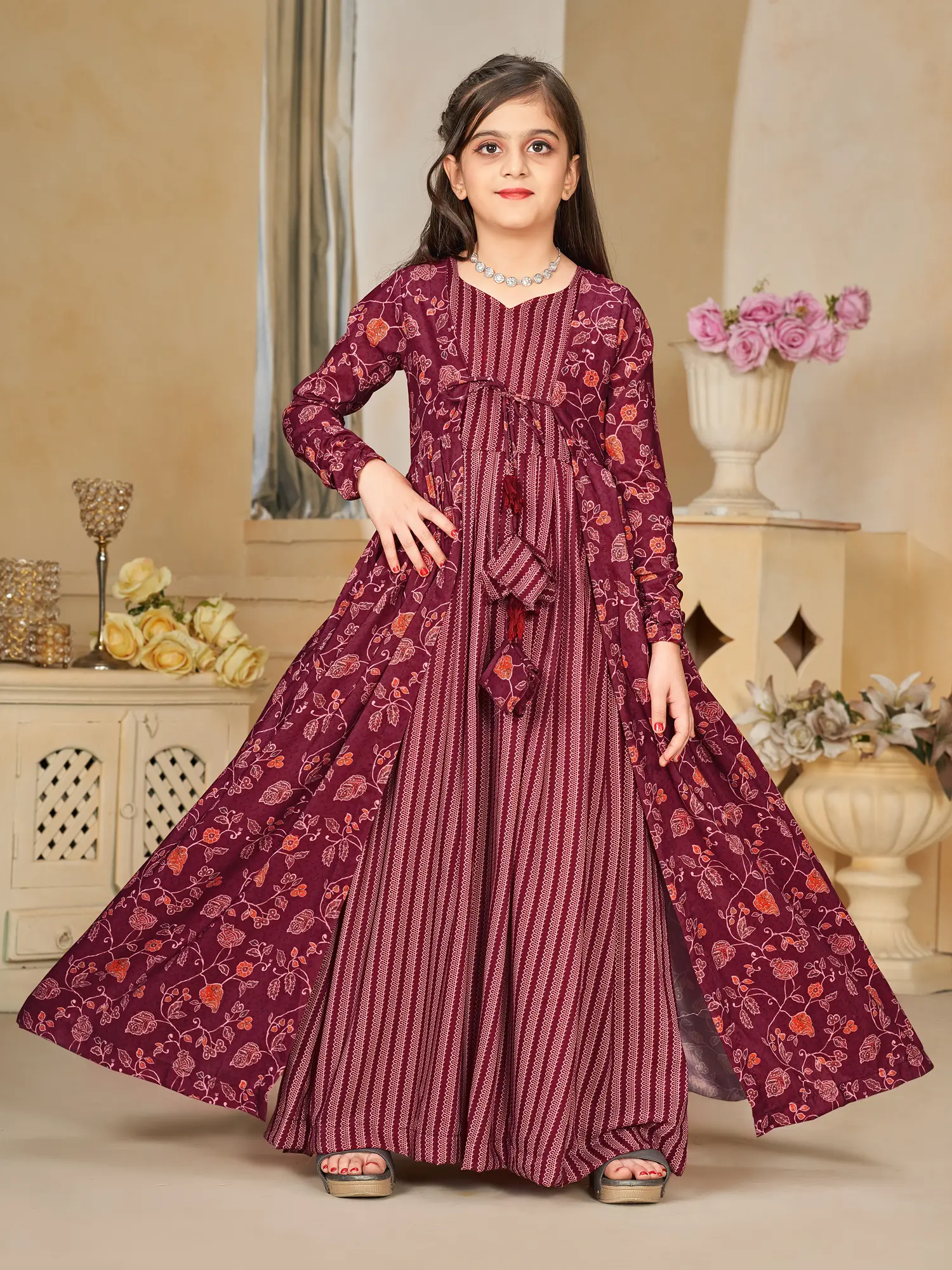 Getting the perfect Indian wear for the kids can be a challenge. Not with this beautiful Maroon Indo-Western suit set. The ensemble comes in two pieces, a gown-like suit and a shrug, which combine to create a regal look. Charming ethnic motifs digitally printed all over, add a classic beauty to the look. With the feathery feel of Muslin on your team, be assured that this will become a go-to partywear for your princess.