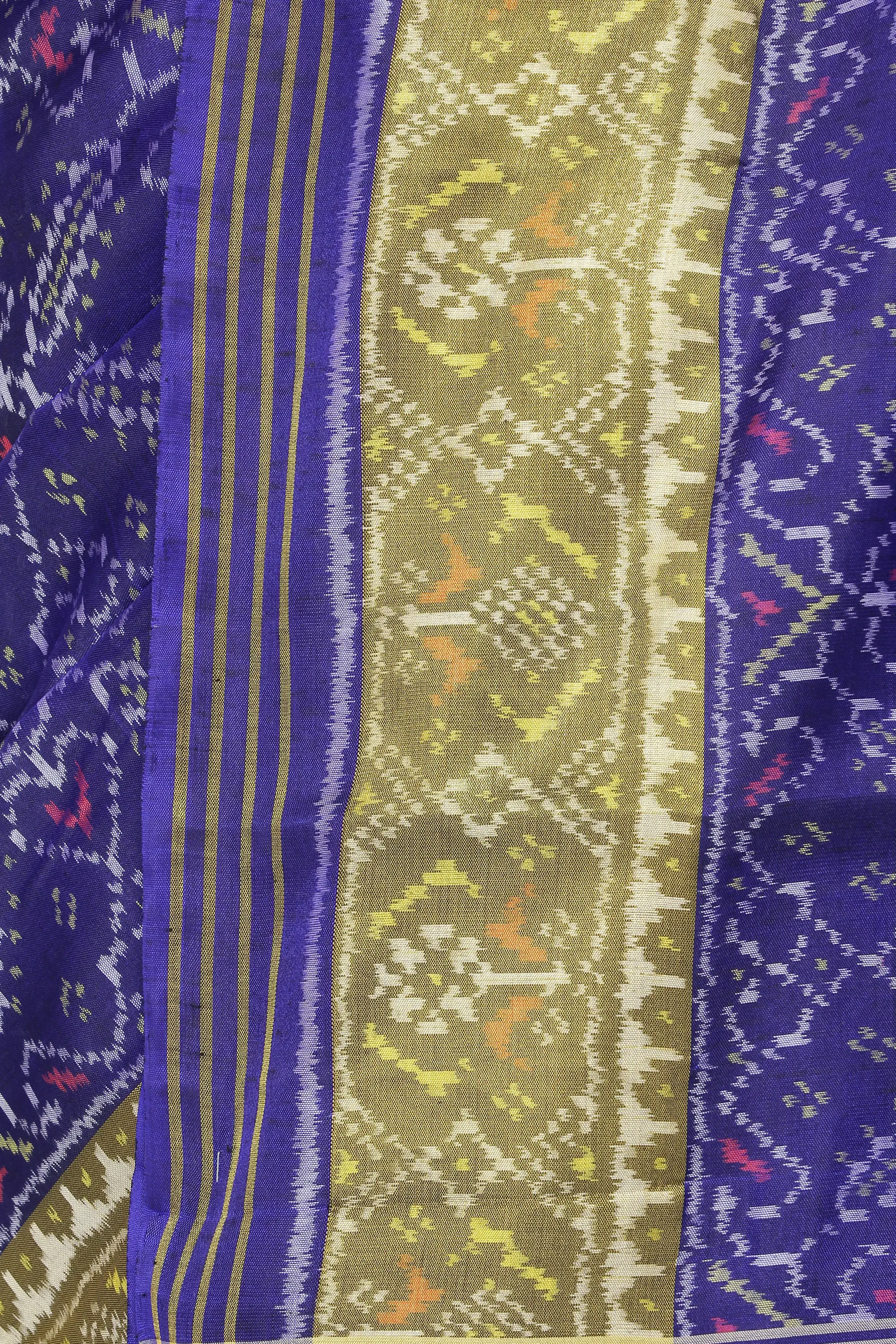 The magic of this sari lies in its Ikat weave, a labor-intensive technique where the threads are resist-dyed *before* being woven. This meticulous process creates the characteristic blurred, yet precise, geometric patterns that are the hallmark of Ikat. The "Paan Patola" motif, inspired by the sacred betel leaf, adds a symbolic layer of auspiciousness and cultural significance to the design. Each motif is rendered with remarkable clarity and vibrancy, showcasing the skill and dedication of the handloom weavers. The interplay of the deep blue with the striking golden border creates a visually arresting contrast, elevating the sari from a garment to a work of art.