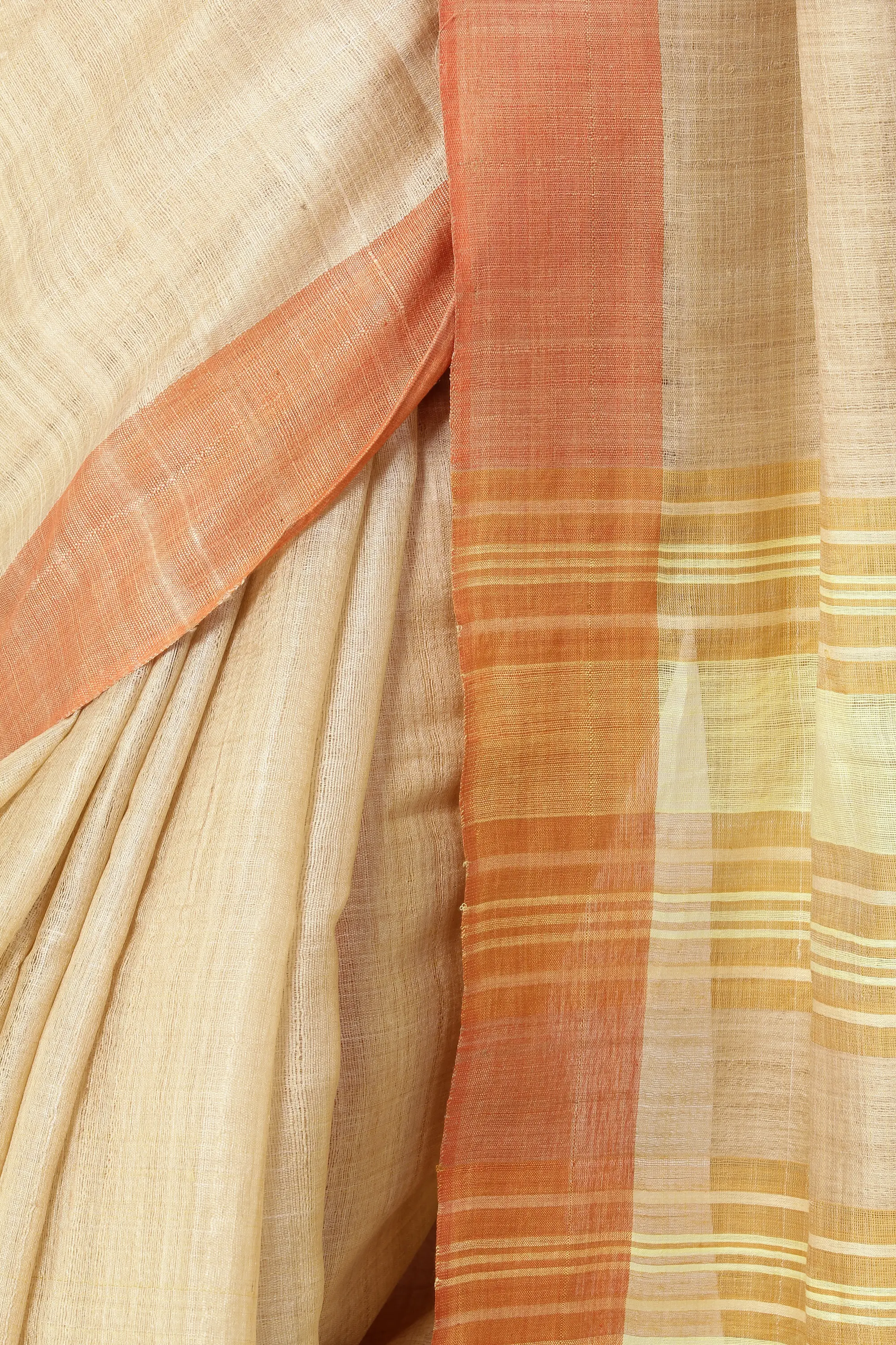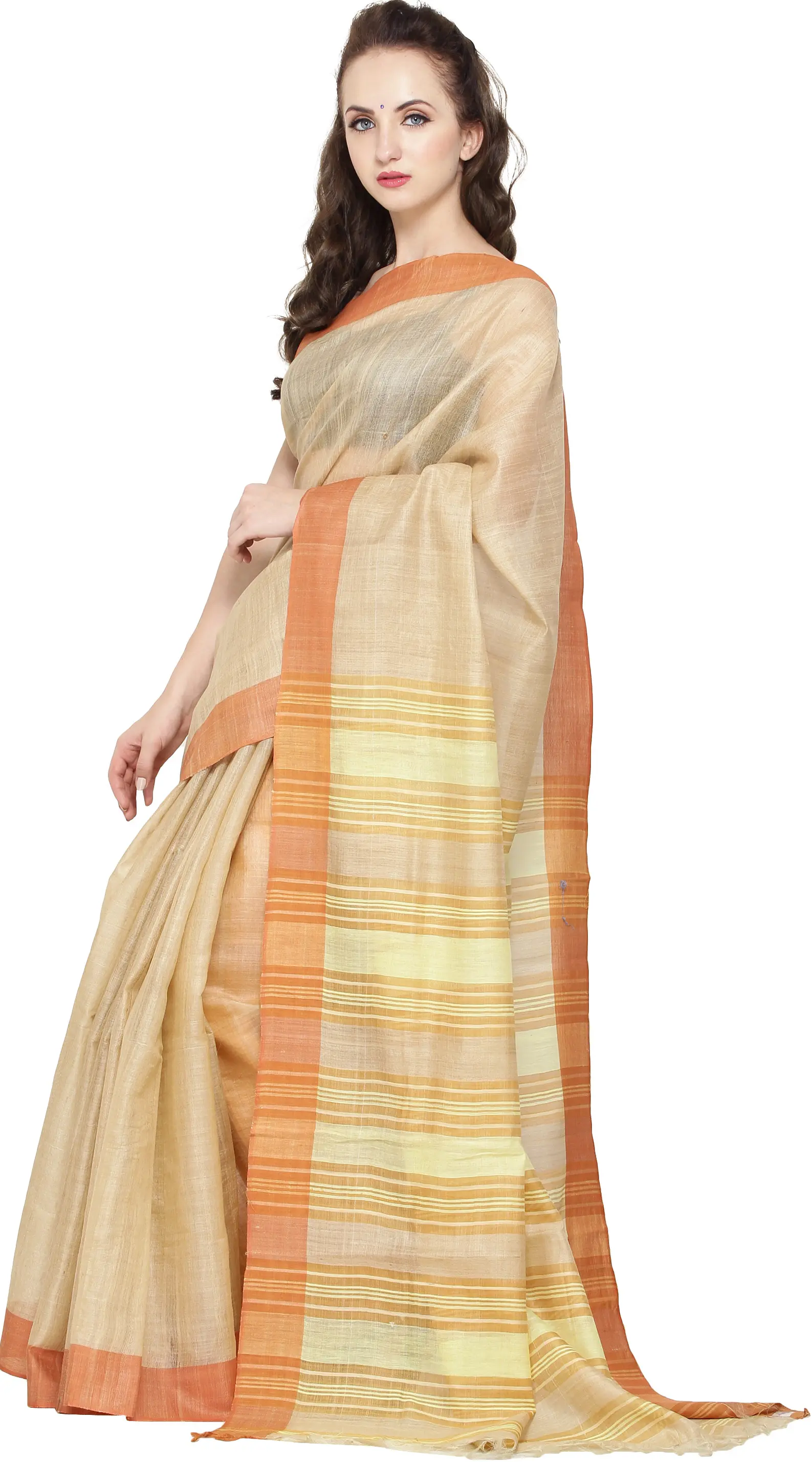 The Marzipan Kosa Silk Sari from Jharkhand is a tribute to elegance and grace. Crafted from the luxurious Kosa silk, it boasts a beautiful texture that enhances the wearer's feminine charm. The subtle marzipan hue exudes sophistication, while the woven stripes on the aanchal add depth and character. The broad border adds a touch of traditional opulence. This sari is a versatile canvas for fashion creativity, allowing it to be styled in various ways for different occasions. Its timeless appeal and tactile allure make it a treasured addition to any wardrobe, promising sophistication and timeless beauty.