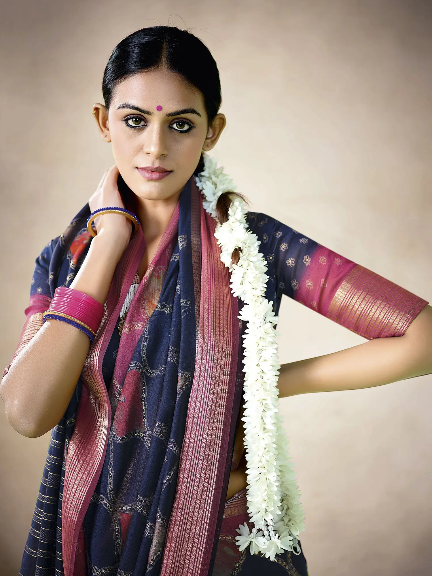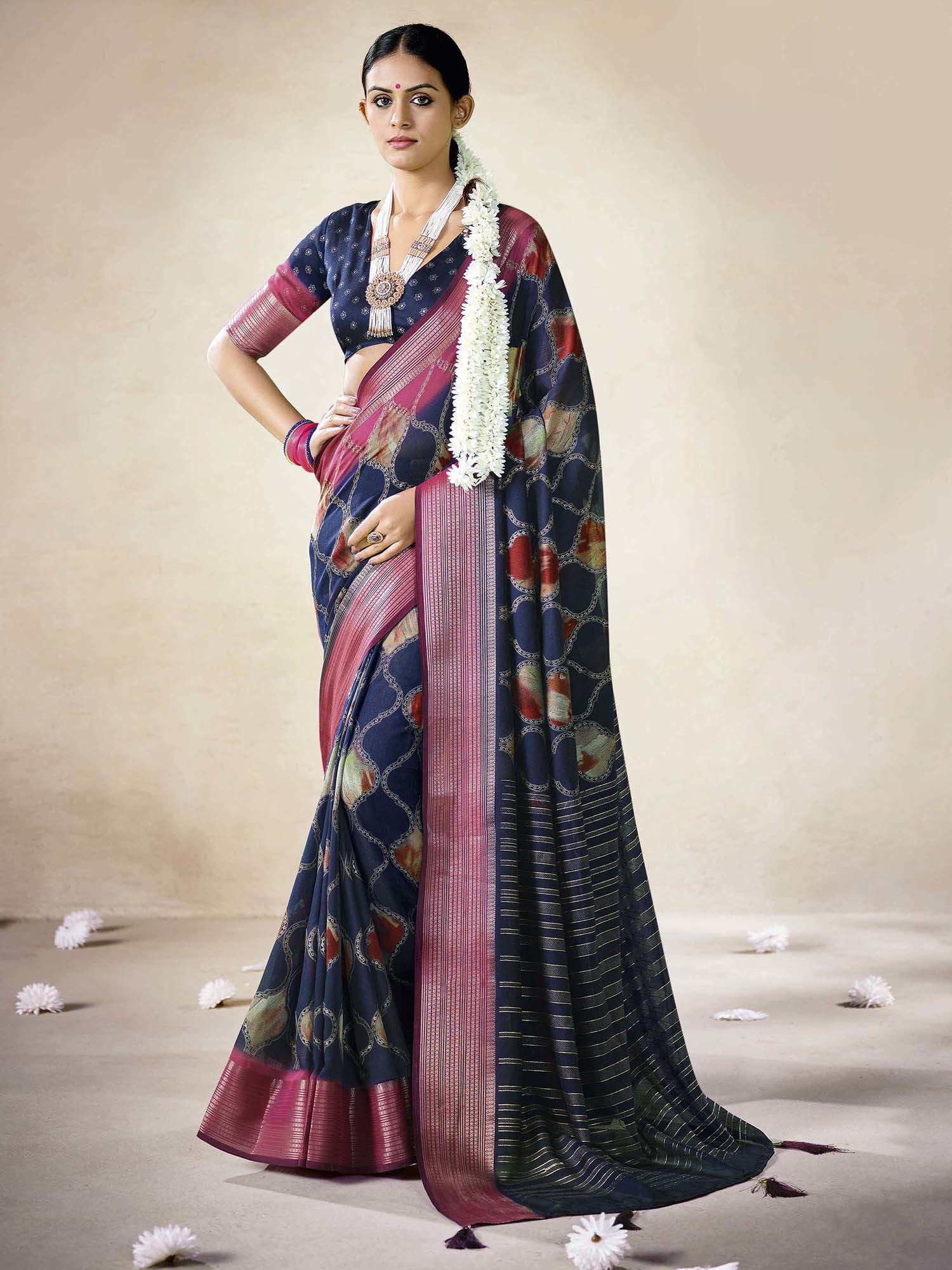 A richly woven border, imbued with deep, resonant tones, frames the captivating foil-printed pattern. The detailed motifs are rendered with remarkable precision, creating a dynamic visual narrative across the textile. This striking contrast in textures and designs elevates the overall aesthetic, making each element a focal point. The accompanying blouse piece, designed for tailor-made comfort and a perfect fit, complements the main garment flawlessly.