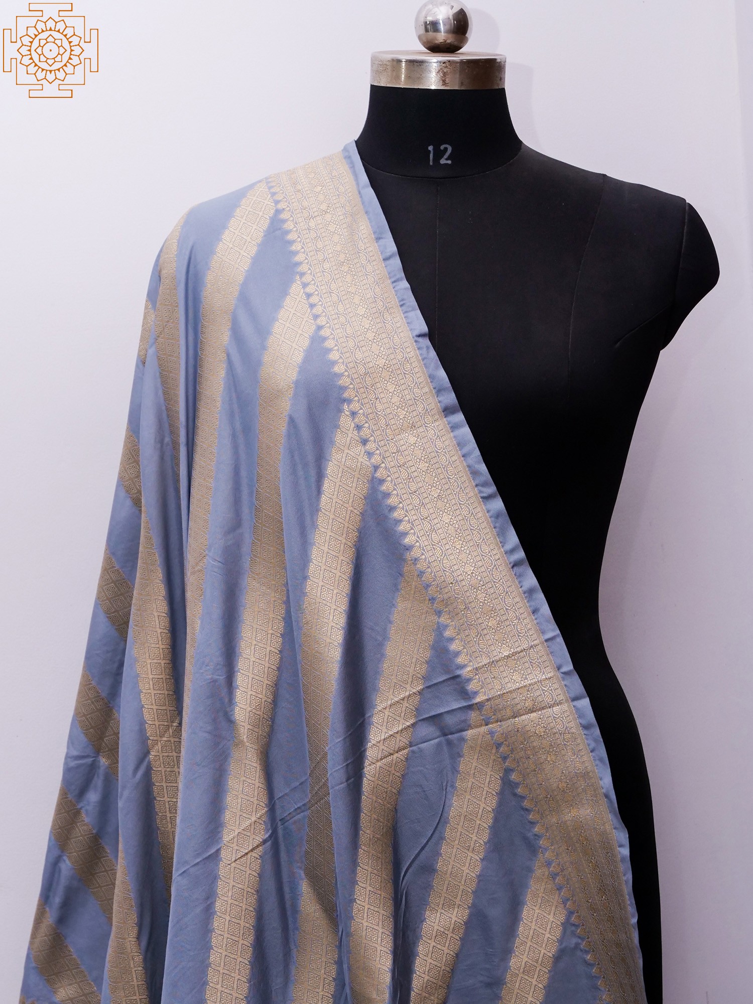 Enjoy the ethereal charm of this “Mauve Banarasi Dupatta,” which is embellished with a stunning Golden Zari Woven Stripe Pattern. Crafted with care, this luxurious creation instantly enhances any attire, offering a touch of classic elegance. Versatile and lightweight, it drapes elegantly, complementing your style for any occasion. The golden zari stripes reflect luxury and tradition, while the deep mauve tone conveys refinement.