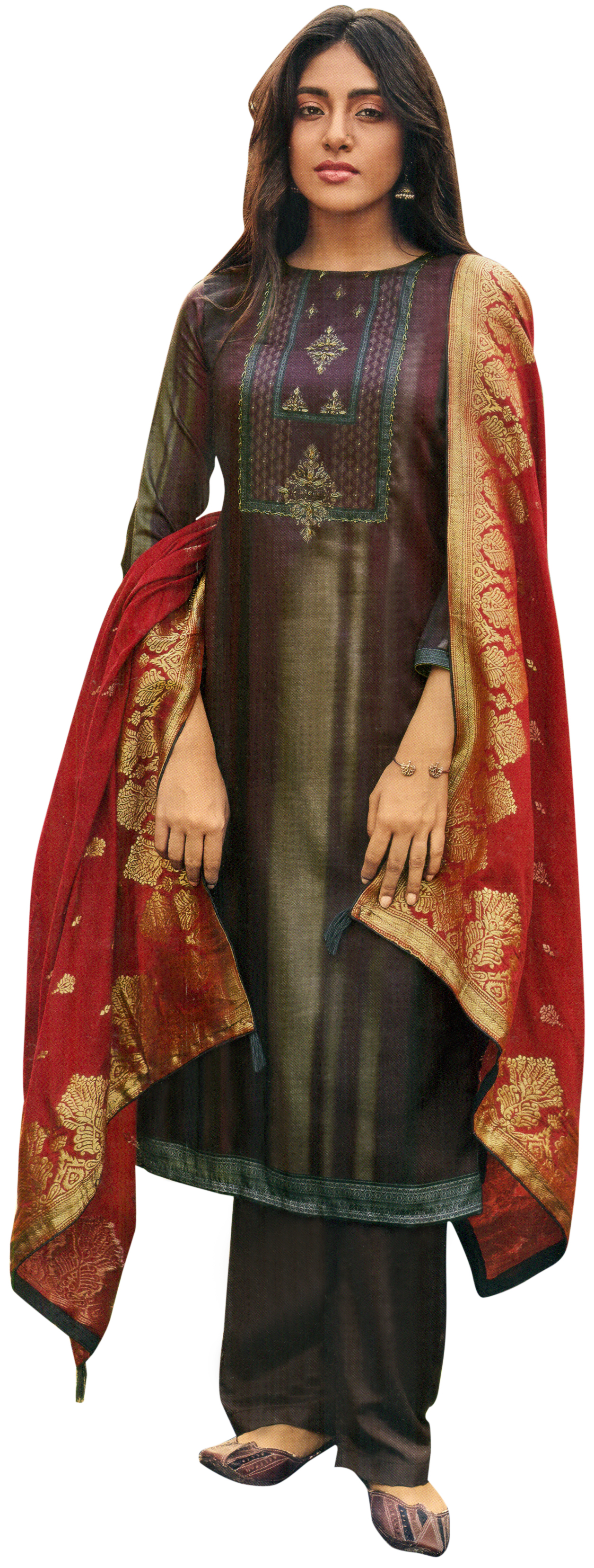 Mauve-Wine Palazo Salwar- Kameez Suit with Zari-Embroidery and Gray Woven Dupatta