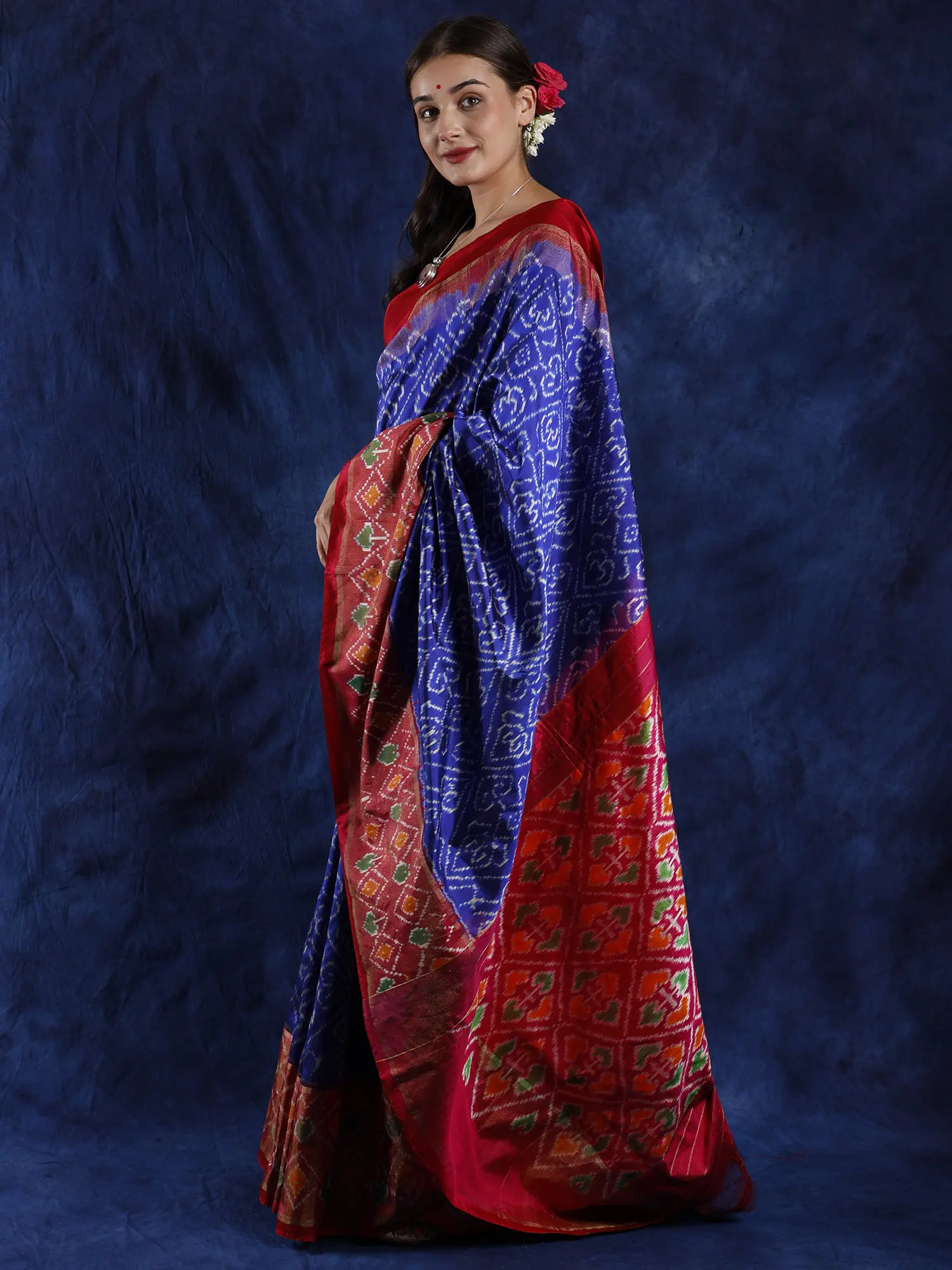 The body of the saree is adorned with a captivating array of geometric and abstract motifs, woven with precision using the ancient Ikat dyeing technique. These designs, rendered in contrasting threads, create a visually striking effect that is both sophisticated and timeless. Complementing the intricate patterns of the saree is a vibrant contrast golden border and pallu. The border, a rich, deep red, is intricately woven with golden threads, forming a stunning frame for the Mazarine-blue silk. The pallu, the decorative end piece of the saree, further amplifies this opulence, showcasing a continuation of the golden border's elaborate design, making it a true statement piece. ––––––––––––––––––