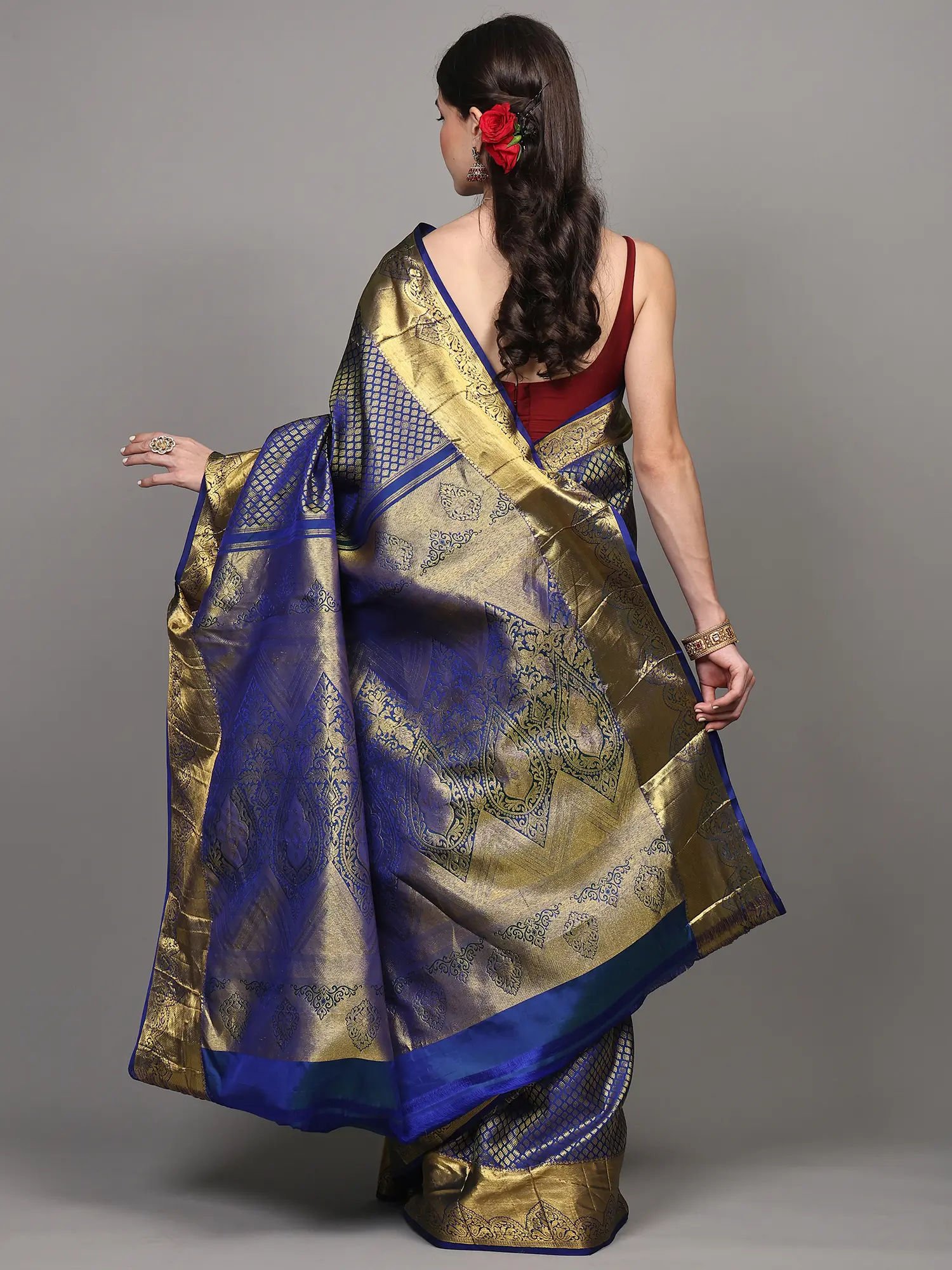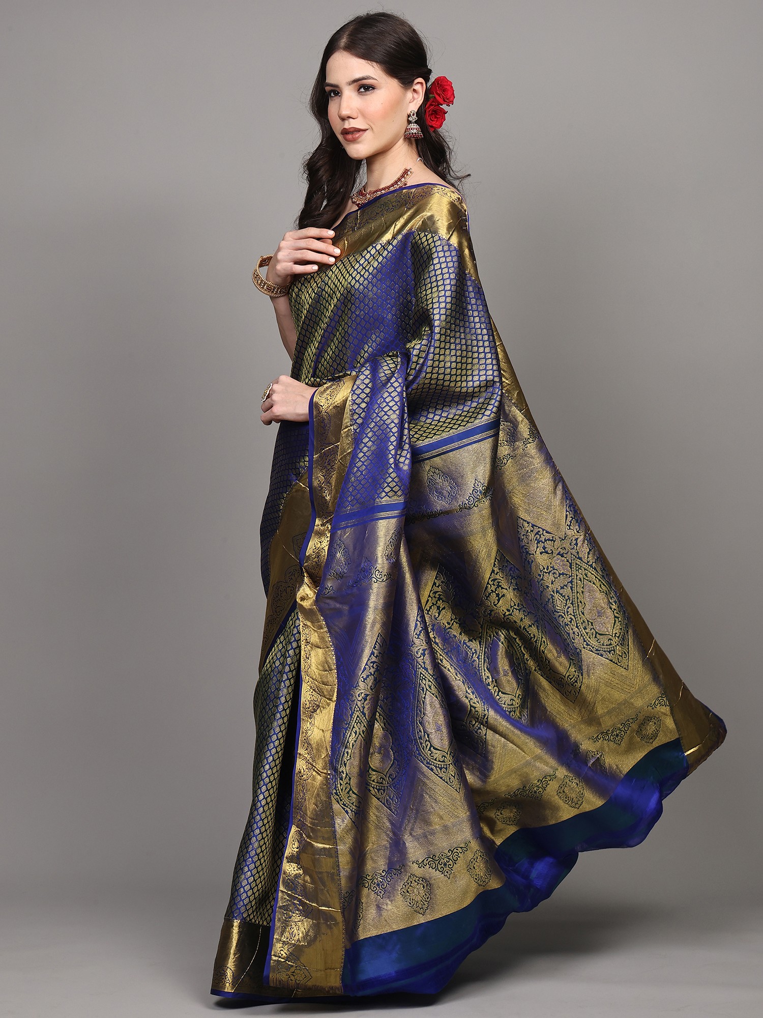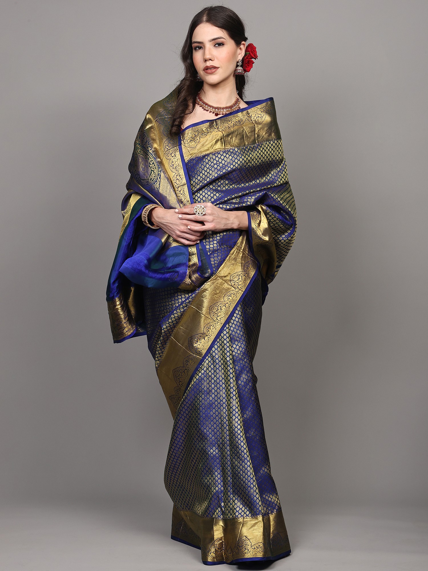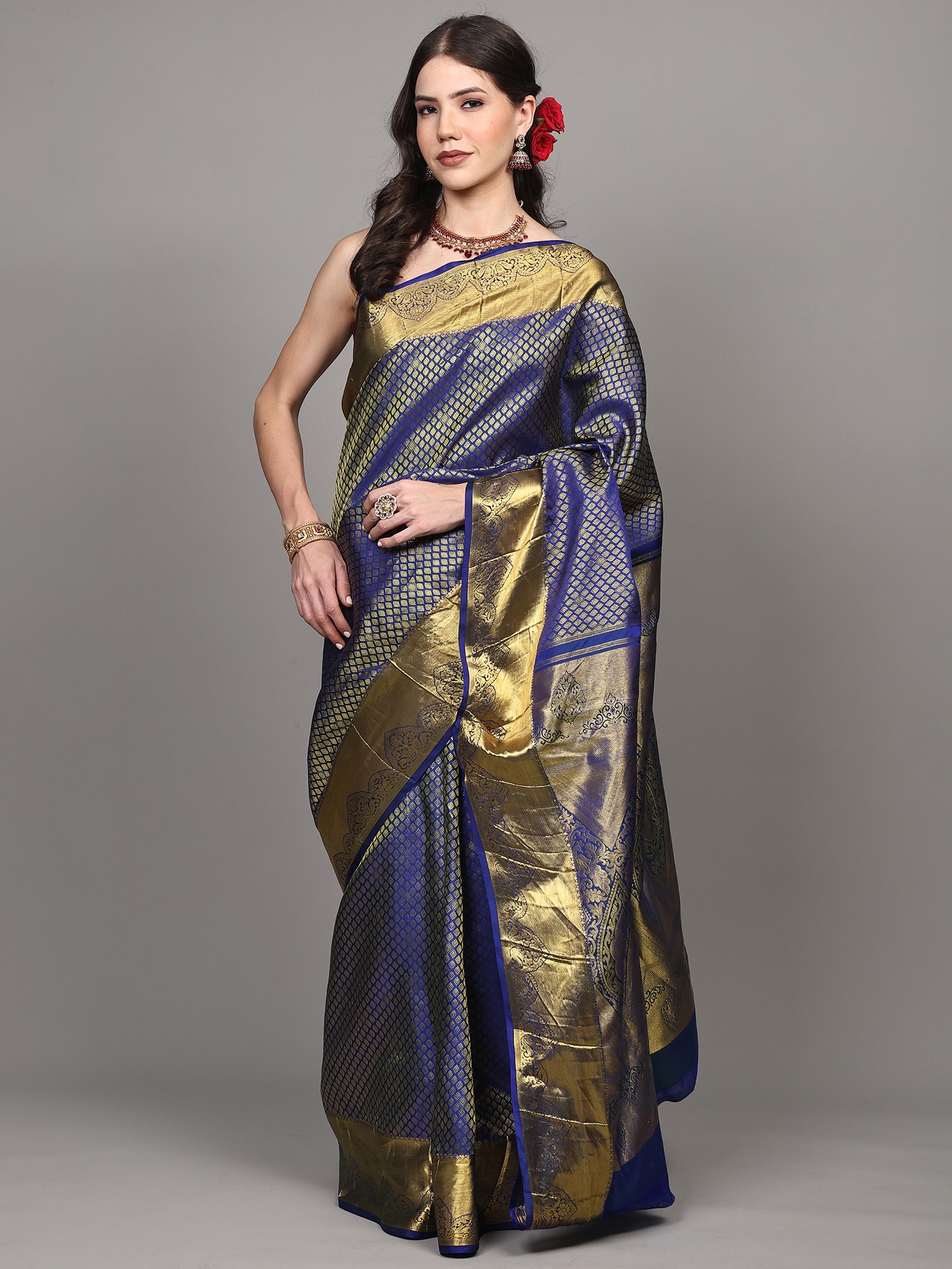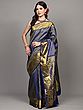 Moss-Gray Pure Silk Booti Motifs Saree with Zari Woven Contrast Border-Pallu from Kumbakonam