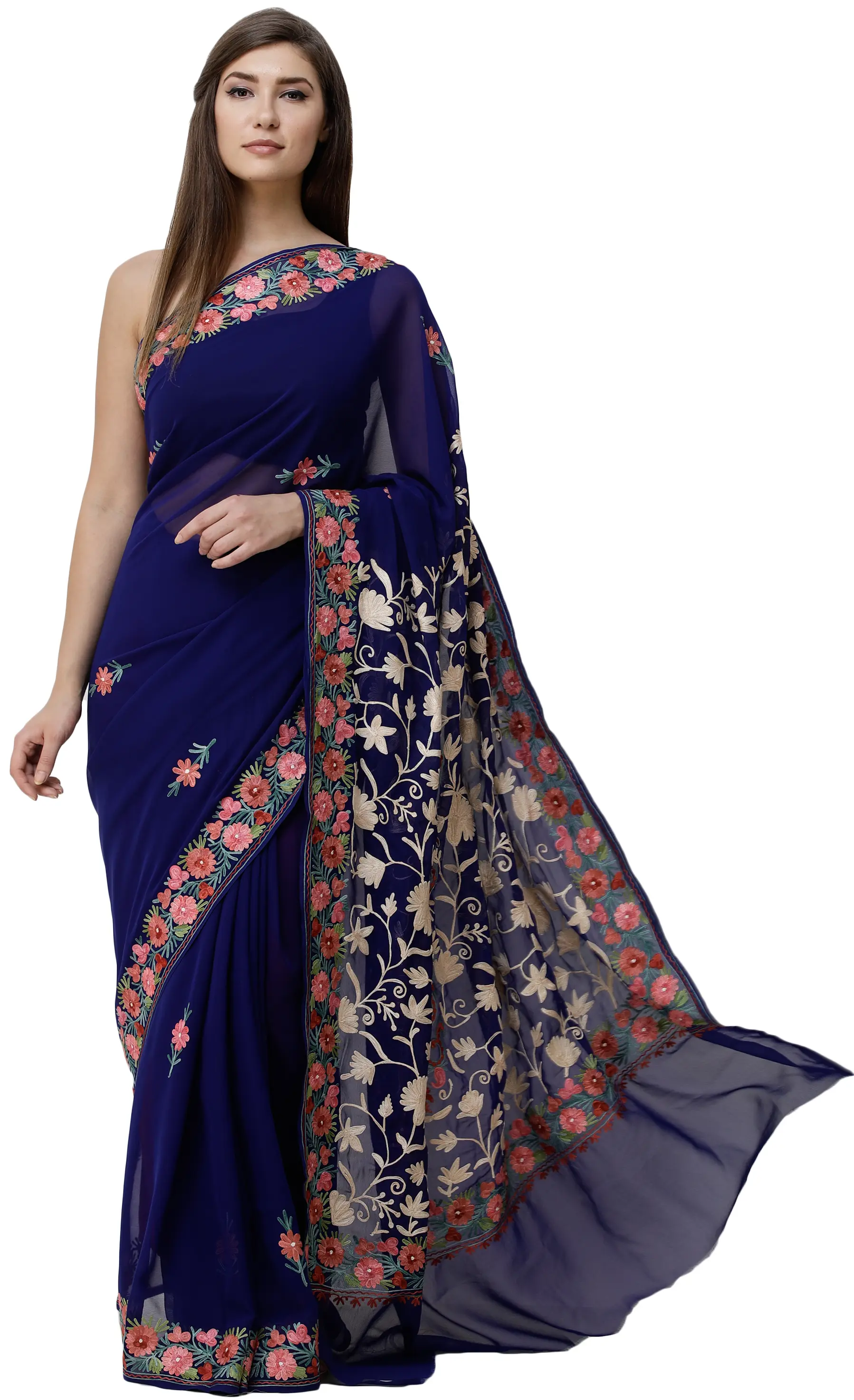 A Symphony of Sapphire and Blooms: The Kashmiri Aari Embroidered Georgette Sari