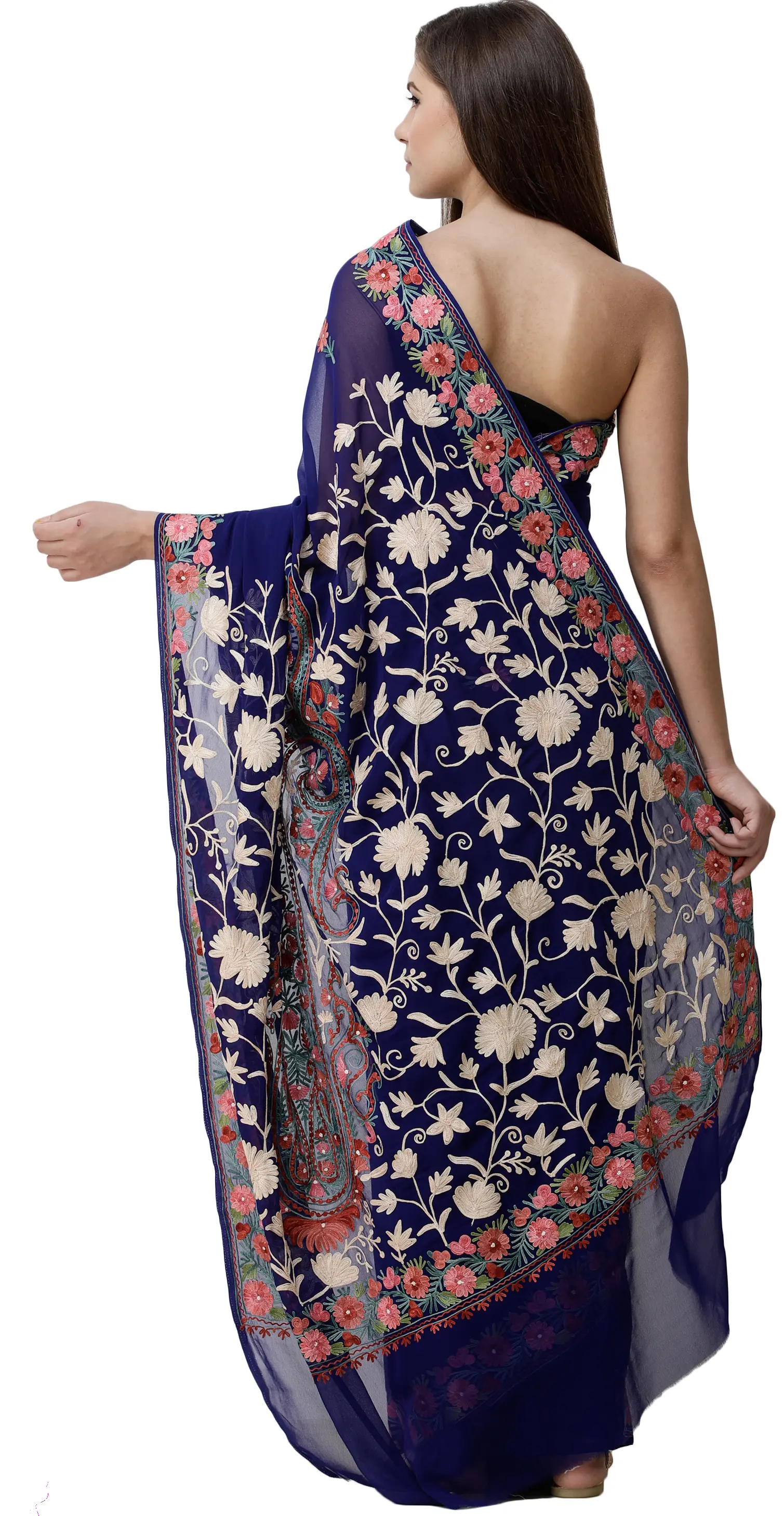 Mazarine-Blue Sari from Kashmir with Aari-Embroidered Multicolor Flowers
