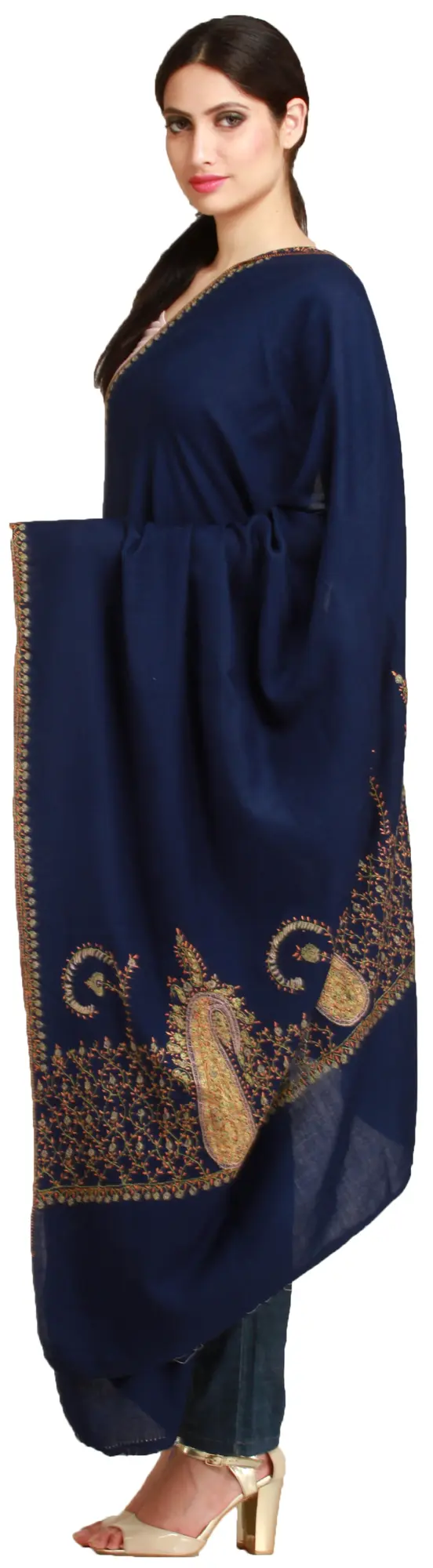 Wrap yourself in the timeless elegance of this exquisite Kashmiri Tusha shawl, a testament to generations of artisanal skill. Crafted from pure wool, this piece offers unparalleled warmth and a sumptuously soft feel against your skin. The deep, medieval-blue hue provides a sophisticated canvas for the intricate needle hand-embroidery that graces its borders, showcasing the iconic paisley motif. Each stitch is a whisper of tradition, meticulously placed by skilled hands to create a design that is both classic and captivating.
