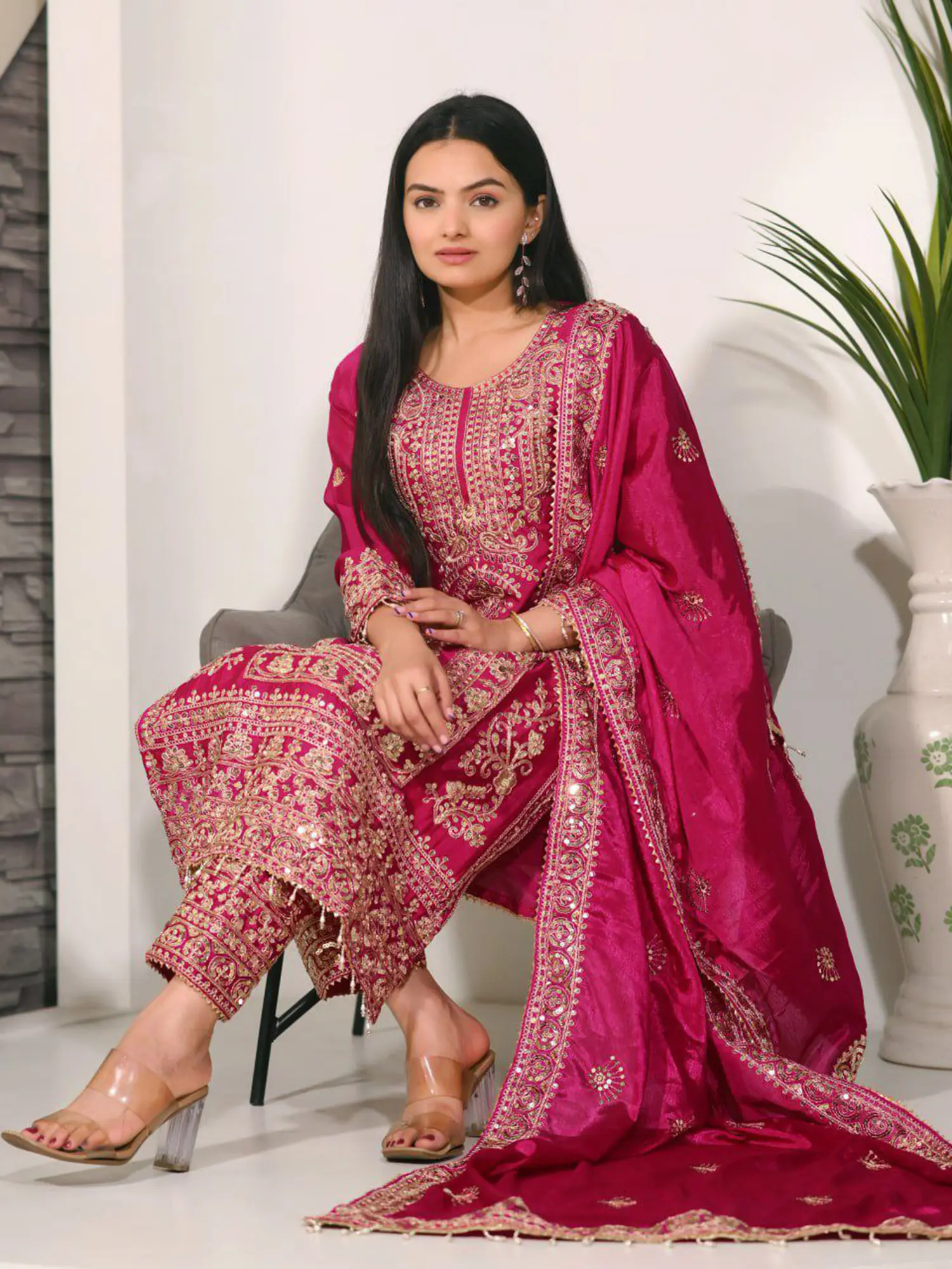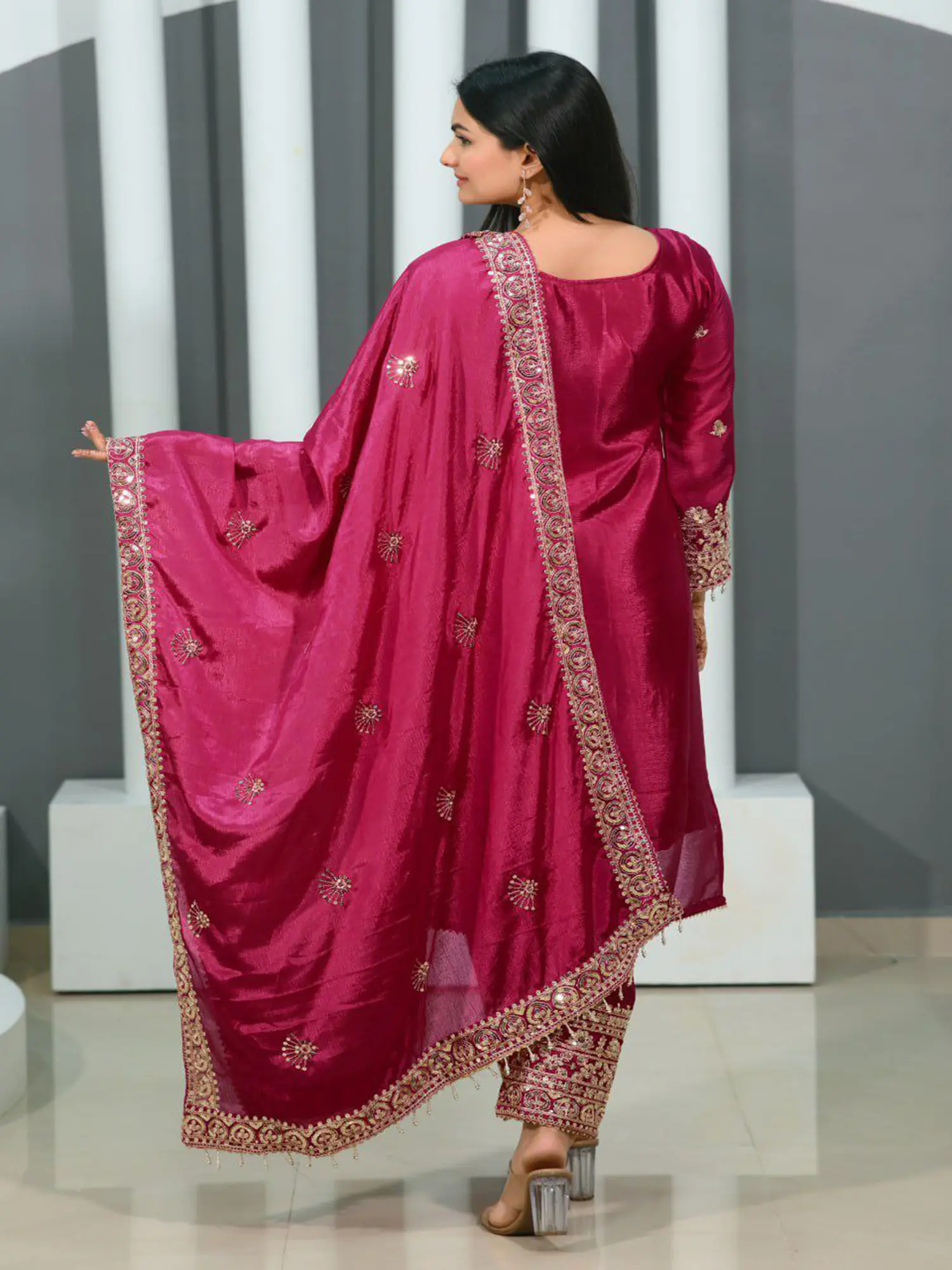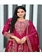Dark-Scarlet Viscose Velvet Round Neck Stunning Kurta Set With Net Dupatta