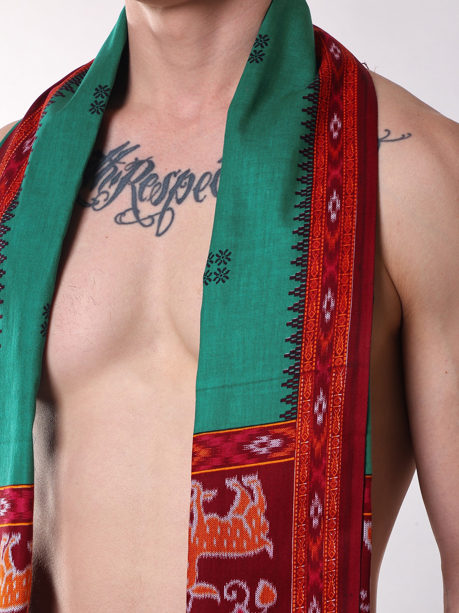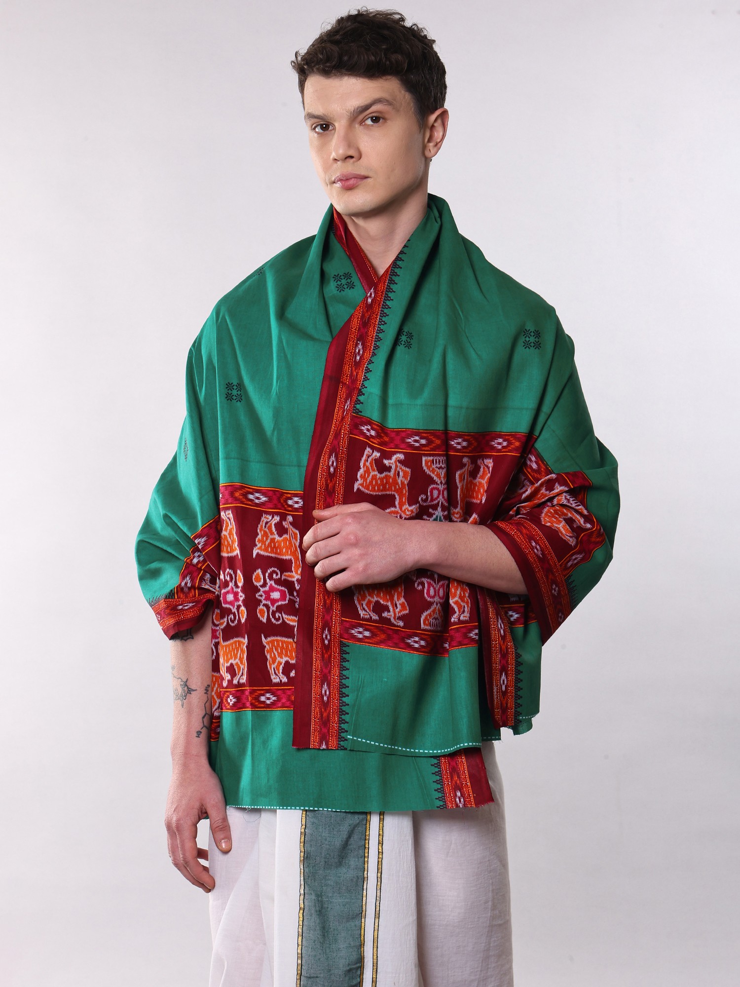 Men's Angavastram: Pepper-Green Ikat with Deer Motif