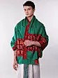 Features a rich pepper-green hue adorned with vibrant red and orange Ikat patterns.