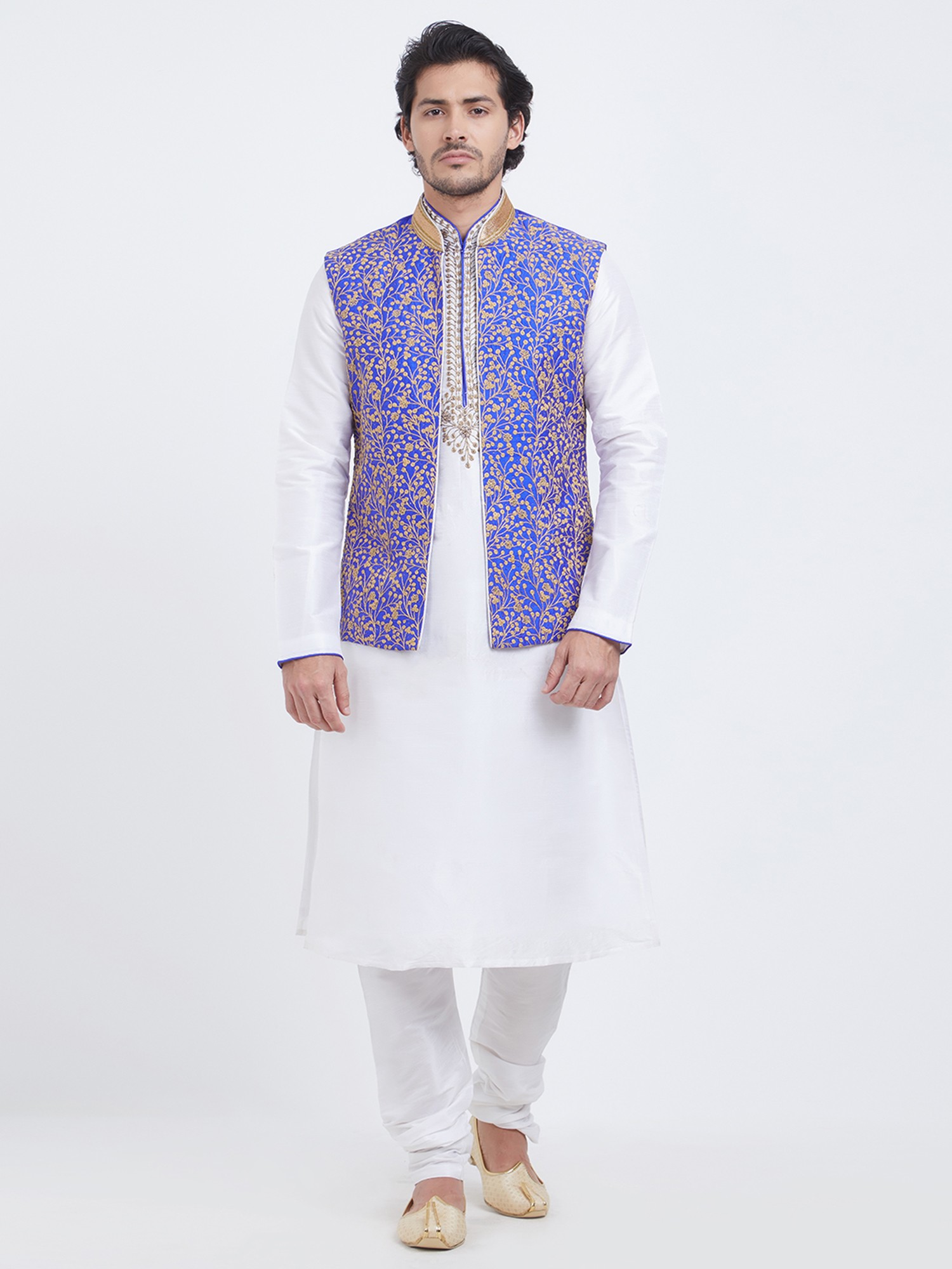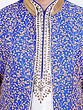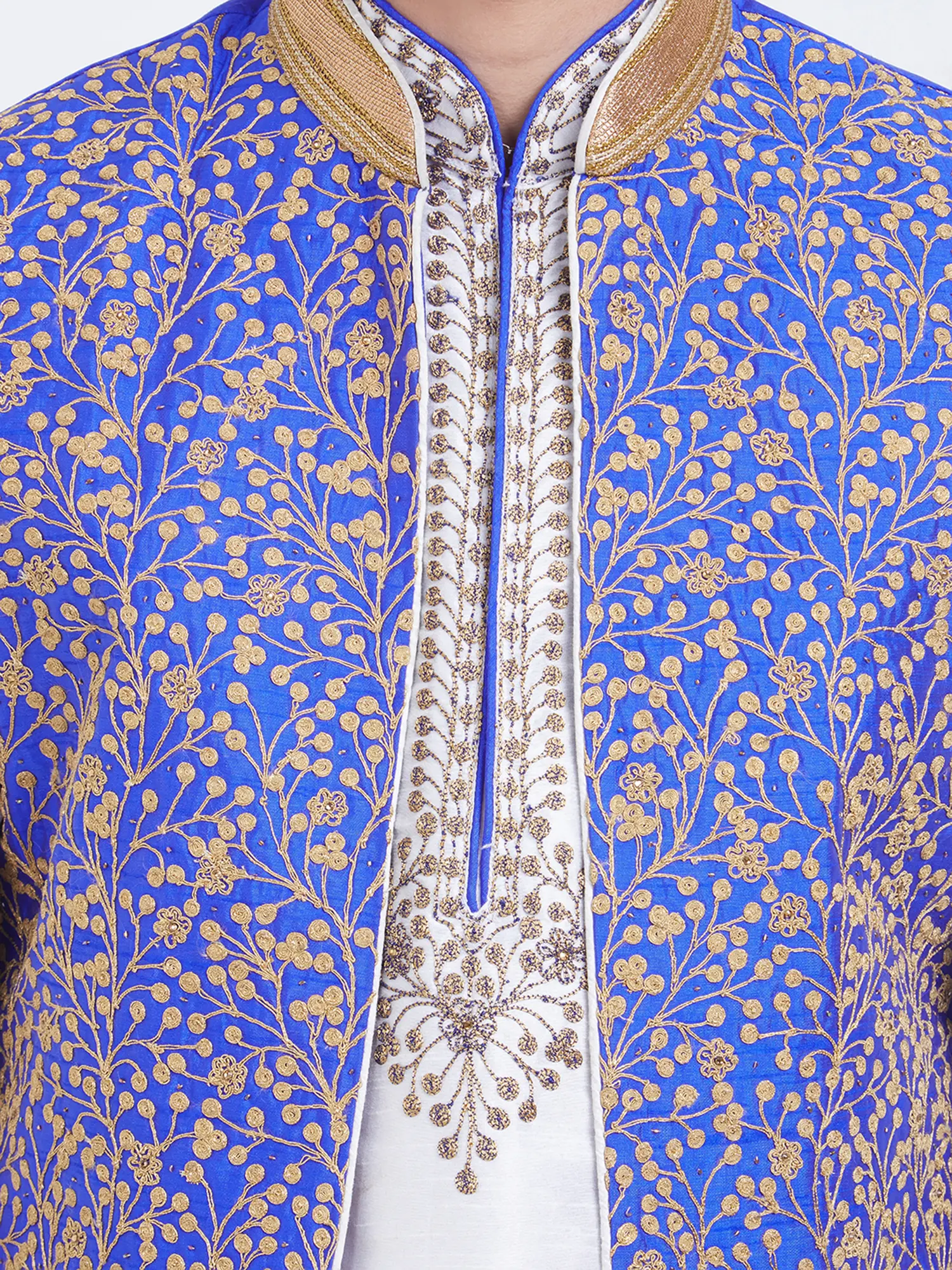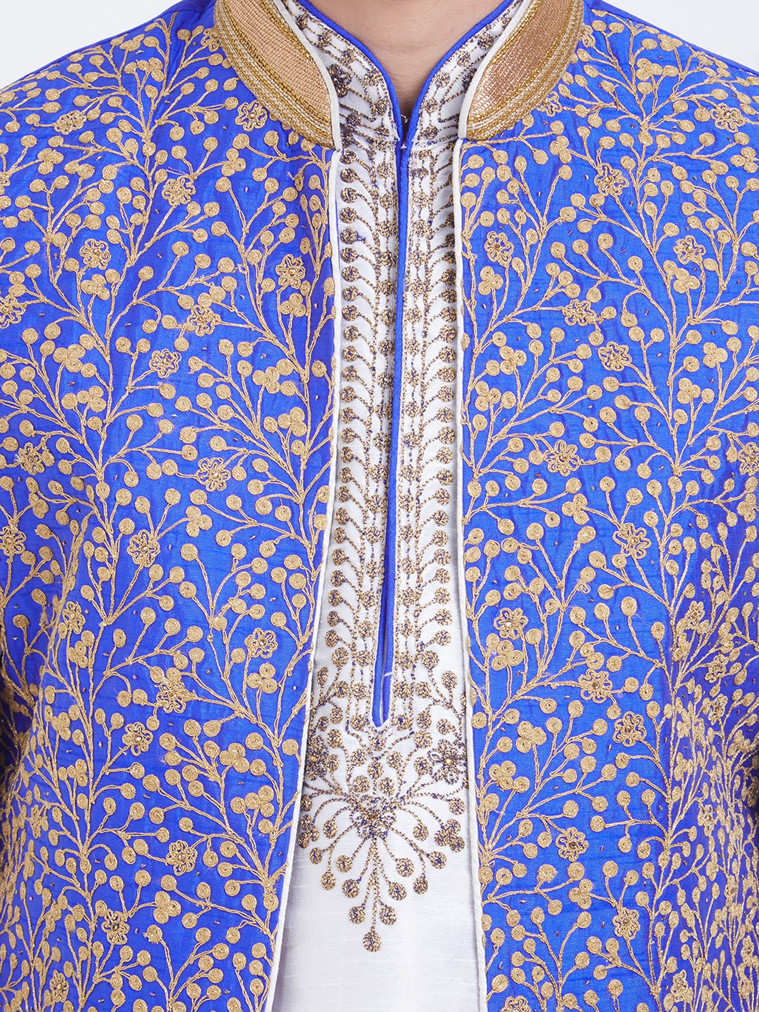 Features a vibrant royal blue art silk Nehru jacket with intricate gold floral embroidery.