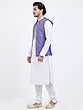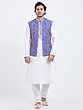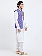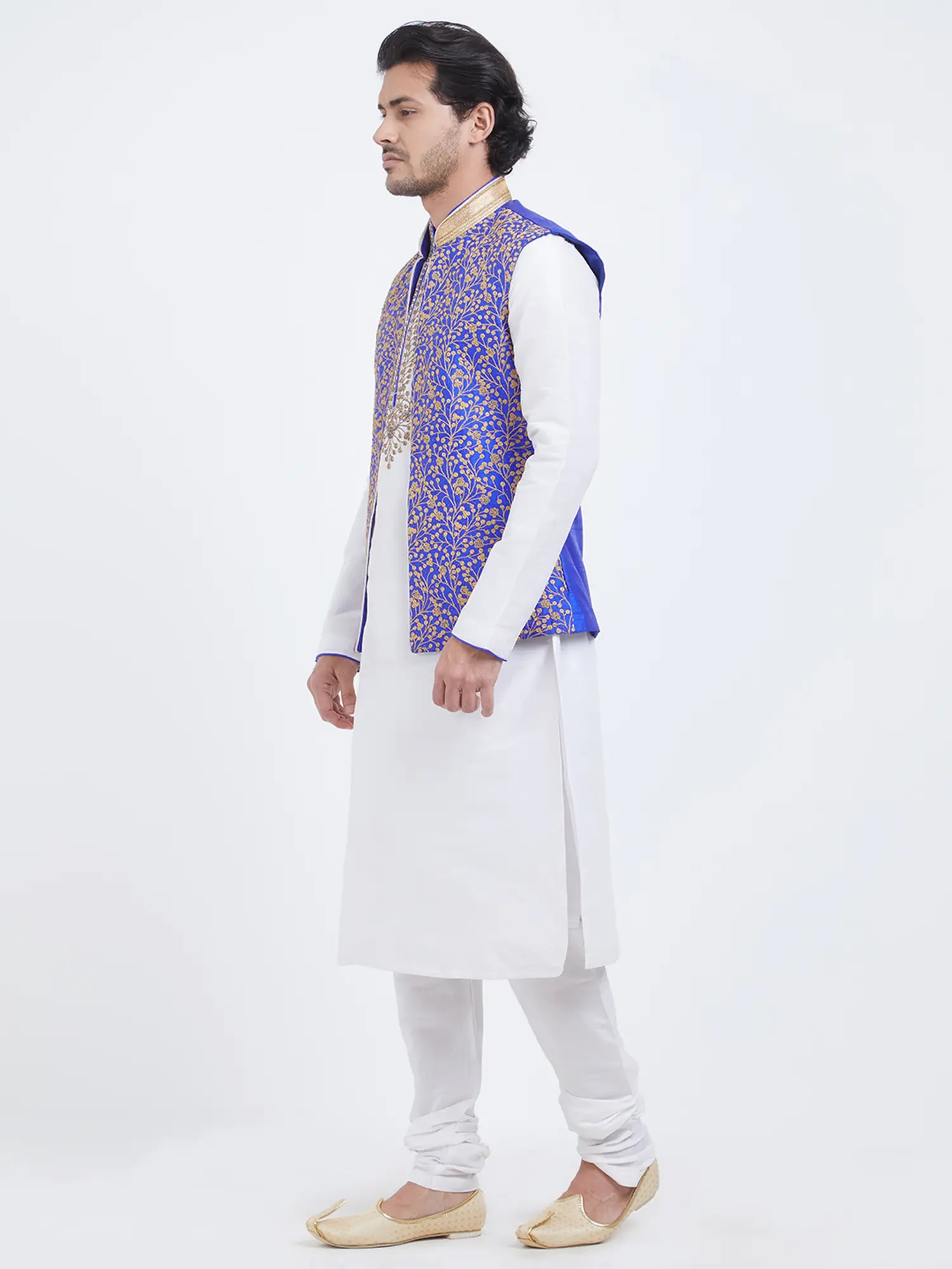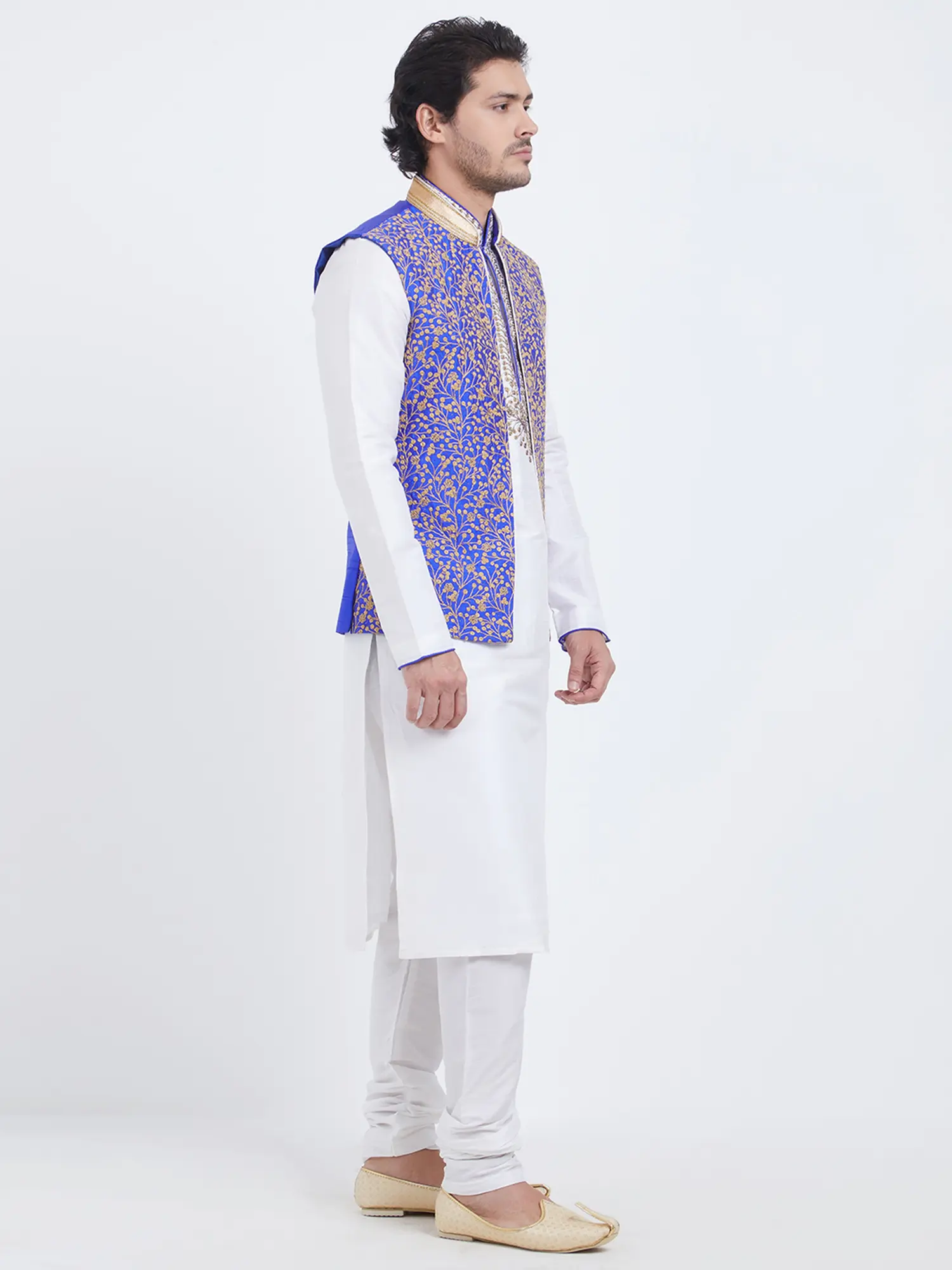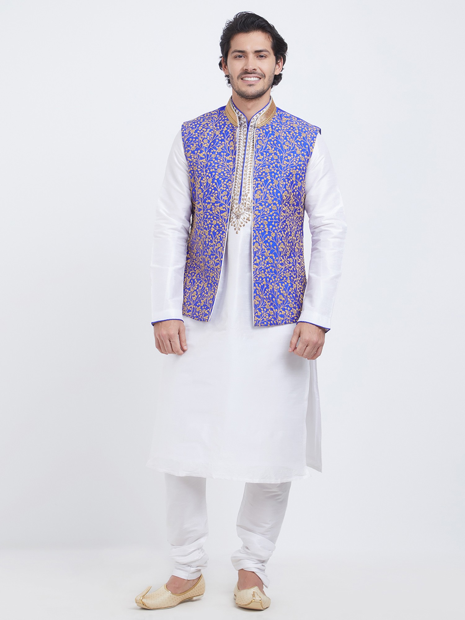 Features a vibrant royal blue art silk Nehru jacket with intricate gold floral embroidery.