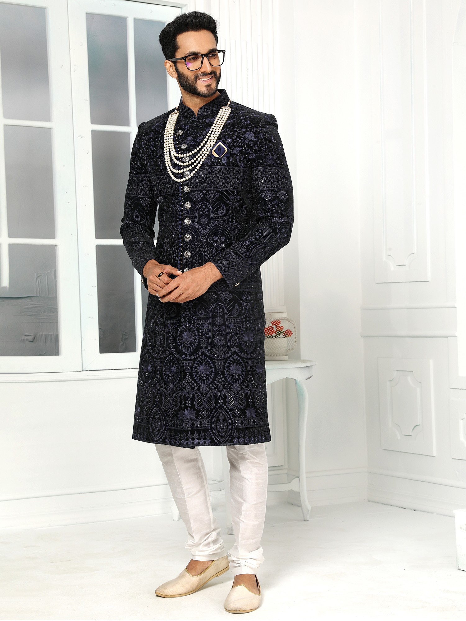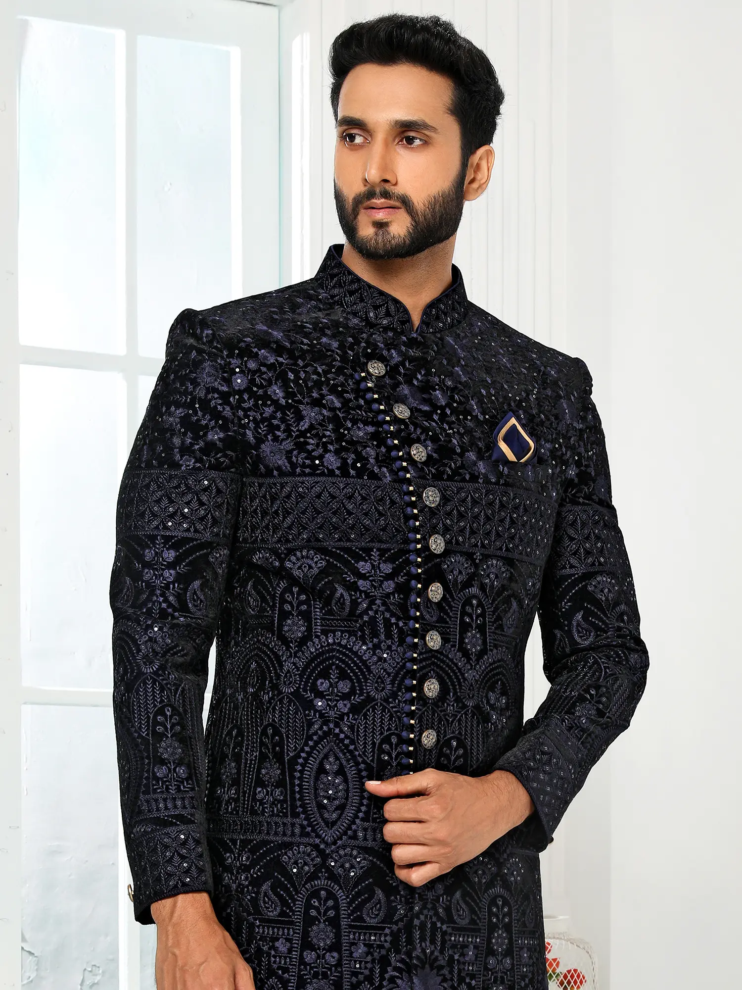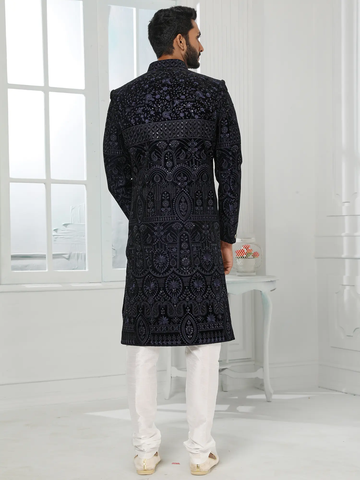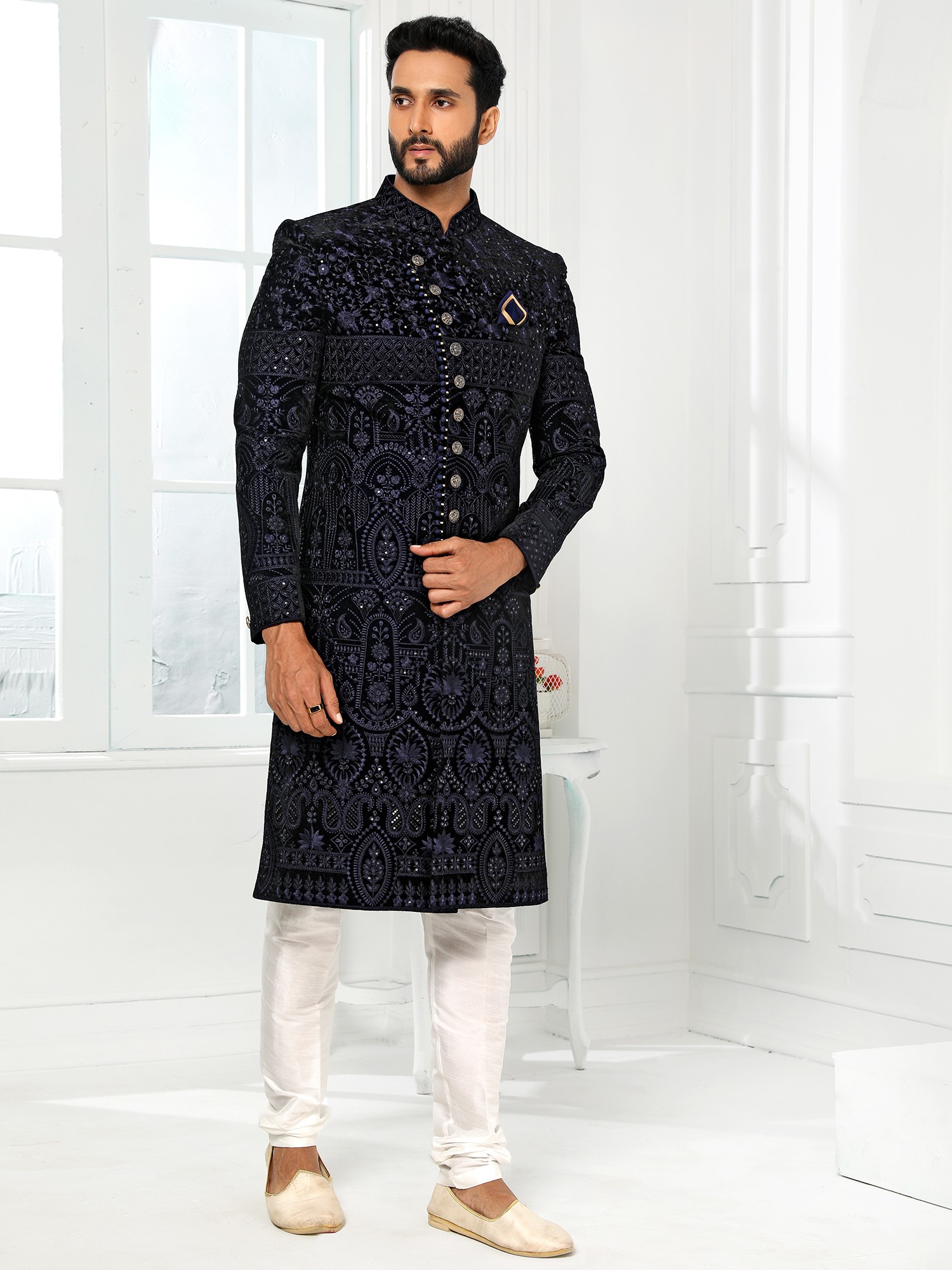 Observe the captivating detail that adorns the rich fabric, a symphony of patterns that flow seamlessly across the silhouette. The contrast of the deep, velvety hue against the intricate embroidery creates a visually stunning effect. Complementing the opulent sherwani are the perfectly tailored churidar pants, designed for both comfort and an elegant drape that completes the ensemble. This set, sized at #34 (XS), offers a precise and flattering fit for those who appreciate tailored perfection.