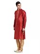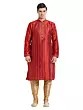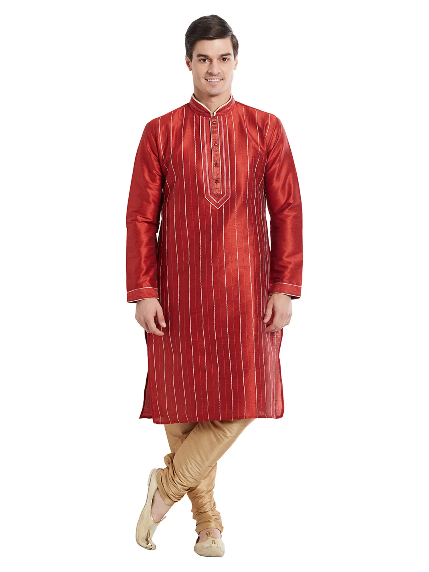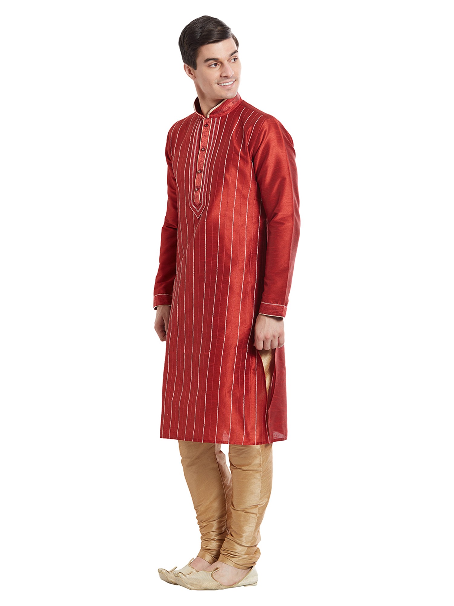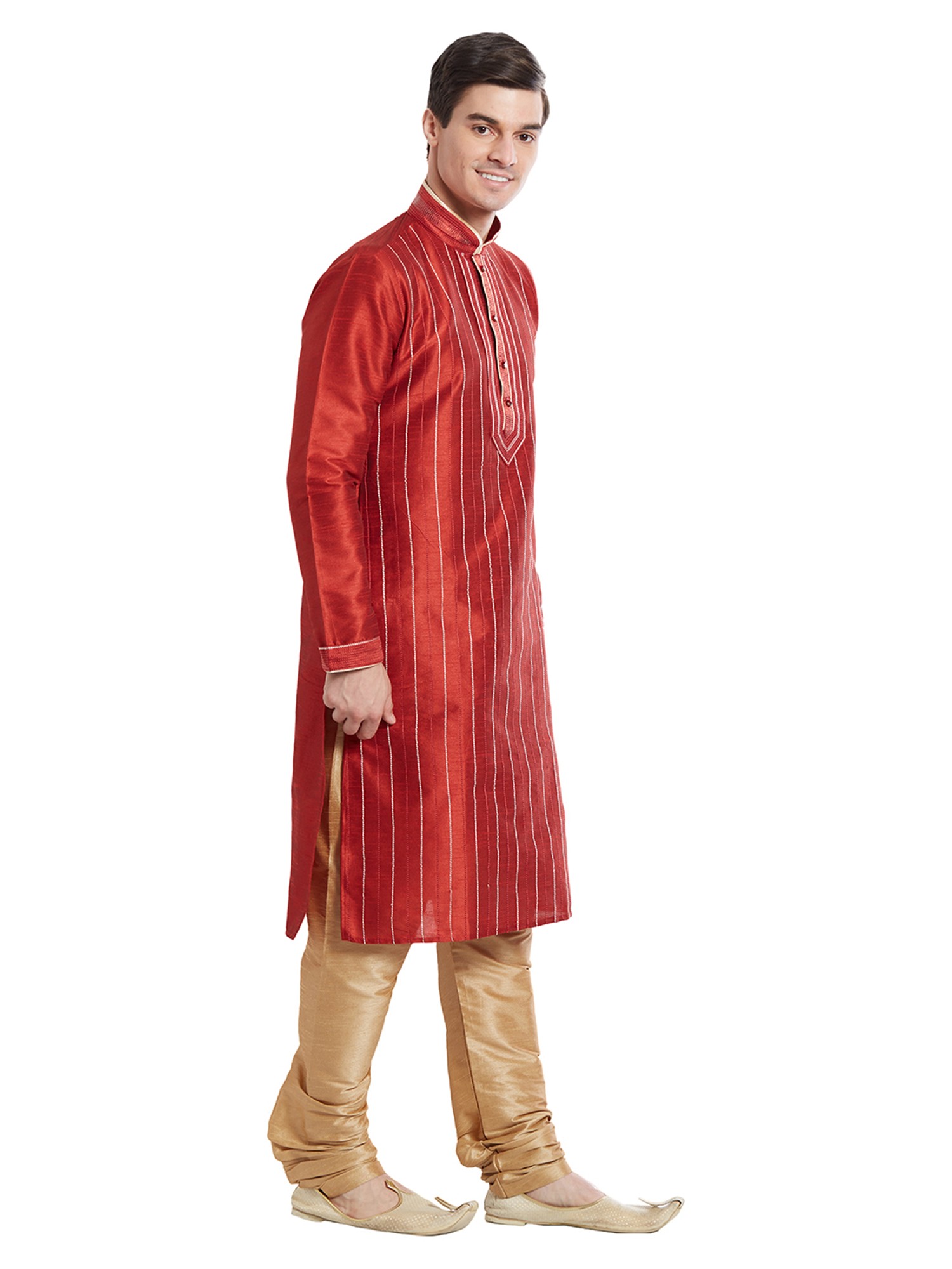 The rich, captivating hue of the art silk is enhanced by a series of fine, contrasting vertical stripes. These subtle lines create a visually elongating effect, lending a sophisticated silhouette. The mandarin collar, a classic design element, is meticulously finished, complementing the overall aesthetic and framing the face with a touch of regal formality. The fit, tailored for ease of movement, ensures comfort that complements its stylish appearance, even in the smallest size.