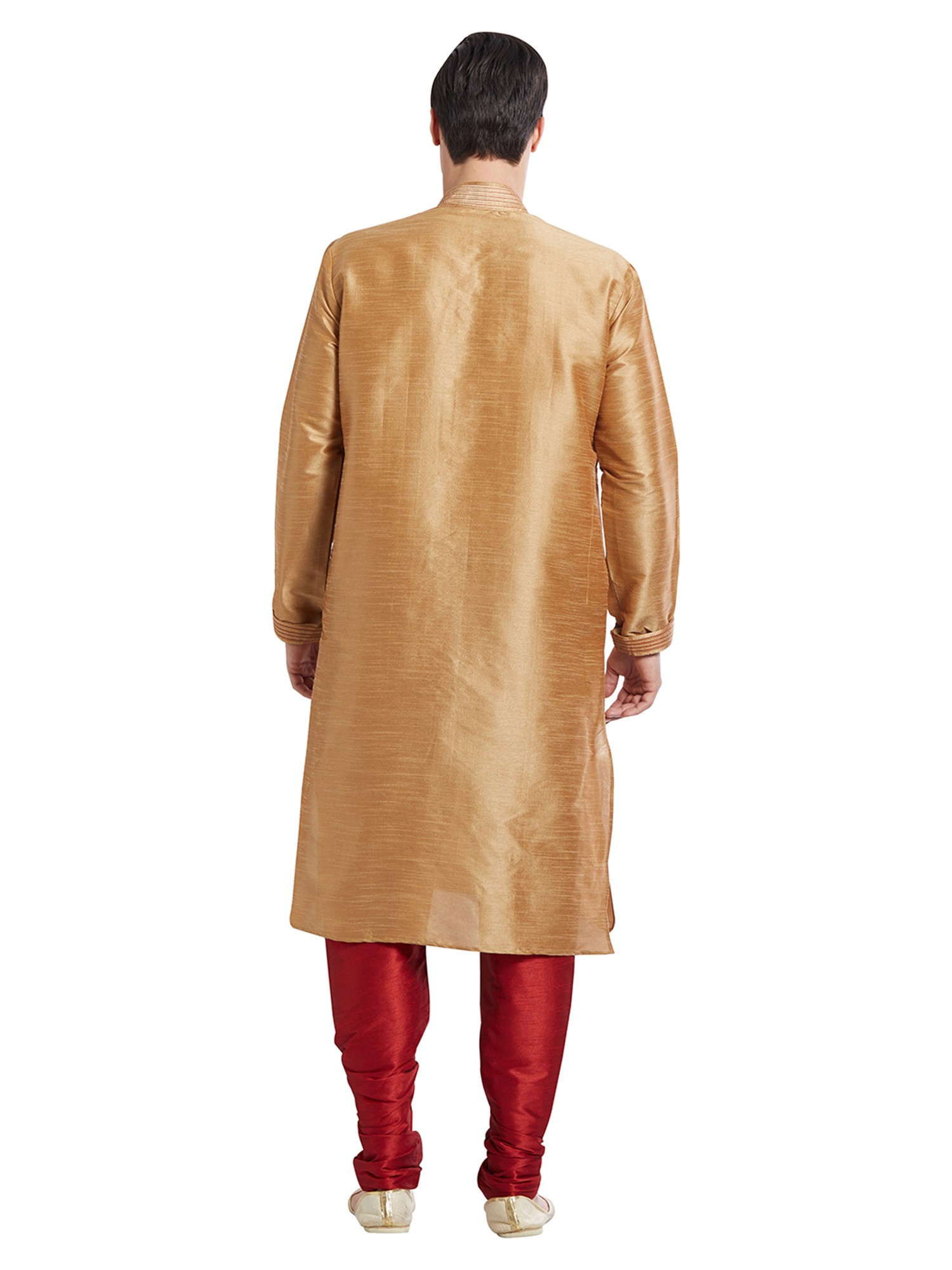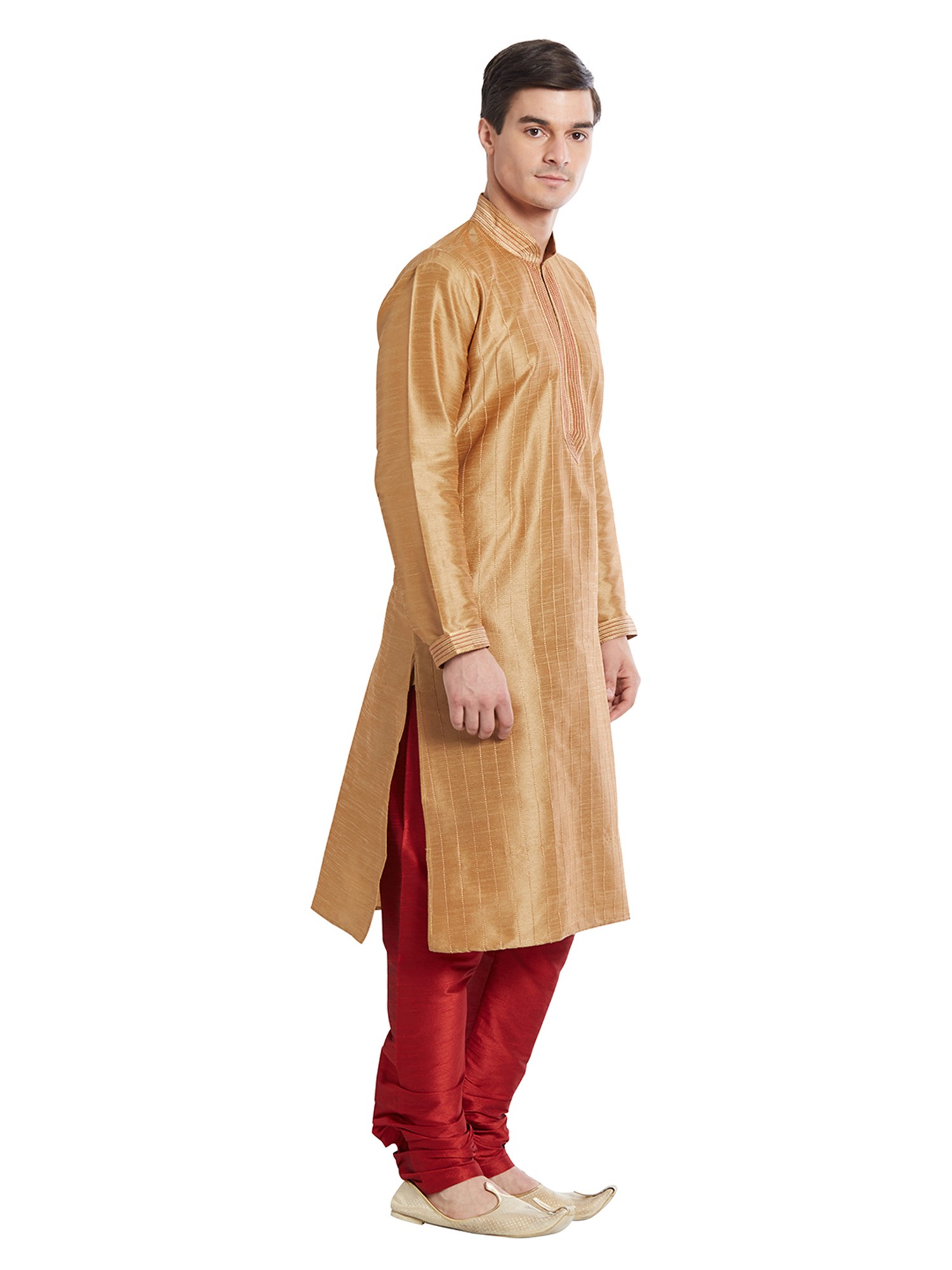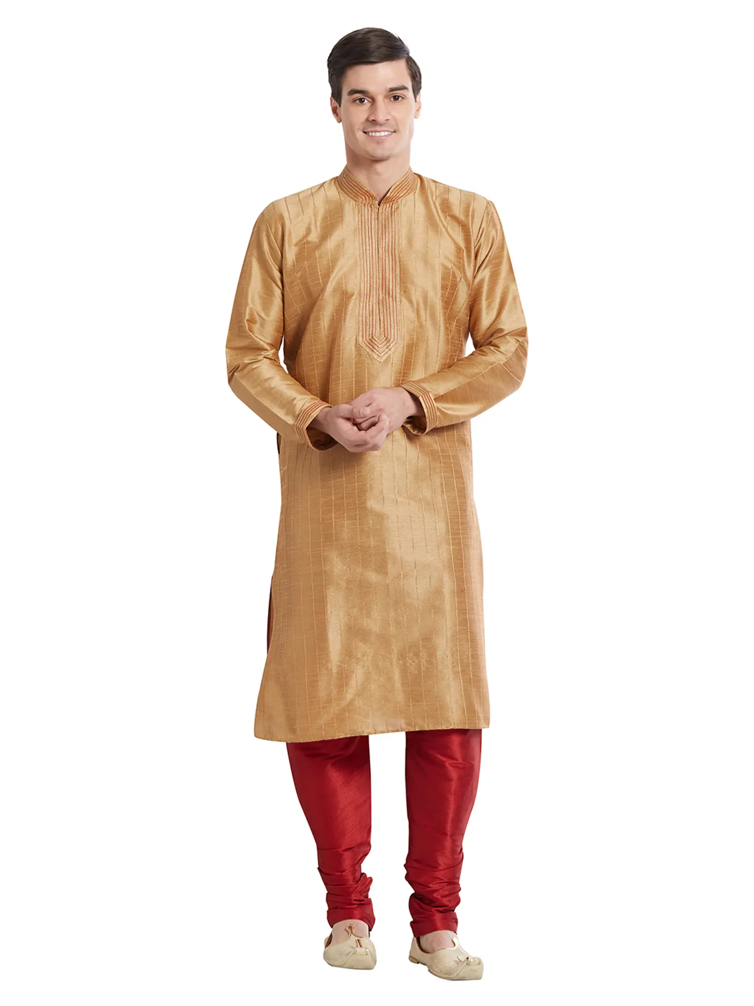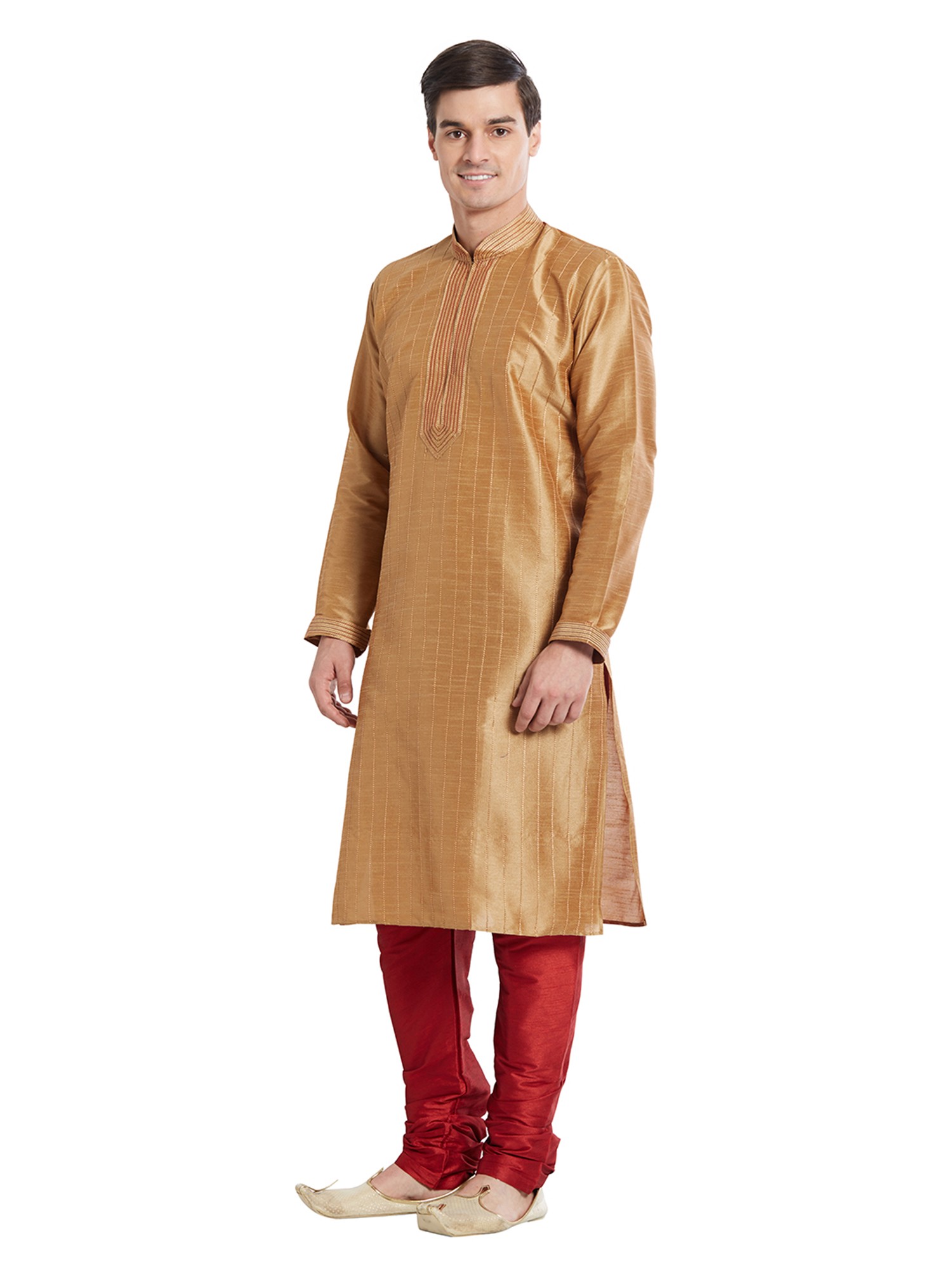 The rich, warm hue of the art silk is perfectly complemented by the subtle, tonal vertical weaving, creating a visual depth that is both understated and captivating. The classic mandarin collar, a hallmark of traditional Indian attire, is enhanced with delicate embroidery, hinting at the artistry within. This design ensures a flattering fit and a distinguished appearance, making it a truly remarkable piece.