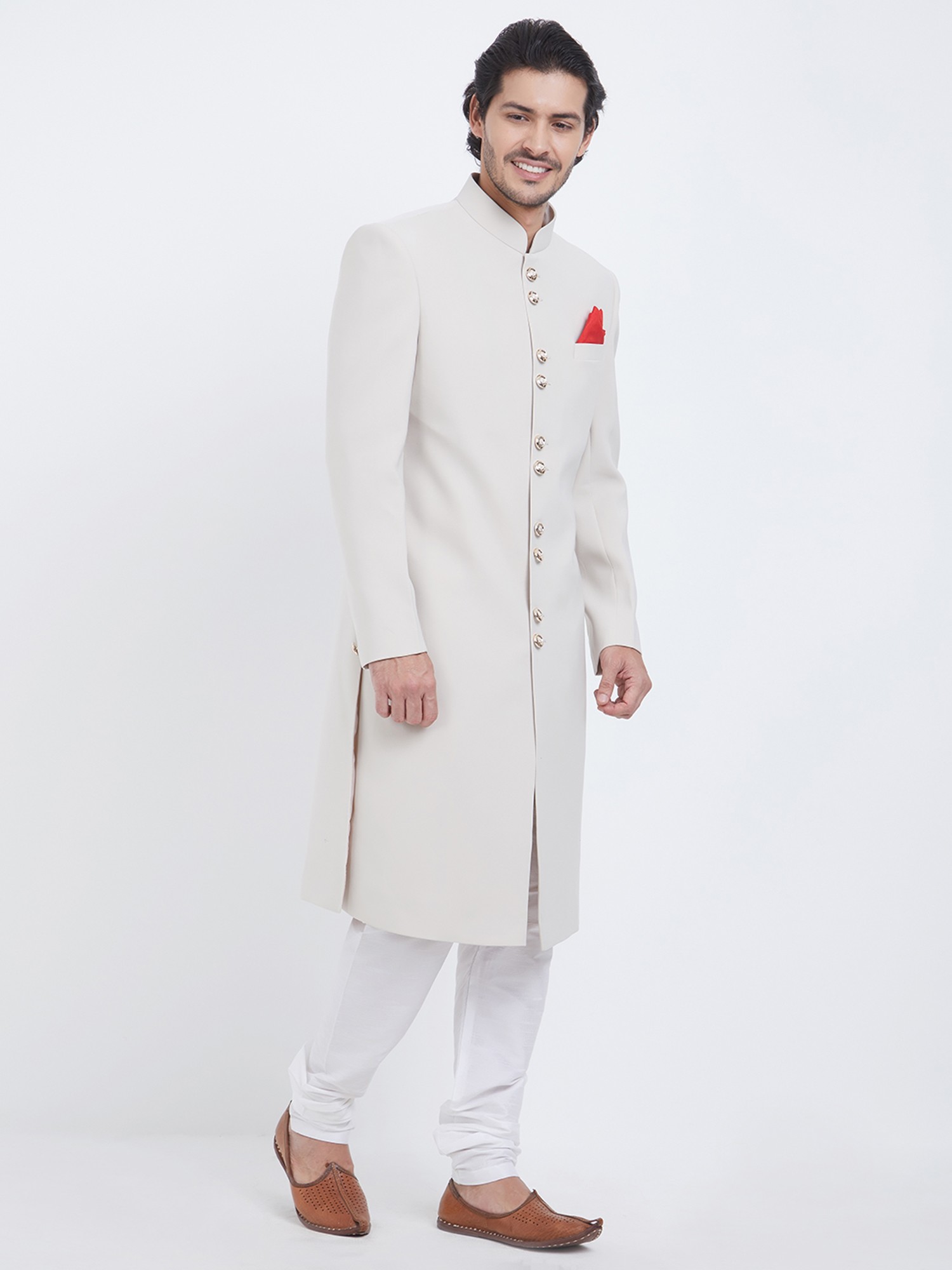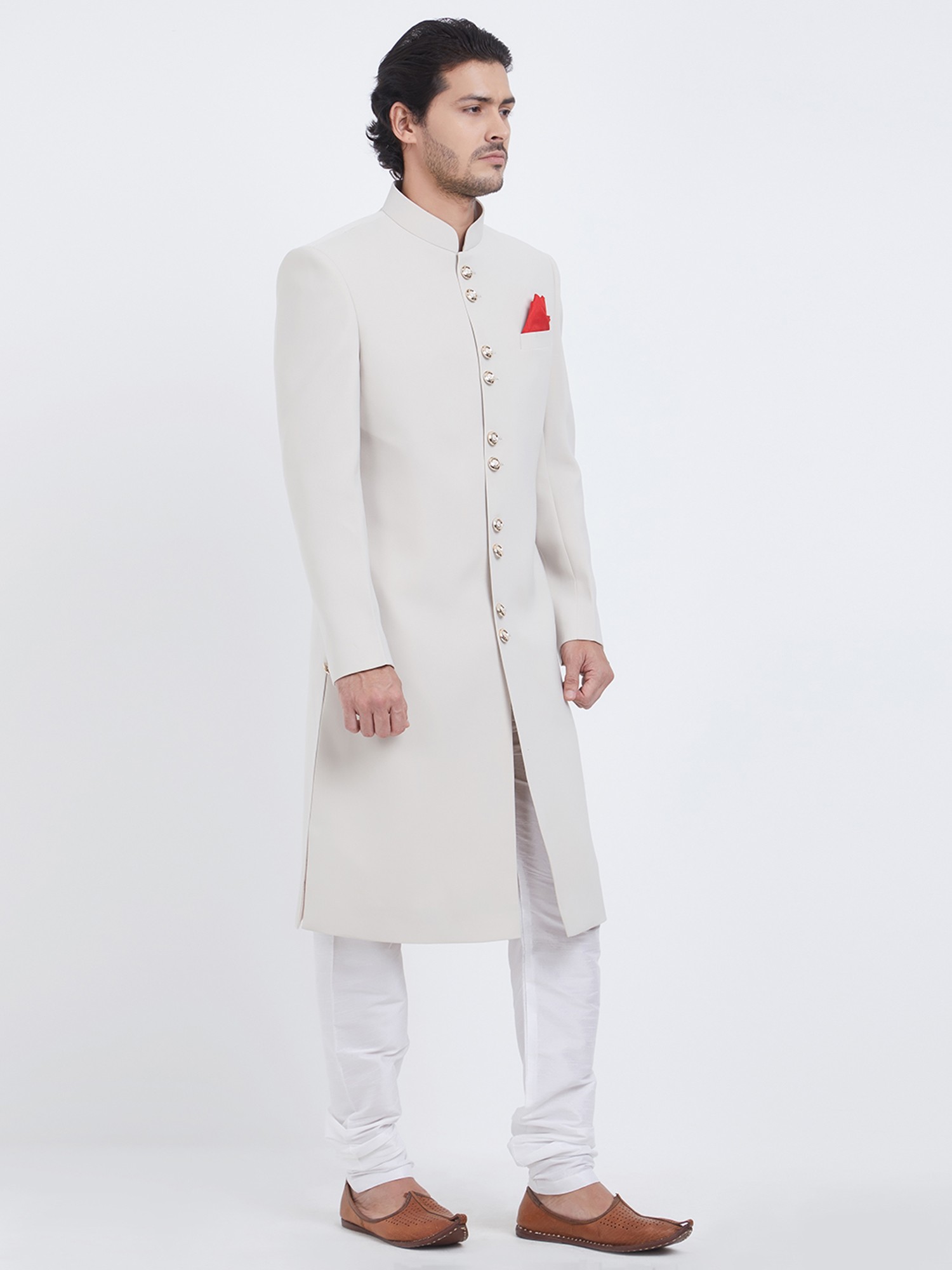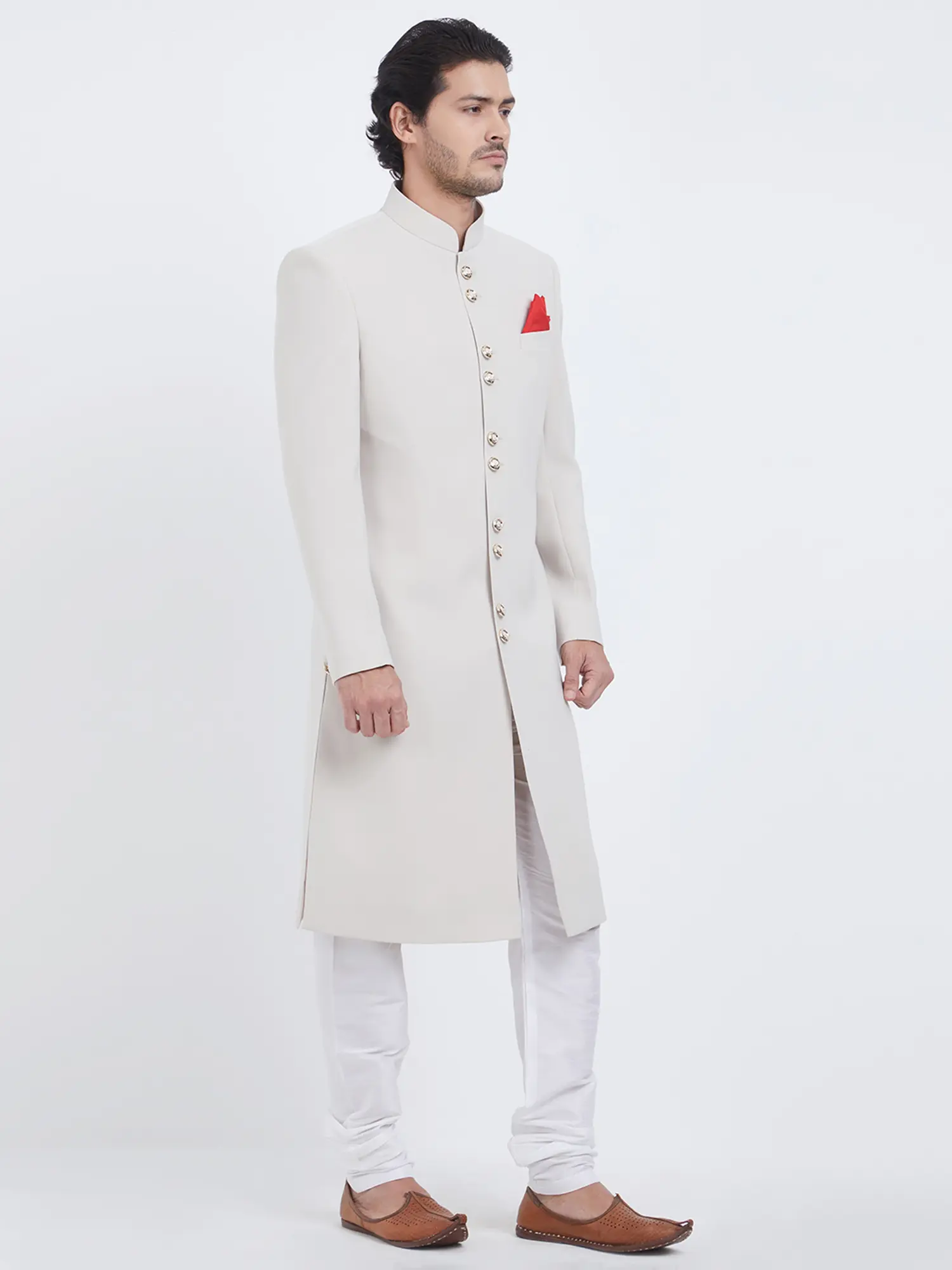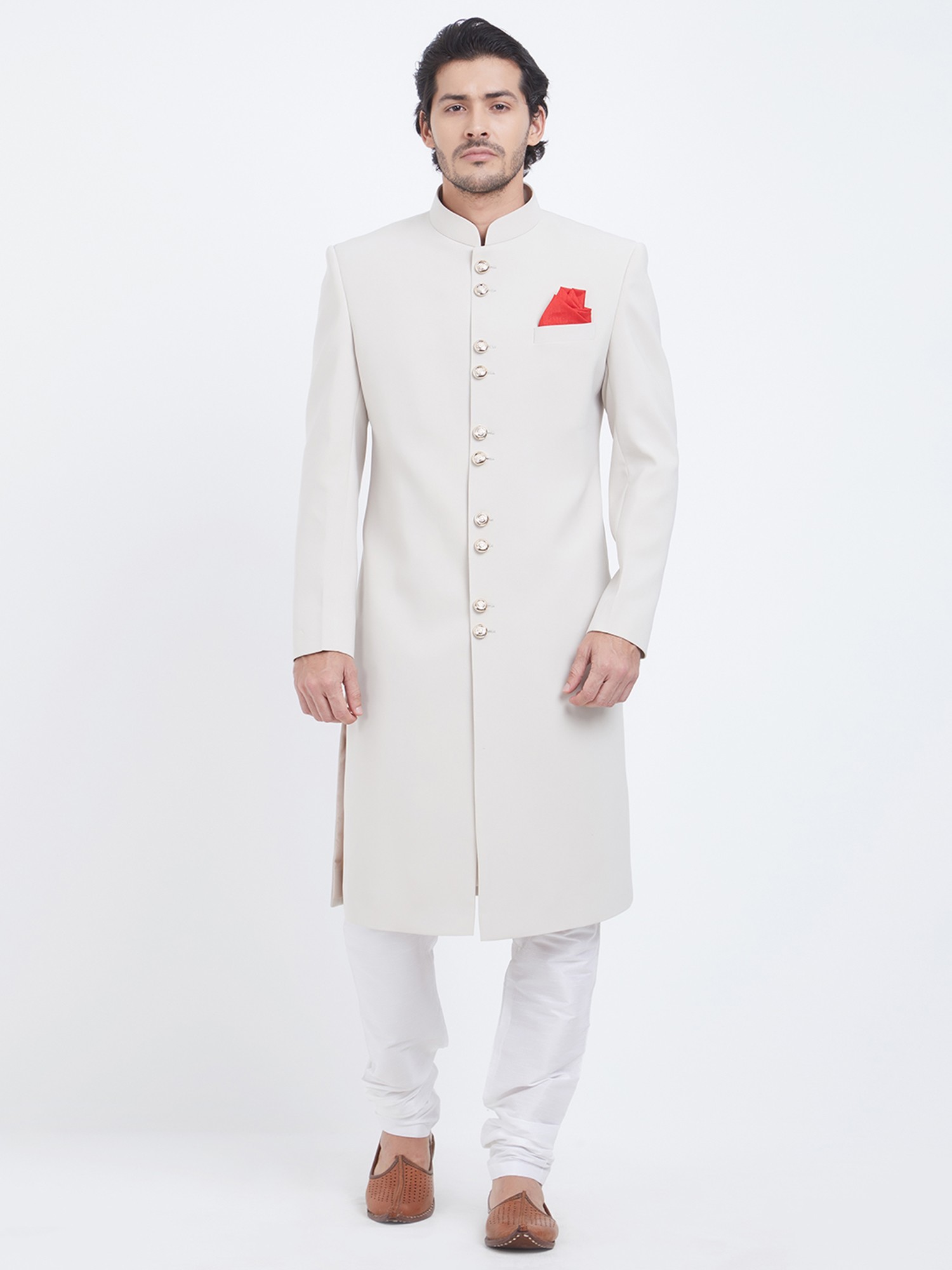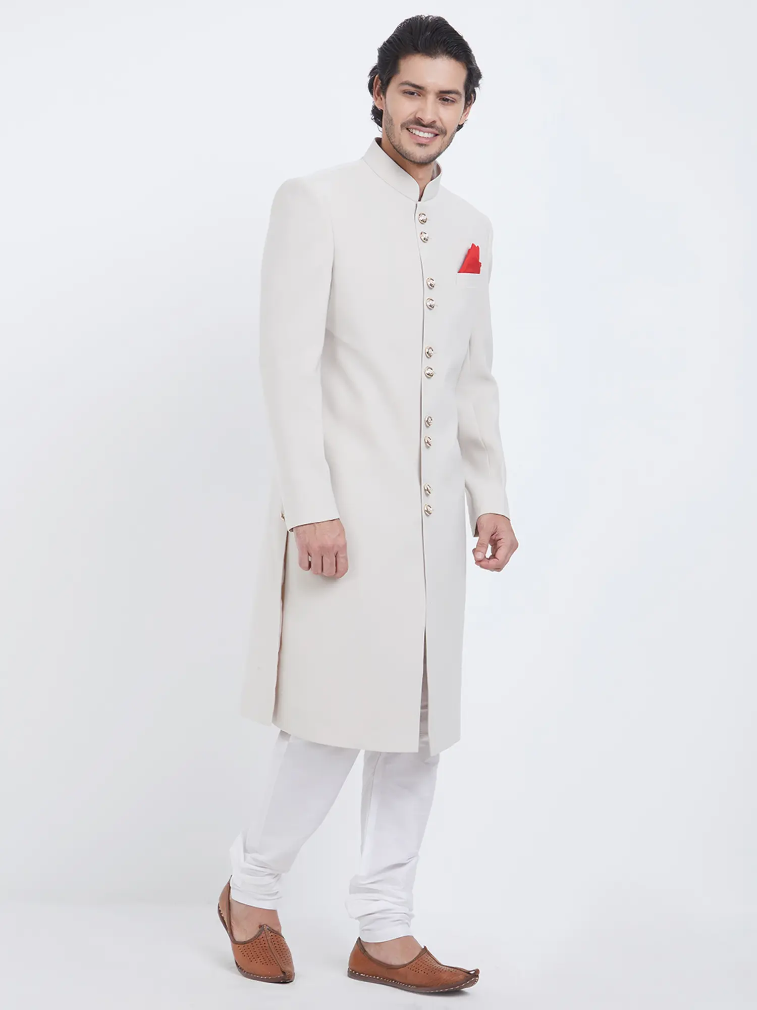 Features a sophisticated plain Navabi Sherwani design.