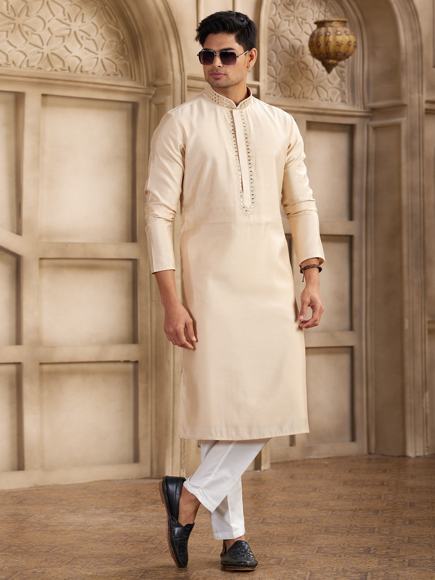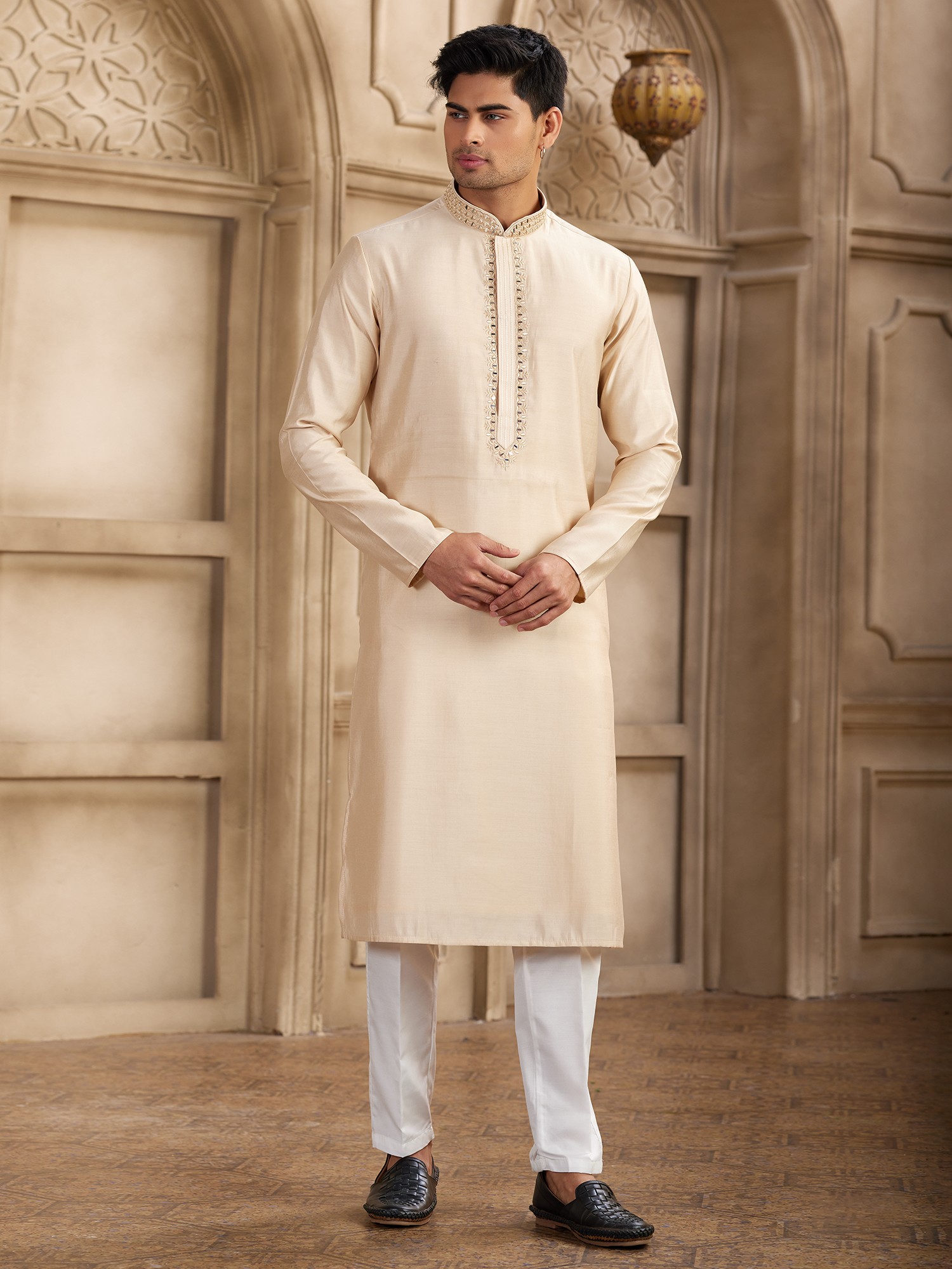 Plain Wedding Kurta Pajama with Embroidery on Neck