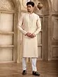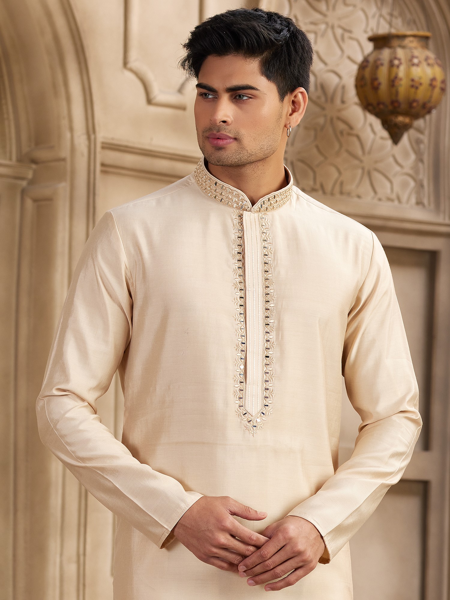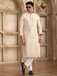 This kurta pajama set offers unparalleled versatility, making it a staple in any discerning gentleman's wardrobe. The neutral tone of the Banarasi Art Silk makes it easy to pair with a variety of accessories. Consider adding a richly embroidered shawl or a sophisticated jutti to complete your ensemble. For a more formal look, a structured jacket can add an extra layer of elegance. This outfit is designed to be timeless, ensuring you make a lasting impression at every event. Embrace tradition with a touch of modern flair and command attention with this exceptional kurta pajama set.