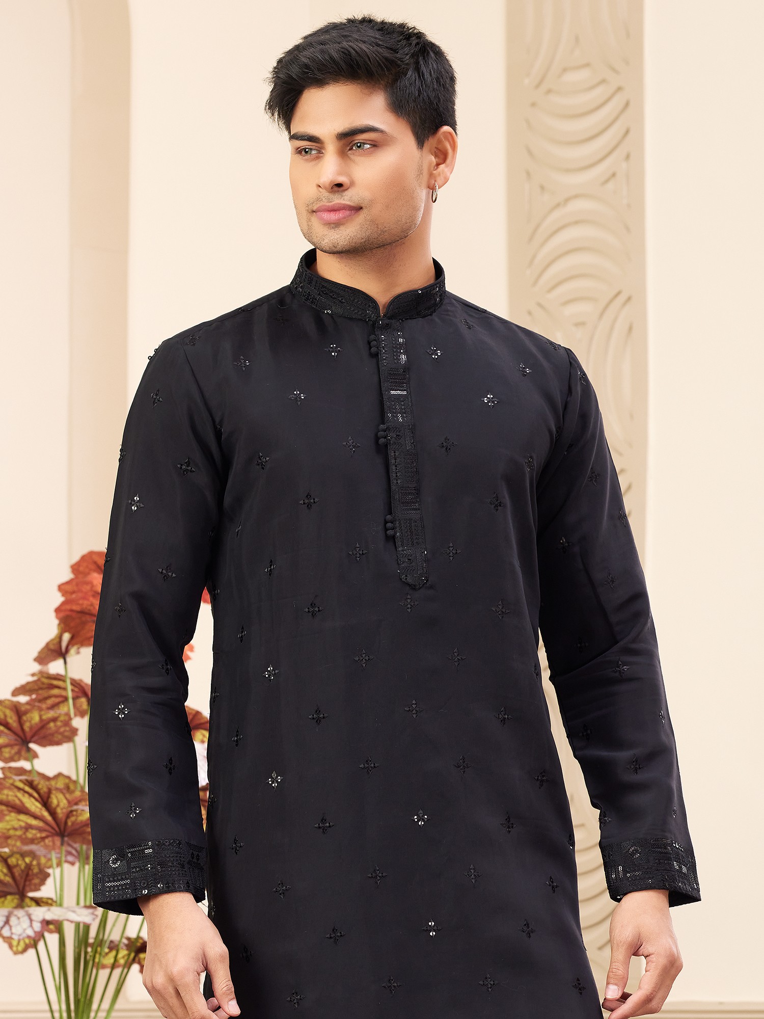 Black-Beauty Pathani Kurta with Matching Pajama and Stripe Weave