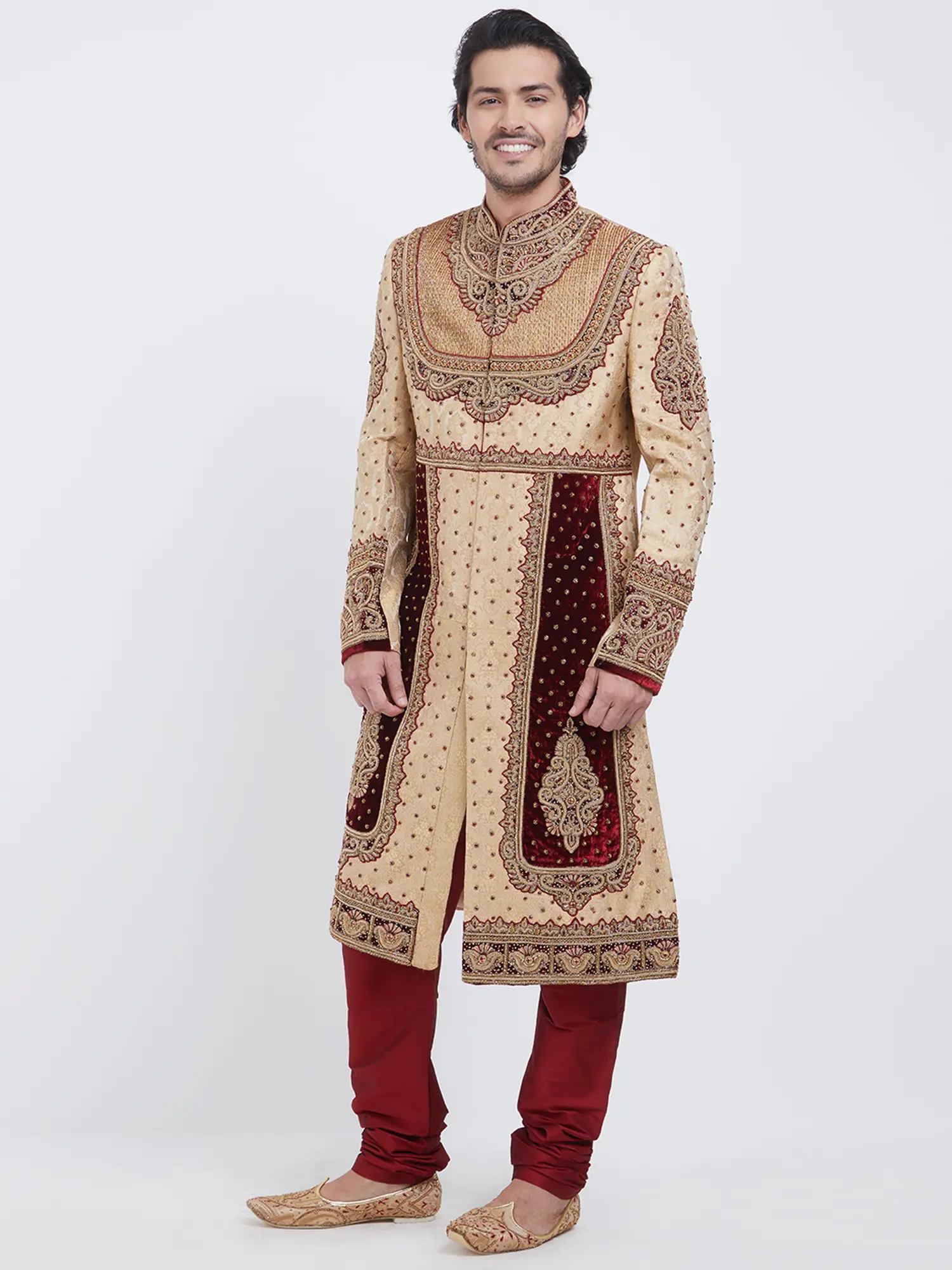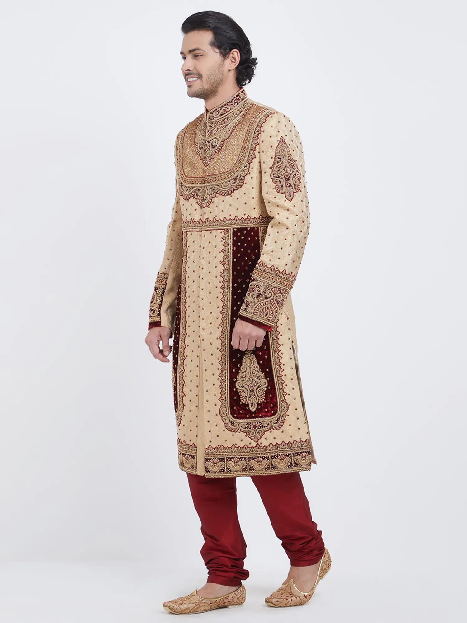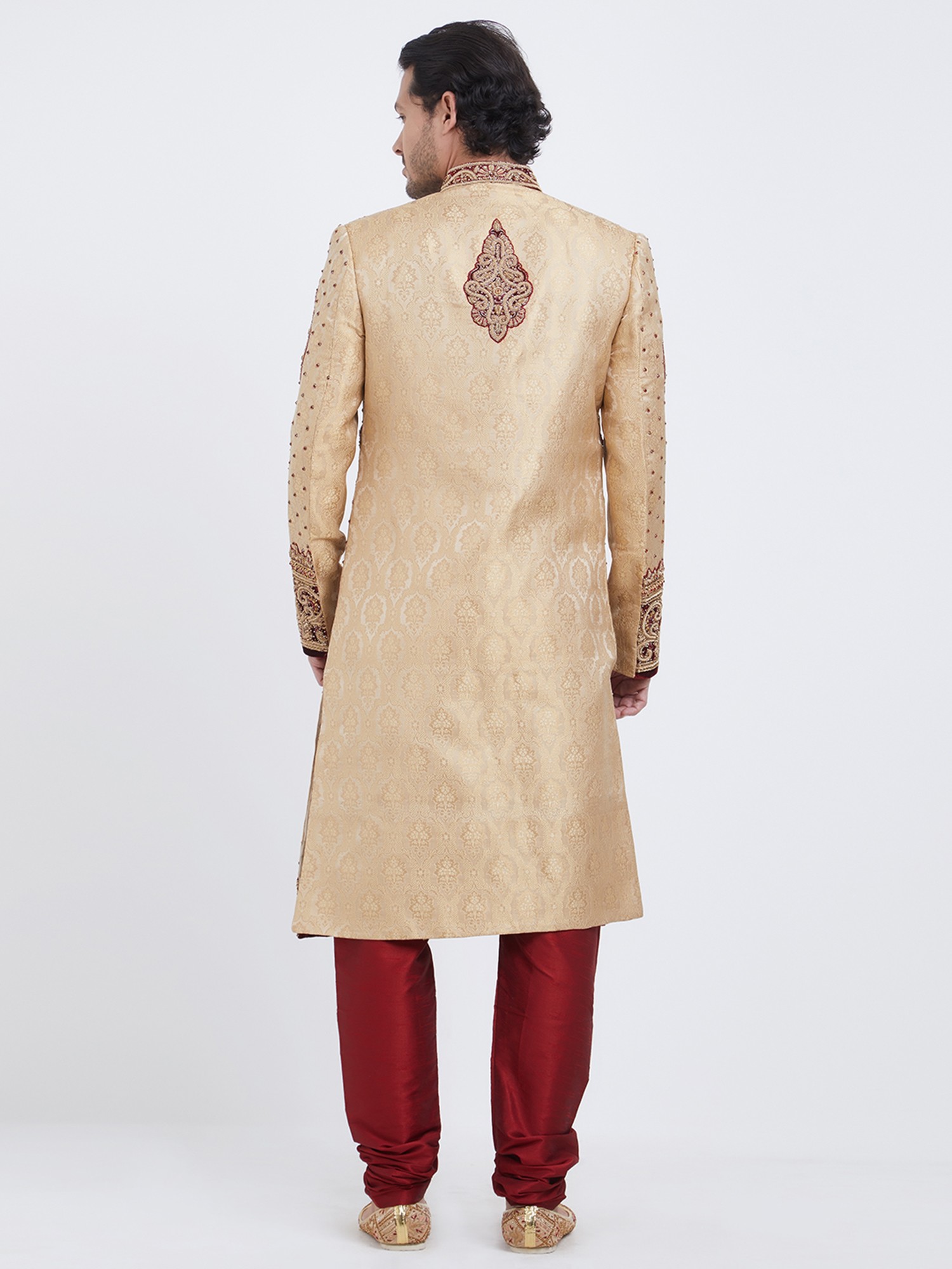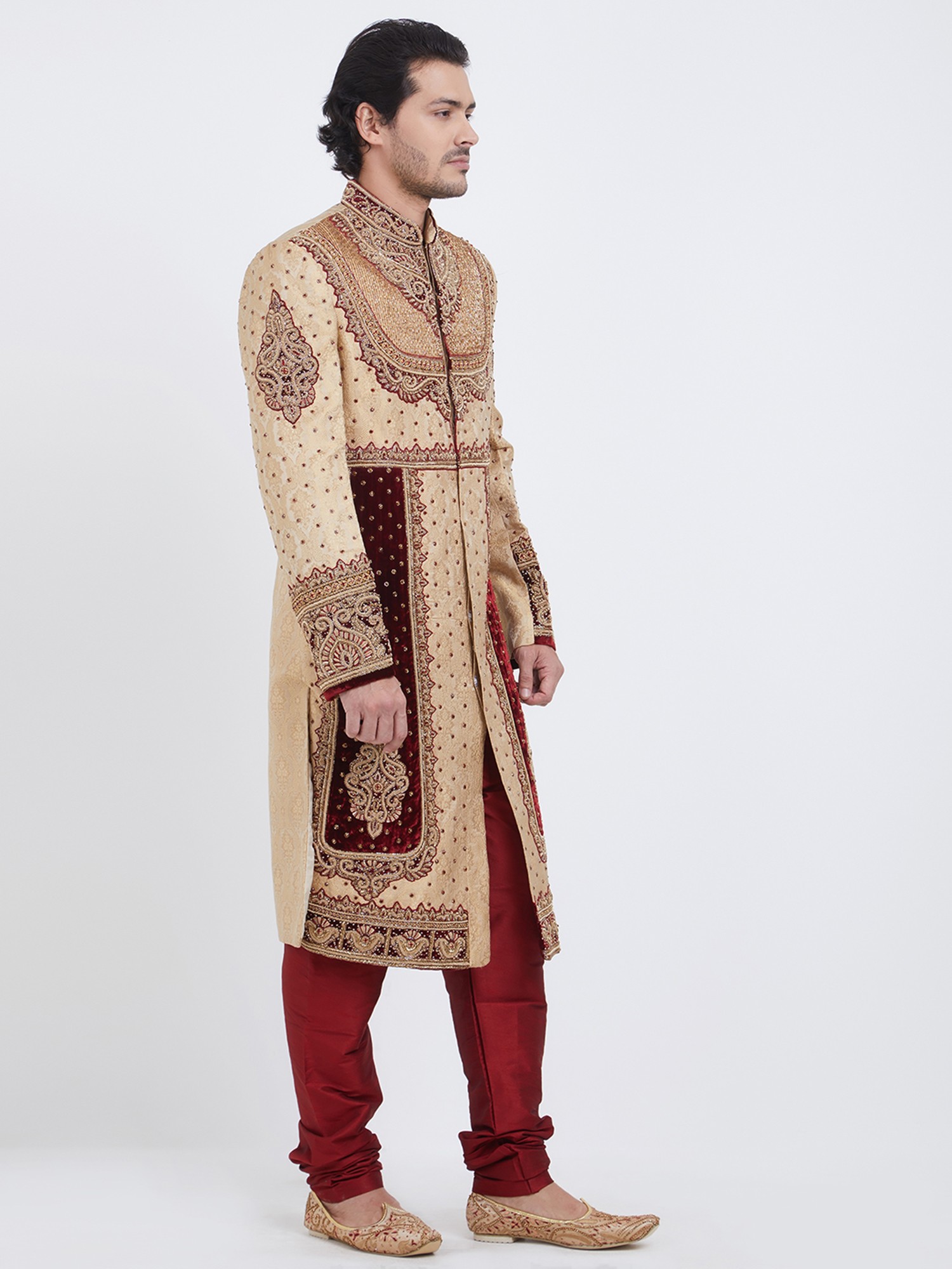 Intricate hand embroidery adorns the sherwani, showcasing detailed craftsmanship.