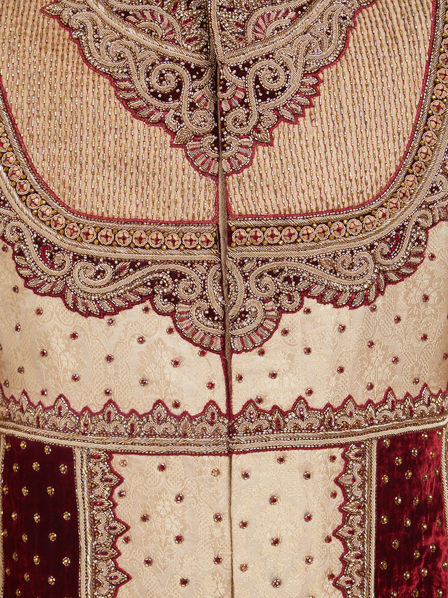 Observe the opulent detailing that elevates this creation to a work of art. The intricate embroidery, a symphony of rich threads and embellishments, flows gracefully across the rich brocade. Contrasting panels of plush velvet add depth and texture, while the structured silhouette ensures a commanding and elegant drape. It presents a visually stunning composition, designed to command attention with its sophisticated charm.