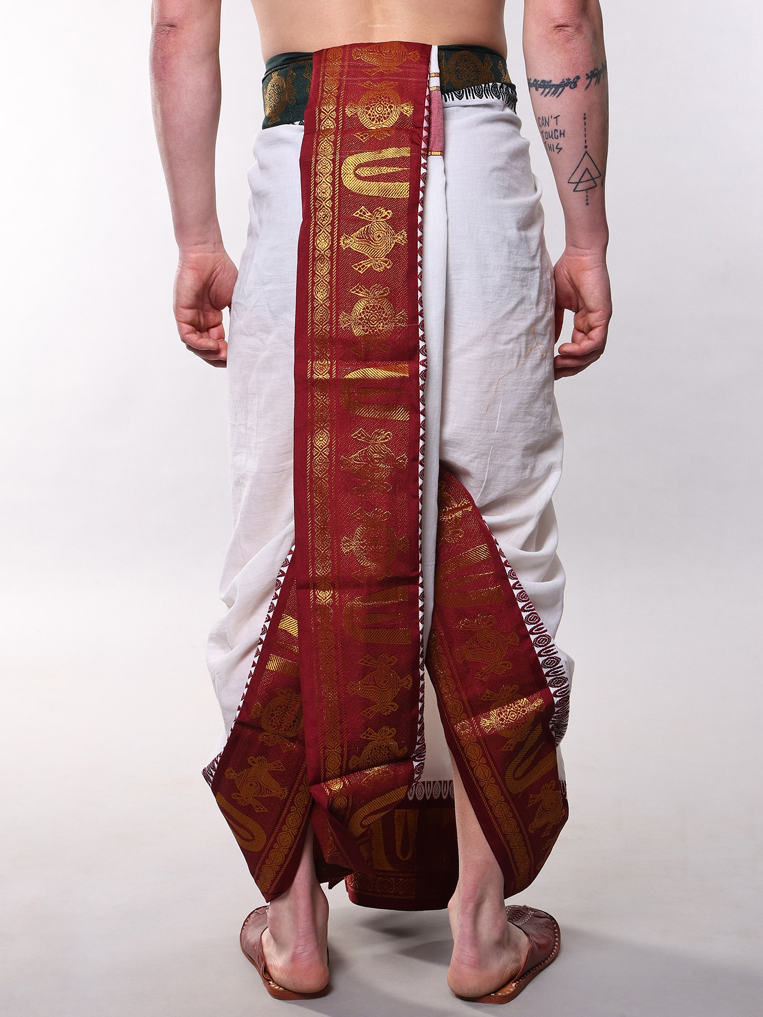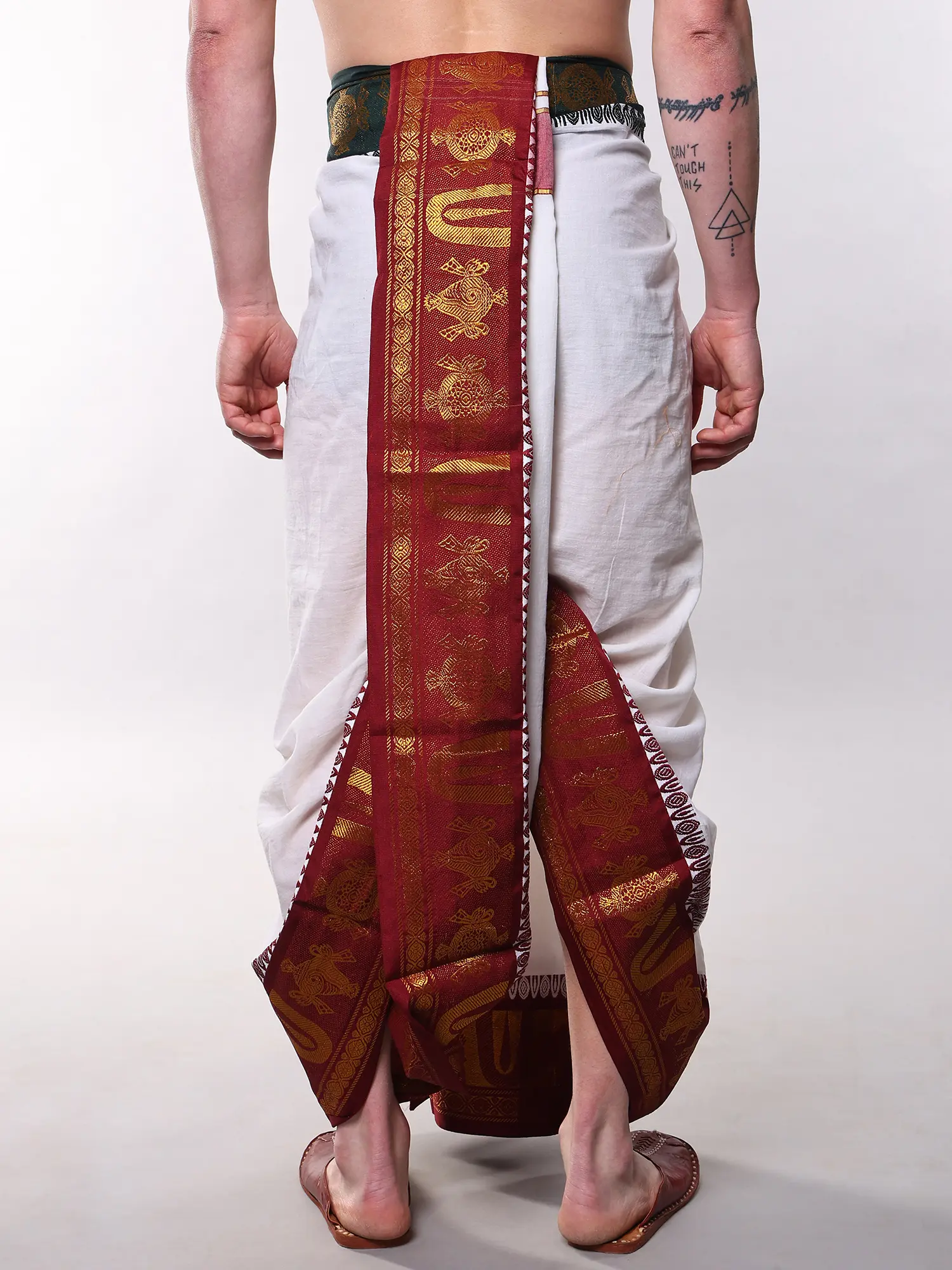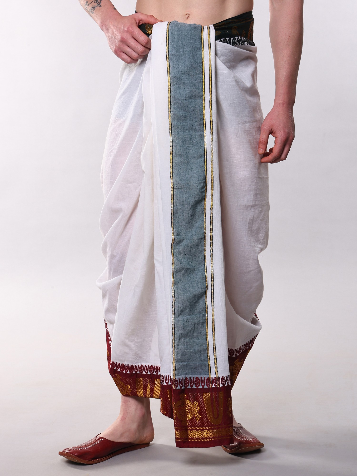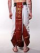 This particular style of dhoti is steeped in the rich cultural tapestry of India, particularly within spiritual and ceremonial contexts. It represents a sartorial tradition that has been passed down through generations, embodying purity, devotion, and respect. Wearing it connects you to a lineage of cultural practice and a philosophy of mindful living.